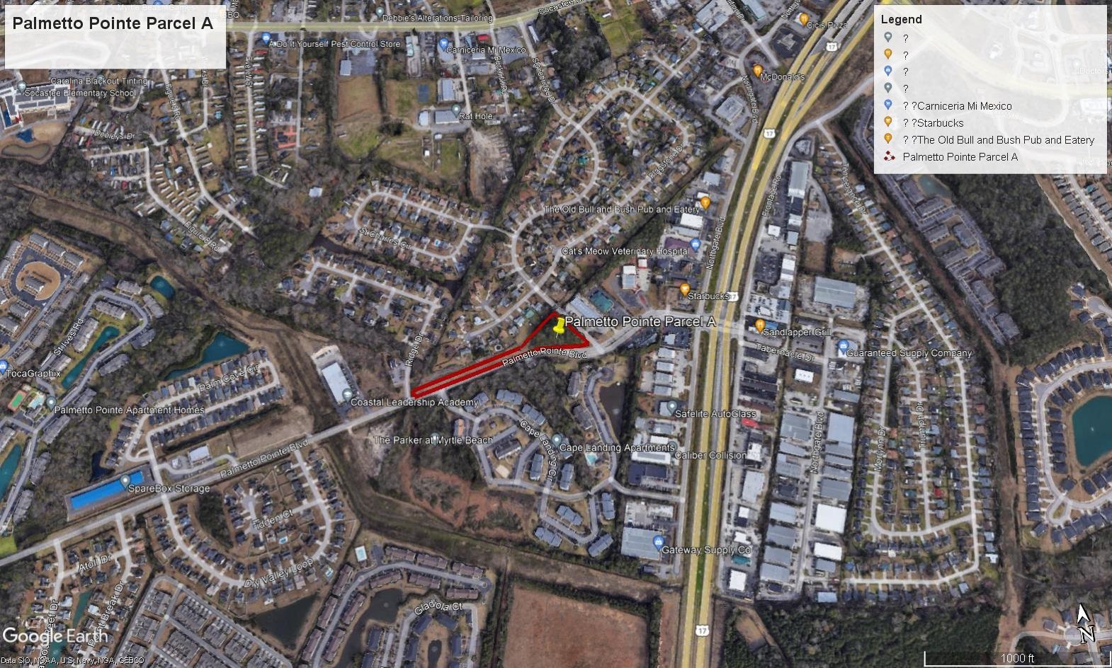 Palmetto Point Blvd. road was extended to Highway 544 and the big block area. Traffic Count is 9,500 along Palmetto Point Blvd (2023). Just down from Market Common. About a 100 yards from Highway Bypass 17 and a couple miles from SayeBrooke Shopping Center (Target, Pet Smart, Marshall's, etc). It is zoned as Office, Professional and Institution. Great corner acreage in b/n two roads which heads to several developments (Stone Bridge). Great visibility to all traffic along Palmetto Pointe Blvd. Starbucks just around the corner along with Caliber Collision, Safelite Autoglass, The Old Bull and Bush pub eatery, etc.