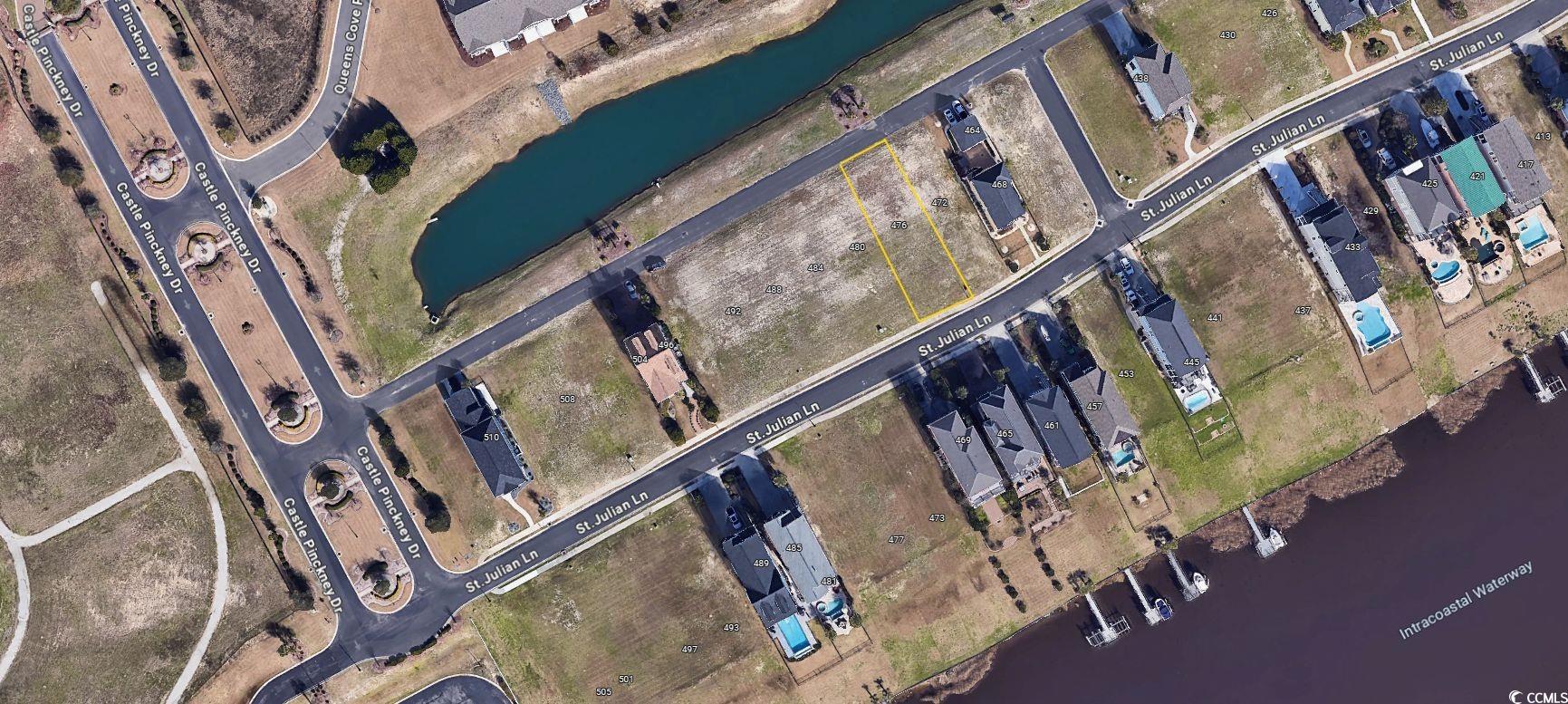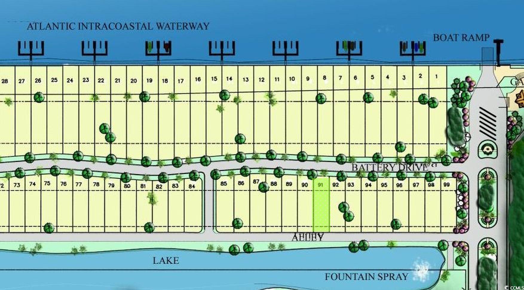 From the intersection of Carolina Forest Blvd and River Oaks Drive, go south on River Oaks under the Hwy 31 overpass. Immediately turn left onto the frontage road and continue 1.2 miles under the Grissom Pkwy bridge to The Battery on the Waterway entrance gate. After entry, take your 3rd left onto St. Julian Lane. See attached map for exact location of lot 91, which will be on your left. Look for the painted number 91 on the curb and the lot stakes on either side.Courtesy of Price & Company Realty Inc.