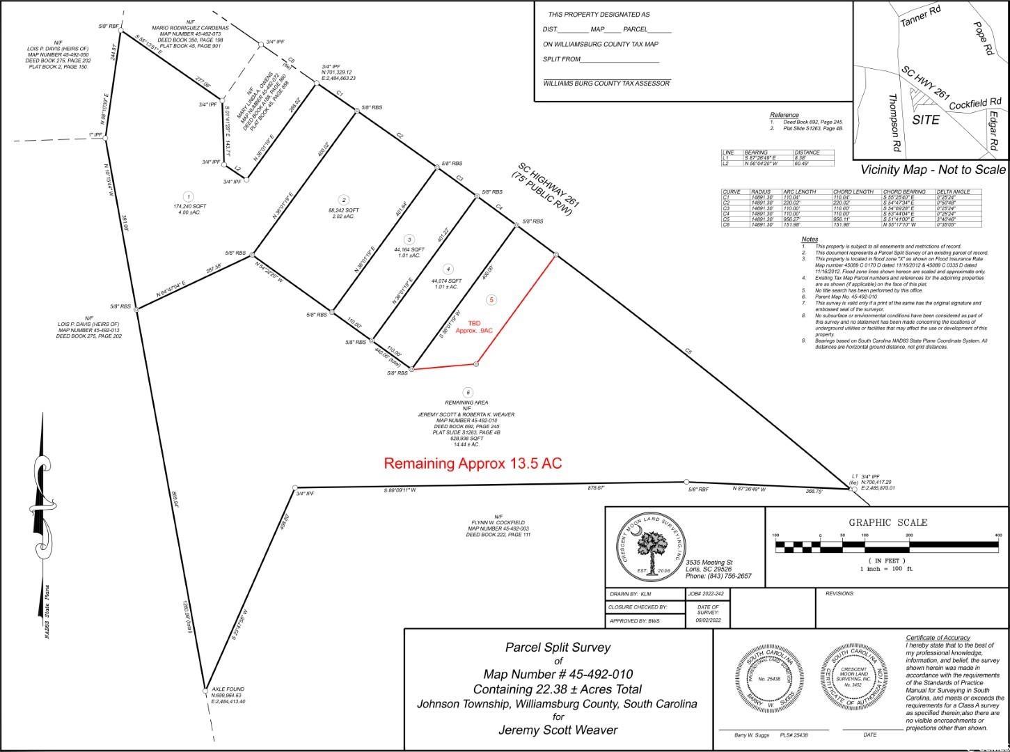 This is a blank slate of approximately 13.5 acres. There are several hundred feet of road frontage on SC 261 and a stone driveway with a gate into the property. In the cleared area, there was once a home on the property, and the well and septic system are still in place. Public water from the town of Hemingway is available at the street (same side of the road). Electric is currently ran to the property. In the back of the property, there is a cleared area in the woods for hunting and a small bridge to access it. There is no zoning in the county so you can do with it, whatever you choose! Looking for a place for your RV? This is a great location for it and there is a 50 amp rv service already set up. RV's can be set up here for 6 months at a time, unlike 30 days in other local areas.