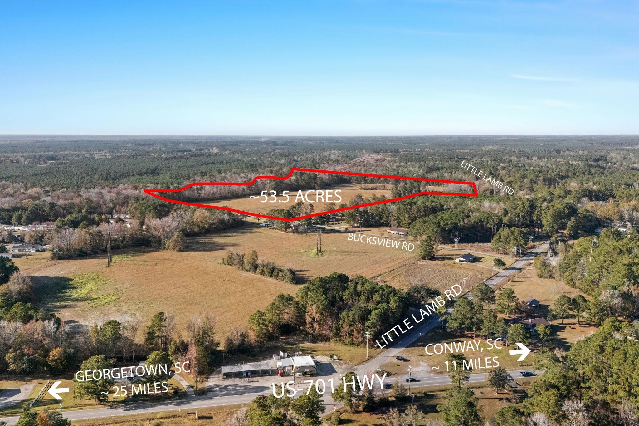 Find your way home. Country living at its finest. If you desire a simpler, more connected, healthy and sustainable life, through homesteading activities like being able to source your own food and spending more time with loved ones, look no further. This nice, size tract located just a short distance to local Bucksport Marina and other public boat landings. Venture off on your boat to a day trip anywhere from North Carolina to Charleston on Intracoastal waterway. Its strategic location, just 11 miles from downtown Conway and 25 miles from the historic town of Georgetown located between HWY 701S and Old Bucksport Road, positions it for significant potential projects. Escape to this beautiful about 54 acres cleared and wooded property, perfect for your dream home or a private retreat. Located just outside the city limits, this land offers a rare opportunity for tranquility, recreation and hunting. The property's location provides the perfect blend of seclusion and convenience, with city amenities just a short drive away. This land is perfect for those seeking a peaceful escape with the potential for both residential and recreational use. Public water and sewer is available through Grand Strand water and sewer.