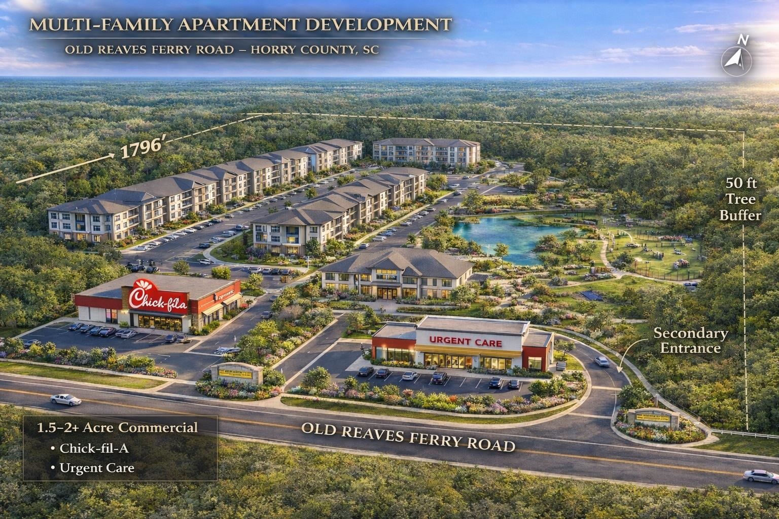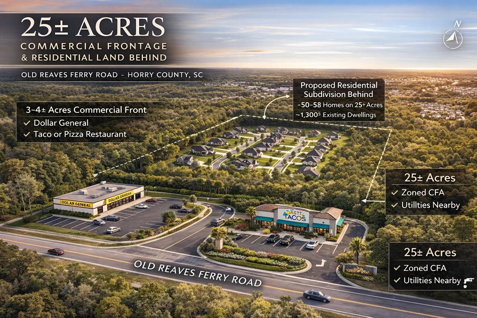 25 acres with approximately 387 feet of road frontage on Old Reaves Ferry Road in one of Horry Countys emerging growth corridors. This strategically located tract sits within minutes of a newly opened charter school and approximately five national builder communities developed within the past few years, creating a rapidly expanding residential base in what has traditionally been a rural setting. The surrounding area is transitioning from large-lot rural to organized subdivision growth, presenting a prime opportunity for forward-thinking investors and developers. With over 1,700 feet of depth and approximately 2,100 feet along the opposite boundary, the parcel offers flexibility for multiple development concepts including: Multifamily apartment community (garden-style or 4-story construction) Mixed-use development with commercial frontage and residential behind Townhome or single-family residential subdivision Commercial pads along frontage (medical, QSR, daycare, coffee drive-thru) The 387 feet of frontage allows for potential dual access points (subject to county approval), making it suitable for a high-visibility commercial anchor such as urgent care, quick-service restaurant, or neighborhood retail supporting the growing population base. The surrounding wooded parcels and natural tree buffers provide privacy and design flexibility, allowing for thoughtful integration of amenities such as community green space, dog park, walking trails, or resort-style features in a residential or multifamily configuration. With the continued expansion of national homebuilders nearby and increased demand driven by new school infrastructure, this corridor is positioned for continued residential and supporting retail growth. Whether developed as a standalone residential project or as a mixed-use node combining commercial frontage with higher-density housing, this site offers scale, frontage, and location advantages rarely found in this stage of growth. A rare opportunity to secure a sizable tract in the path of development. The site is surrounded by multiple established and growing residential communities totaling approximately 1,300+ existing dwellings along this corridor, demonstrating strong housing demand and proven market absorption. Predominantly wooded, the parcel offers the ability to preserve natural buffers while creating a private, well-positioned development. Opportunities of this scale with nearby utility access in a proven growth area are increasingly limited.