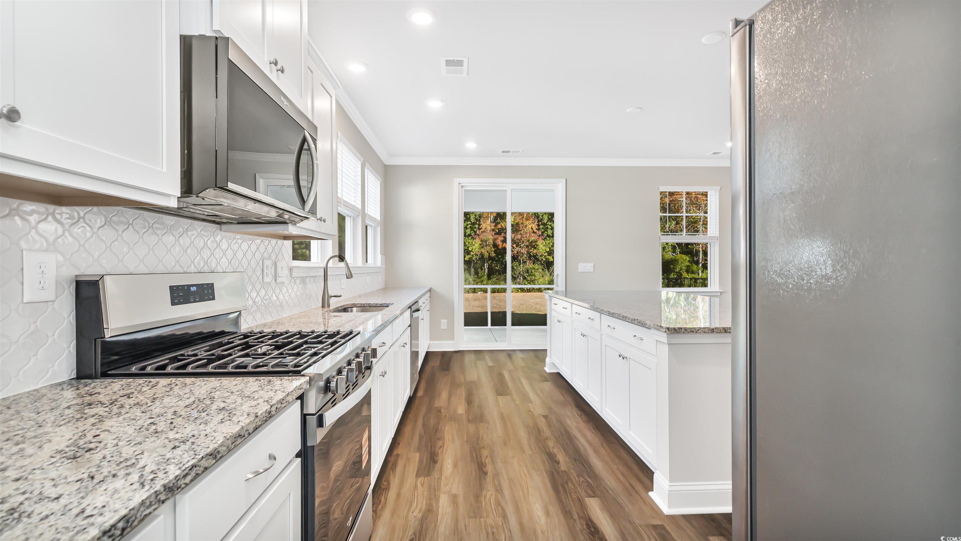 Step into a world of refined living in Waterbridge at Carolina Forest, where luxury meets convenience. This prestigious gated community offers world-class amenities, including an expansive clubhouse, sparkling poolsfeaturing the largest residential pool in South Carolina with a swim-up bar and firepitssand volleyball courts, pickleball and tennis courts, and a state-of-the-art fitness center. Spend your afternoons on the private community dock overlooking the tranquil lake or take advantage of the boat ramp for a scenic ride. Welcome to this stunning, brand-new 5-bedroom, 3-bath home showcasing elegant tray ceilings throughout. As you enter, youre greeted by a dramatic two-story foyer with a catwalk that overlooks the entryway. At the heart of the home is an oversized modern kitchen with stainless steel appliances and one of the largest islands youll findstretching nearly 10 feet and topped with beautiful quartz countertops. The first floor also offers a versatile bedroom perfect for guests or a home office, along with a full bathroom. Upstairs, the primary suite features a spacious walk-in closet and an ensuite bathroom complete with a tiled shower, linen closet, and generous double vanity. Two additional bedrooms share a full bath across the catwalk. One of the most appealing features of this home is the expansive bonus room over the garage, complete with a closet, making it an ideal fifth bedroom, media room, or flexible living space. End your days relaxing on the screened-in back porch, the perfect place to unwind and enjoy peaceful views of your surroundings.
