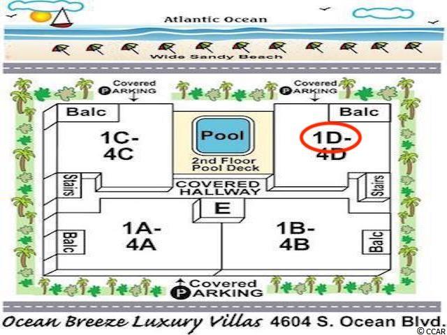 From Hwy 17, across from Barefoot Landing, turn onto 48th Ave. S. towards Ocean Blvd, it will go left unto Ocean Blvd at the corner where North Beach Plantation is. Then just on the left about a block down is Ocean Breeze Luxury Villas. Parking is underneath. Stairs or Elevator up the the 1st Floor. Unit 1-D.Courtesy of Realty One Group Dockside