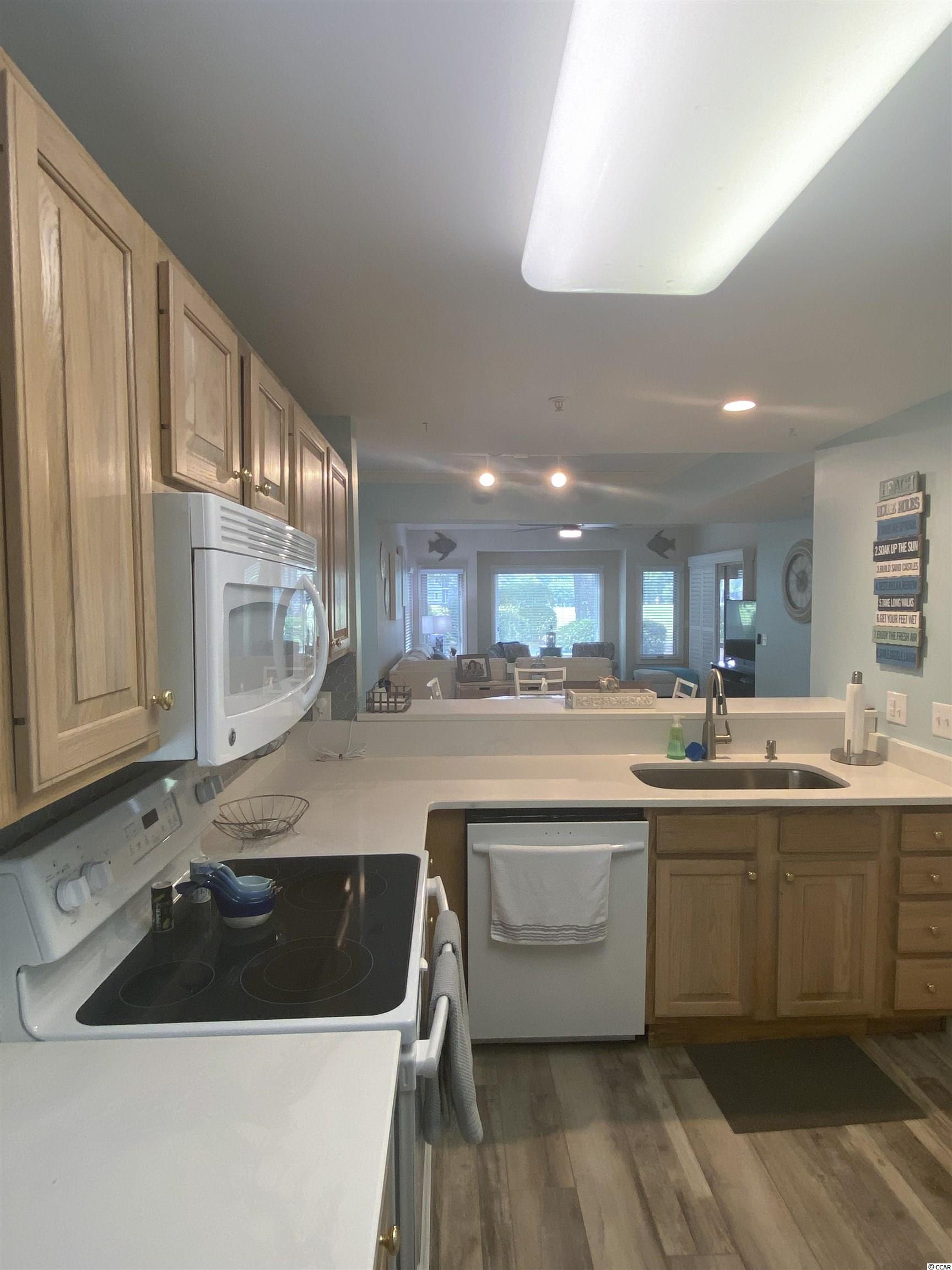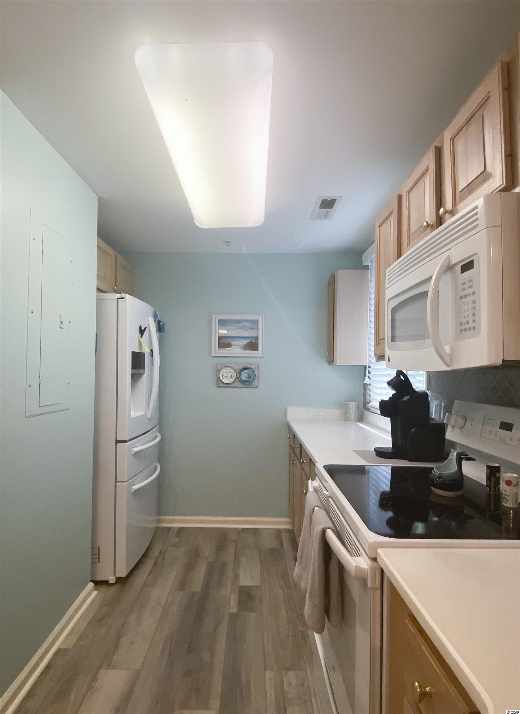 If you like the beach and golfing it's time to own the best of both worlds. This 3 bedroom 3 bath condo is located in the high desired gated community of Tidewater Plantation. This first floor end unit condo offers a great view of the practice range for Tidewater Golf Club from several rooms. As an owner in Tidewater. you have access to the private beach cabana just a few minutes away. This immaculate home has an open floor plan with two on-suite bathrooms including a large walk-in shower in the master. There is also dual entry to the screened in porch from either the master or living room and lots of closet space throughout. This unit has been upgraded several times in the past couple years and it keeps getting better. A New water heater in 2018, Upgraded laminate hardwood, new tile, brand New solid surface countertops with a large farmhouse sink, brand new light fixtures and carpet in the living room and bedrooms. Brand new washer and dryer and HVAC replaced this year as well. The Tidewater golf course community offers resort style pools, clubhouse, hard surface and clay surface tennis courts, 24 hours gated security and more. This is a hard to find unit and the only available in the development right now so act fast. Square footage is estimated. Buyers are responsible for verification of all information and documents.
