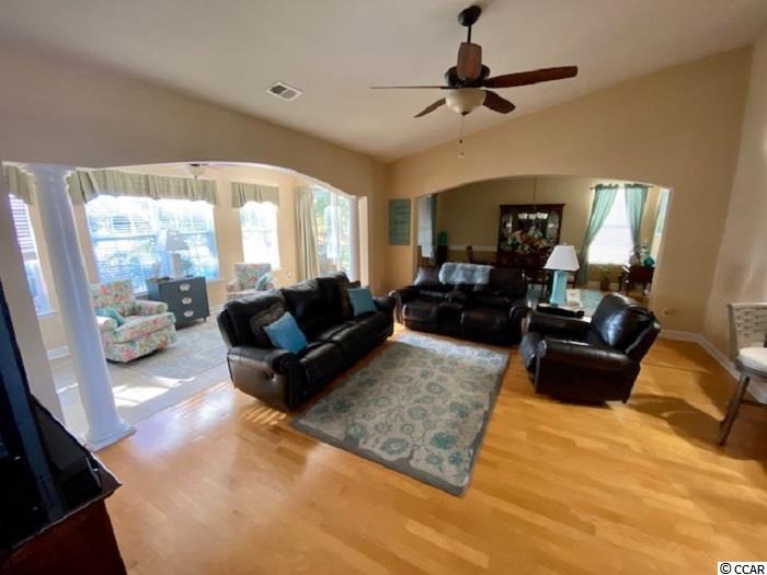 Check out this gorgeous 4 bedroom 3 and 1/2 bath home has two Master Suites and backyard views of the # 3 fairway of River Hills Golf Course. As you walk in notice the Beautiful hardwood floors extending thru the open living area and dining room. Walk thru the archway into the Carolina room with sliding doors leading to the screen porch. From there you will notice the outside pergola and oversize concrete patio. The kitchen is a chefs dream including ceramic tile floors, quartz counter tops, under counter lighting and upgraded stainless steel appliances. This home also features an irrigation system, security system, central vac, and hurricane film on the windows plus much more. New hvac unit. Don't miss out on this one. It wont last long!!!