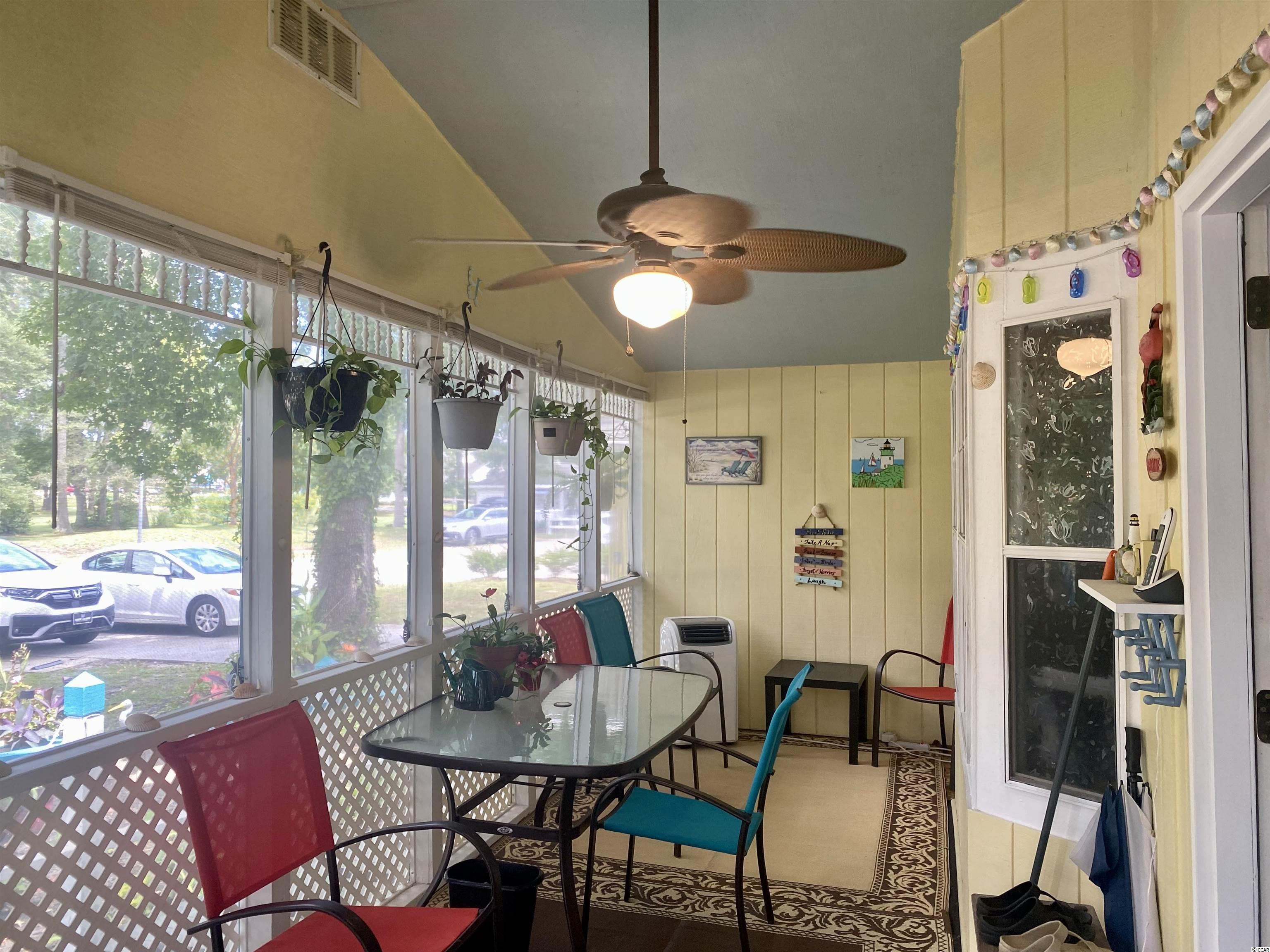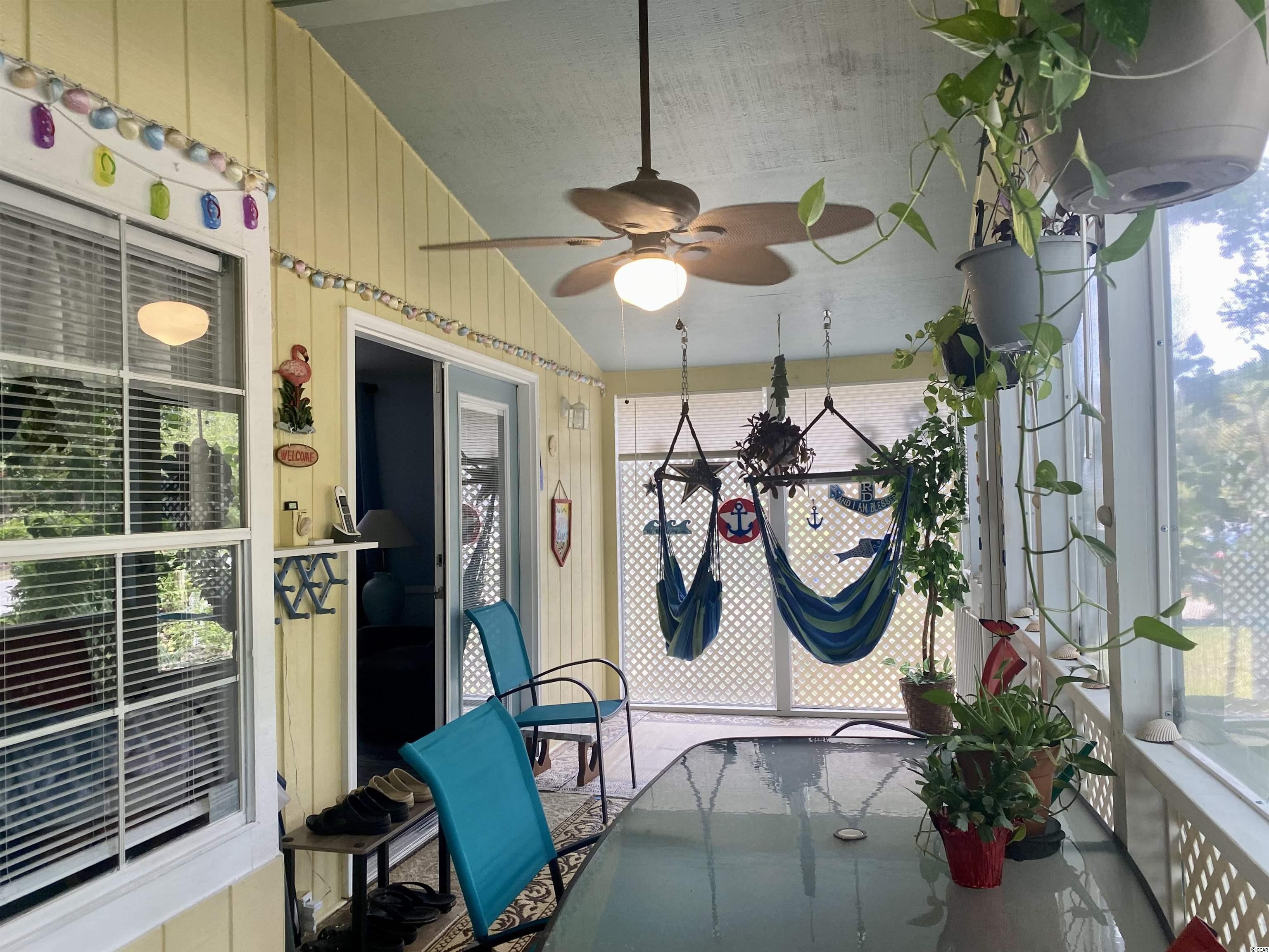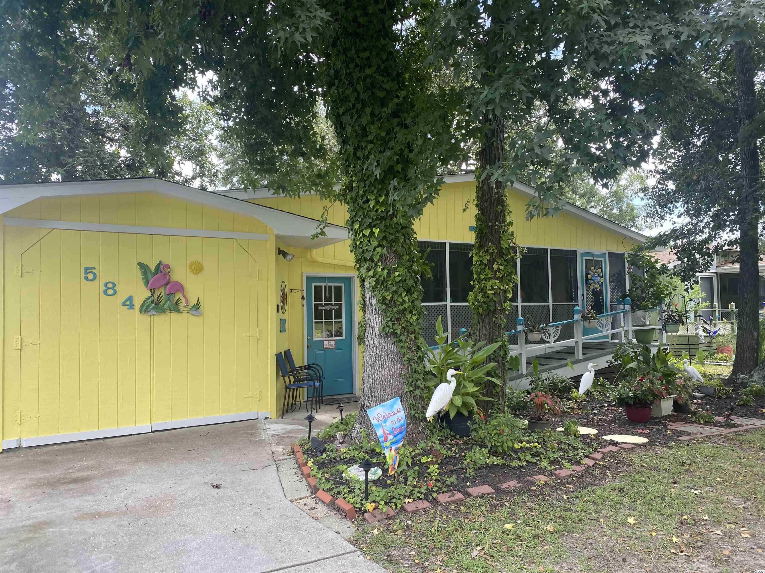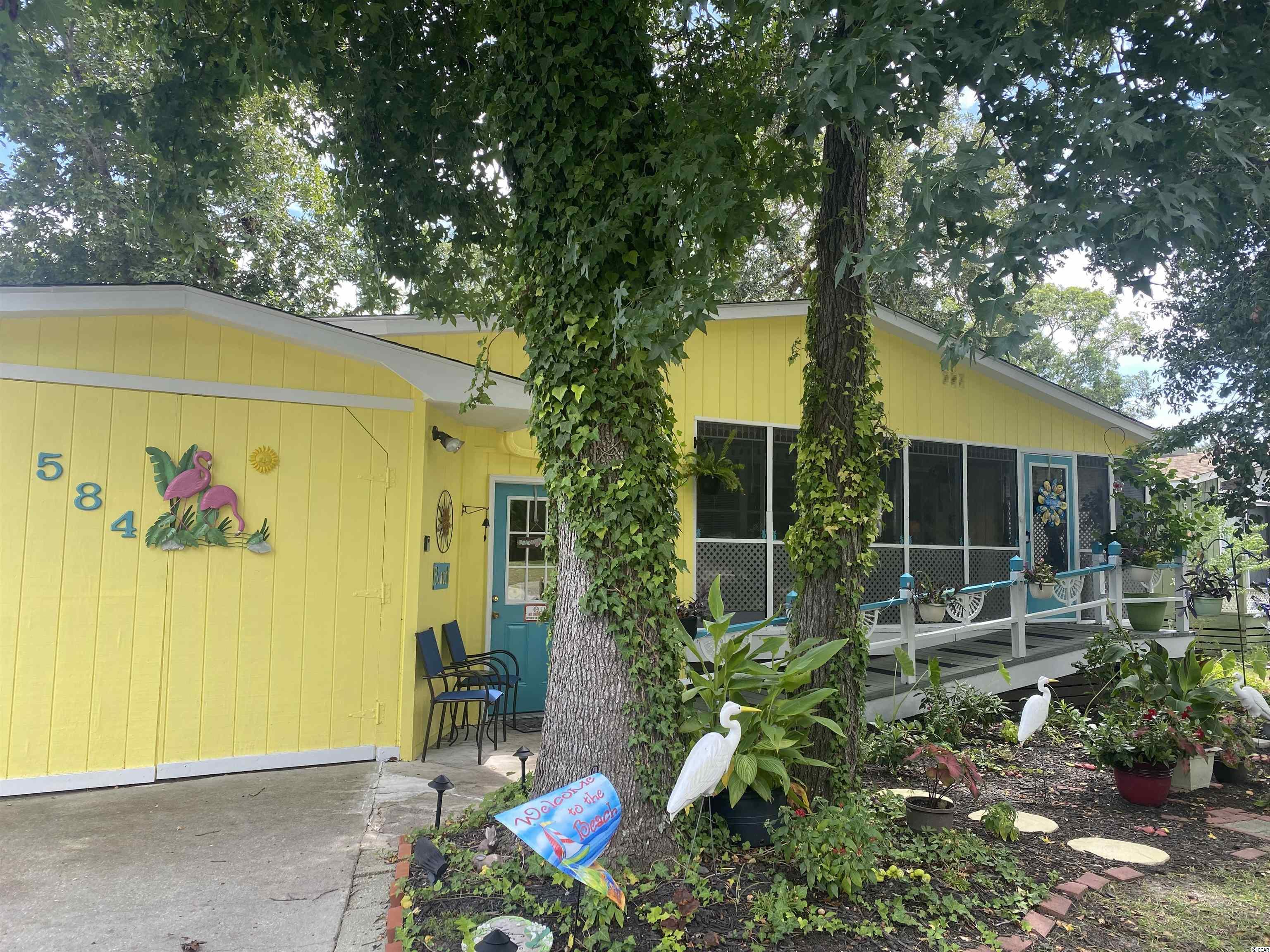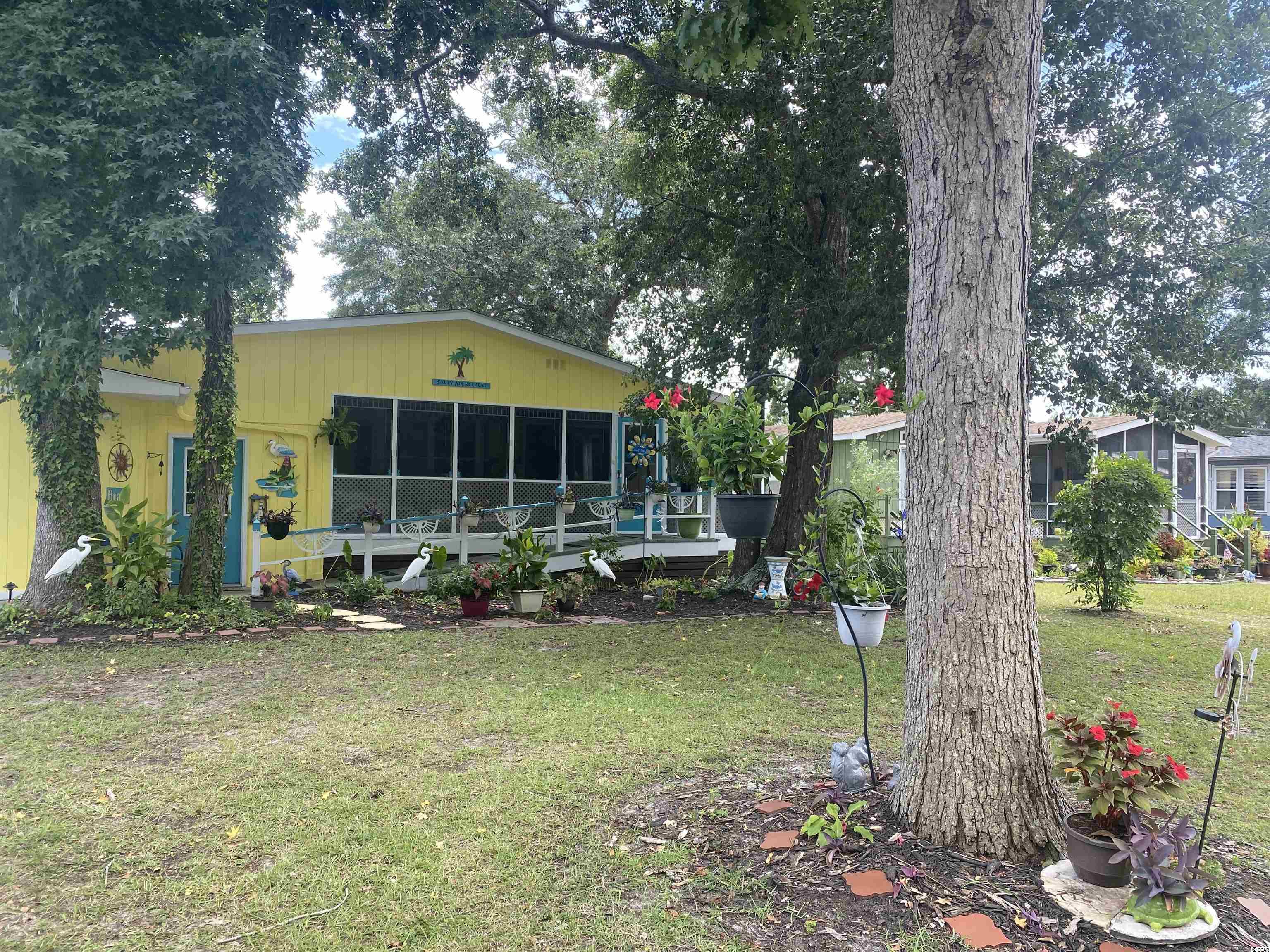 This well maintained home is located east of 17 inside the gated golf cart community of Oceanside Village. Located on a larger lot with beautiful mature trees. This home encompasses 3 bedrooms, 2 baths and a studio apartment . This home features an all seasons porch where you are sure to spend most of your time. The studio apartment is equipped with a small kitchenette with mini frig, microwave, and large toaster oven as well as seperate entrance. Updates include laminate flooring in main living areas, roof 2021, home has been encapsulated, and much more. Oceanside Village offers something for everyone inlcuding indoor & outdoor pools,kids splash pad, tennis, bocce & pickle ball, bark park,private beach front parking and much more!