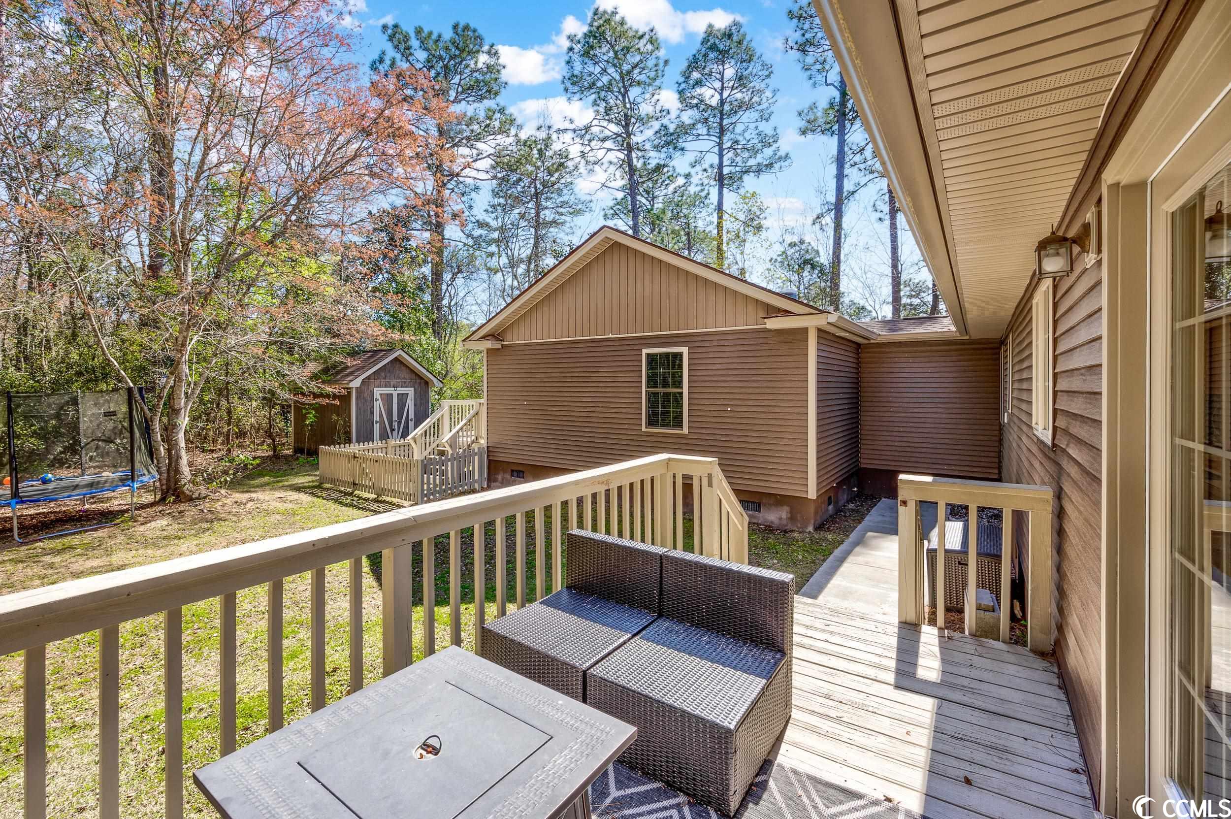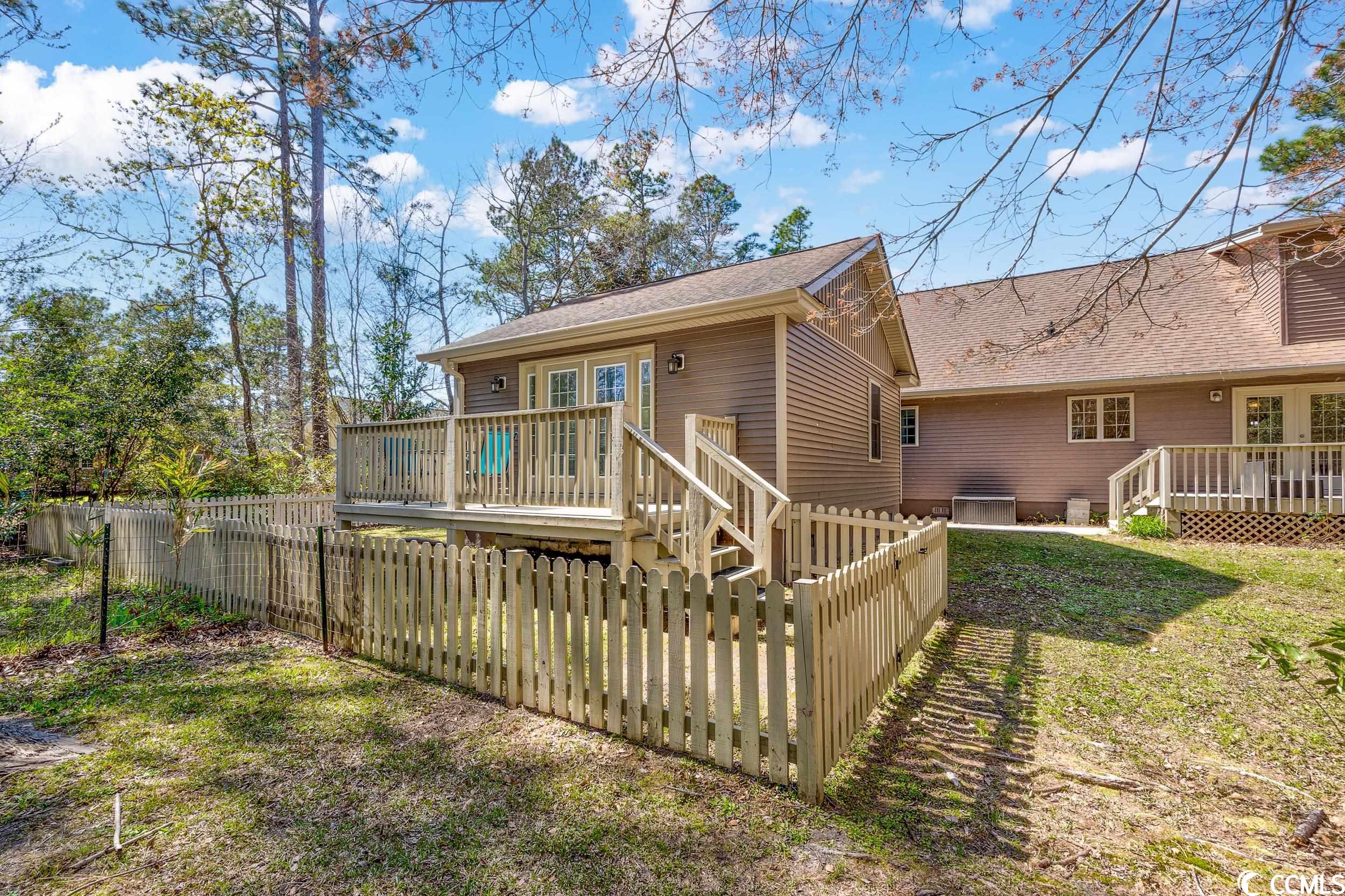 This warm and expansive home is a must-see for a large family or buyer looking to accommodate in-law living!! Located in the Fox Bay area, it is surrounded by mature trees and landscaping. The front has a welcoming appearance and features a sprawling front porch. The backyard is fenced-in and has a shed for outdoor storage. Stepping over the front door's threshold, you enter a spacious living room with newly refinished hardwood floors that continue into the dining area and kitchen. The dining area features a grand built-in hutch. Other first-floor features are a half bath, a bedroom and the On Suite with a walk-in closet. But wait, off the kitchen is a perfect room with ample shelving and space for an office, crafting, or sewing. Off the dining room, you will find double doors that lead to the deck and a private backyard, perfect for outdoor entertaining. Venturing to the second floor, you will find two additional bedrooms, another full bath, and a bonus room with a closet for extra storage. And yes, there is still more. An in-law apartment on the first floor towards the back of the home has a small deck and private entry that is handicap accessible. This space boasts a large living area, a small kitchen area, a laundry room, and a full bath with a walk-in tub. It has its own backyard space decoratively enclosed with white picket fencing. Don't miss this home in the quaint little city of Loris!!