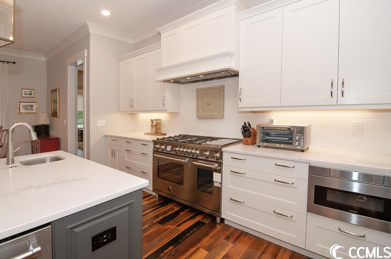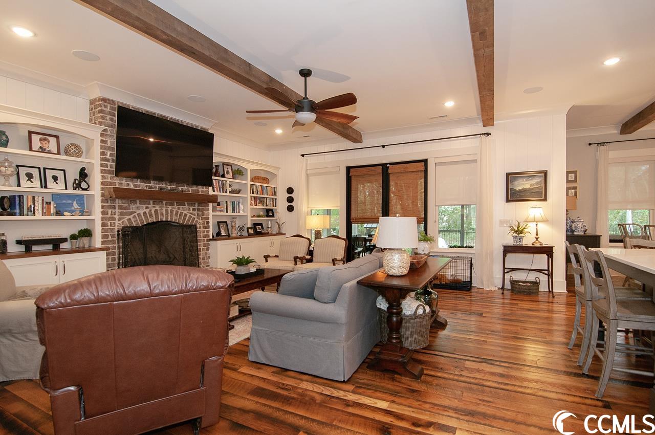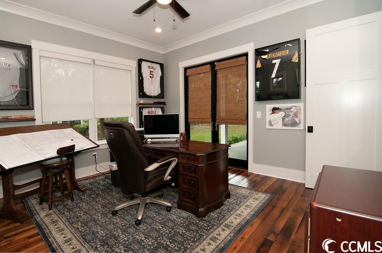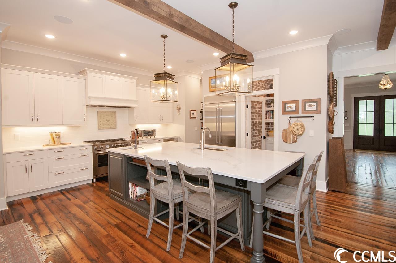 Lowcountry charm blends with contemporary elegance and modern conveniences in this beautiful home on one full acre with saltwater pool. Sweeping front lawn and lush backyard with mature live oaks and firepit gathering area. Welcoming foyer with wide front hallway leads to the heart of the home with open concept eat-in kitchen and living area featuring wood-burning fireplace as well as gorgeous hardwood floors and custom beams restored from 1880s dairy farm. Amazingly functional floor plan includes a butlers pantry in between the kitchen and formal dining room. Sleek gourmet kitchen boasts quartz counters, stainless steel appliances, two large pantries, center island with dual sinks and breakfast nook. The adjacent screened porch provides an accommodating outdoor living space overlooking the backyard and pool. Fabulous master suite is located on the first floor along with an office that could be used as a second bedroom. The second floor provides two more bedrooms one en suite, plus a full bath in the hallway. A separate stairwell leads to a fourth full bath and bonus room above the garage offering plenty of space for additional sleeping arrangements, fitness nook, TV den and walk-in closet, currently used as a second office. Additional home features include whole-house generator, Hardiplank exterior, gas-powered instant water heaters and two garages one 2-car over-sized attached and one 2-car climate-controlled detached. River Oaks Estates, off Waverly Road, provides a tranquil rural setting with close proximity to the Waccamaw River. No HOA. Convenient to schools, health care facilities, golf courses, unique shops and restaurants, as well as to the local beaches and Waccamaw River marinas and boat launches.