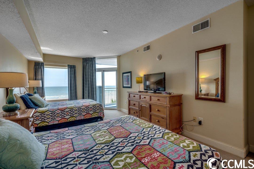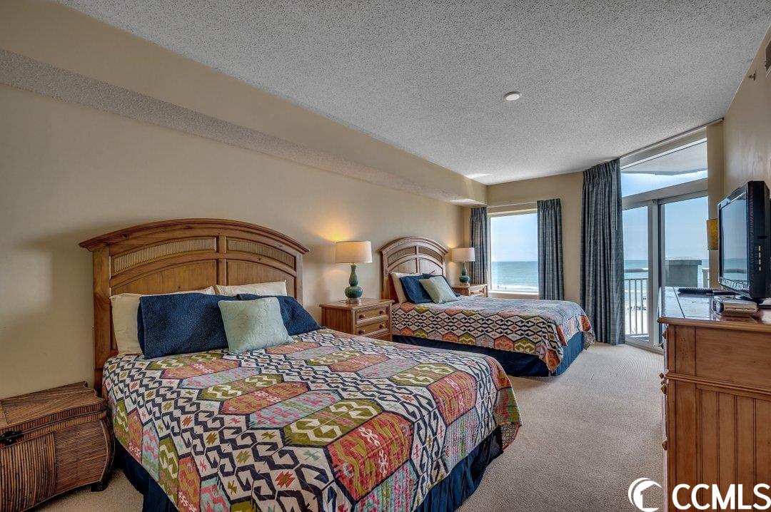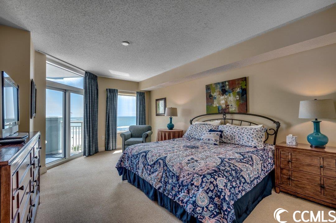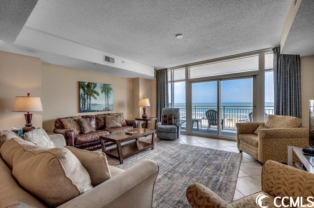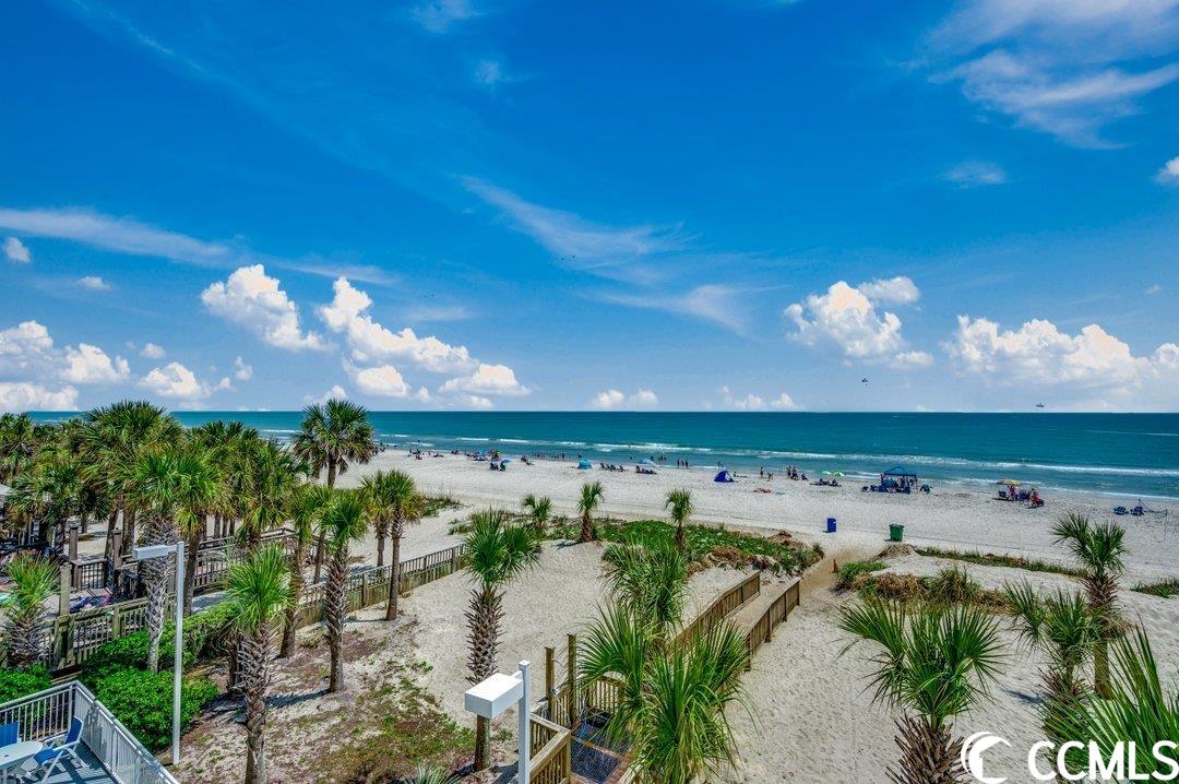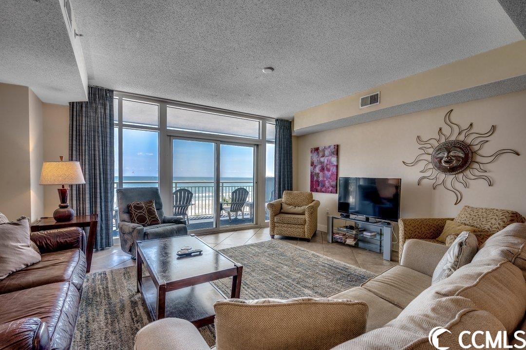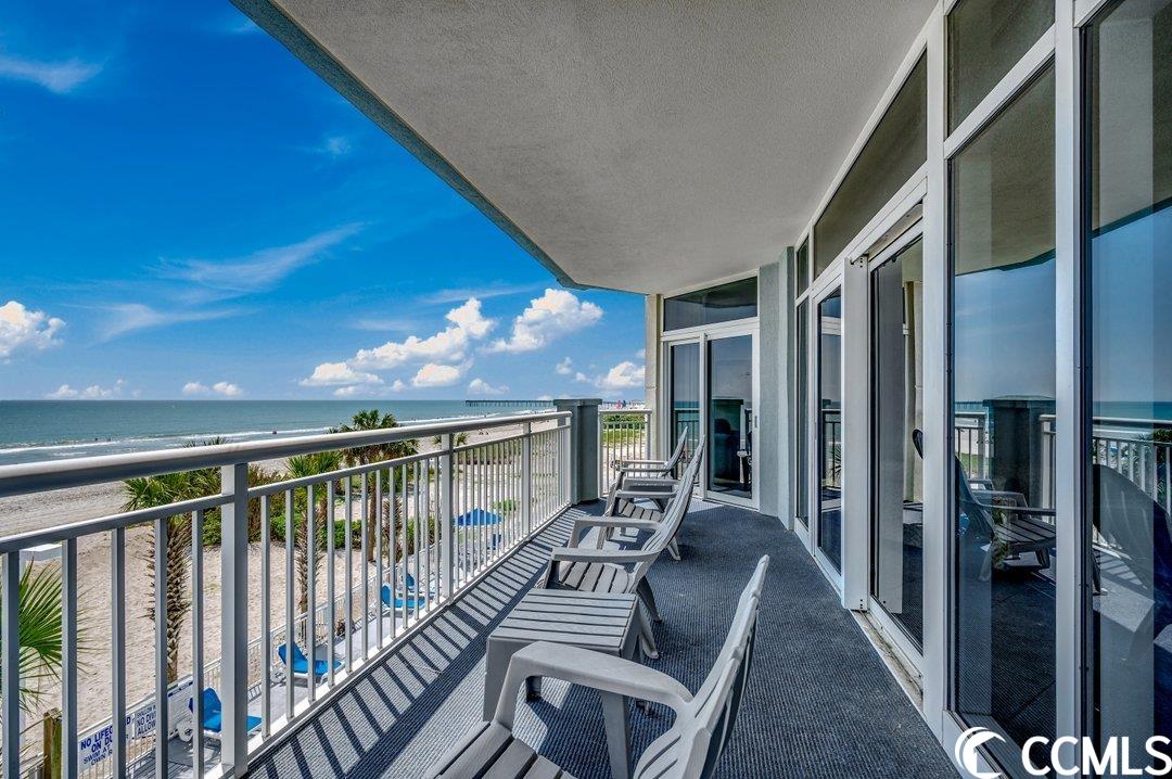Huge direct oceanfront 4 bedroom 4 bathroom condominium in Ocean Blue. This is a rare listing. There are only 36 residences in this luxury building. Spectacular ocean views from the large balcony. The living room and two bedrooms are direct oceanfront. Nicely furnished and accessorized. Granite counter-tops in the kitchen and bathrooms. Stainless steel appliances in the kitchen. Washer/dryer for your convenience. The master bathroom features a double sink, a shower and a tub. This would make a wonderful primary residence, second home or vacation rental property. Ocean Blue amenities include climate-controlled enclosed corridors and an assigned parking spot for each unit (an unusual feature for oceanfront condo buildings). There's an outdoor pool and grilling area. Also, there are a number of indoor water amenities available for year-round use - a lazy river, another pool and hot tubs. To top it off, there is an exercise room. The south end location is very close to the restaurants and shops of Market Common, the Myrtle Beach International Airport, Coastal Grande Mall, Downwind Sails and the Myrtle Beach Boardwalk and just a couple of miles from Broadway at the Beach. The HOA fee includes water/sewer, unit electric, cable and internet, as well as building insurance. All information is deemed correct, but it is the responsibility of the buyers and their agent to verify all information.