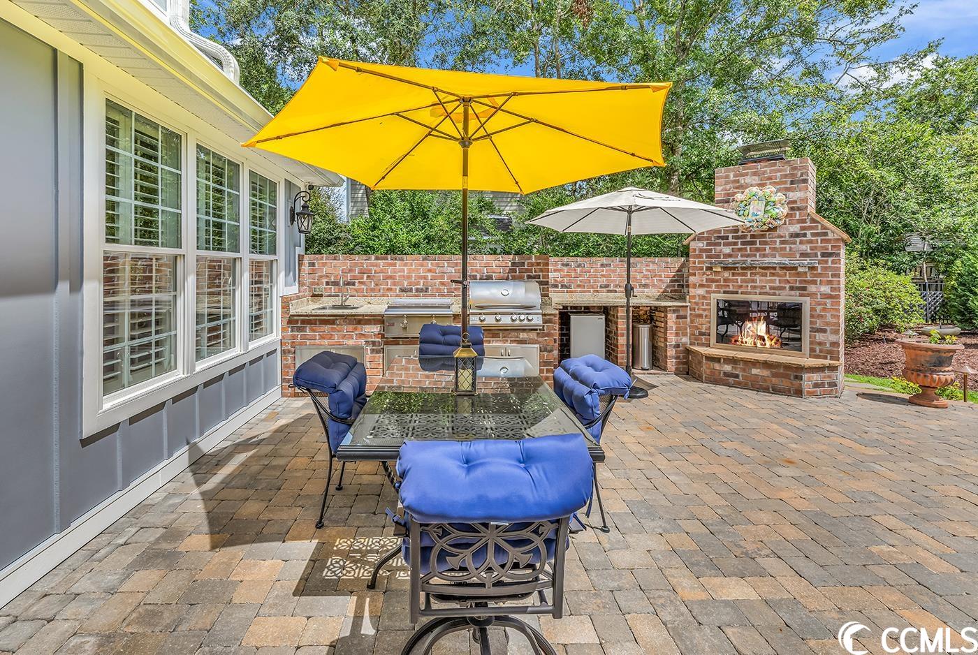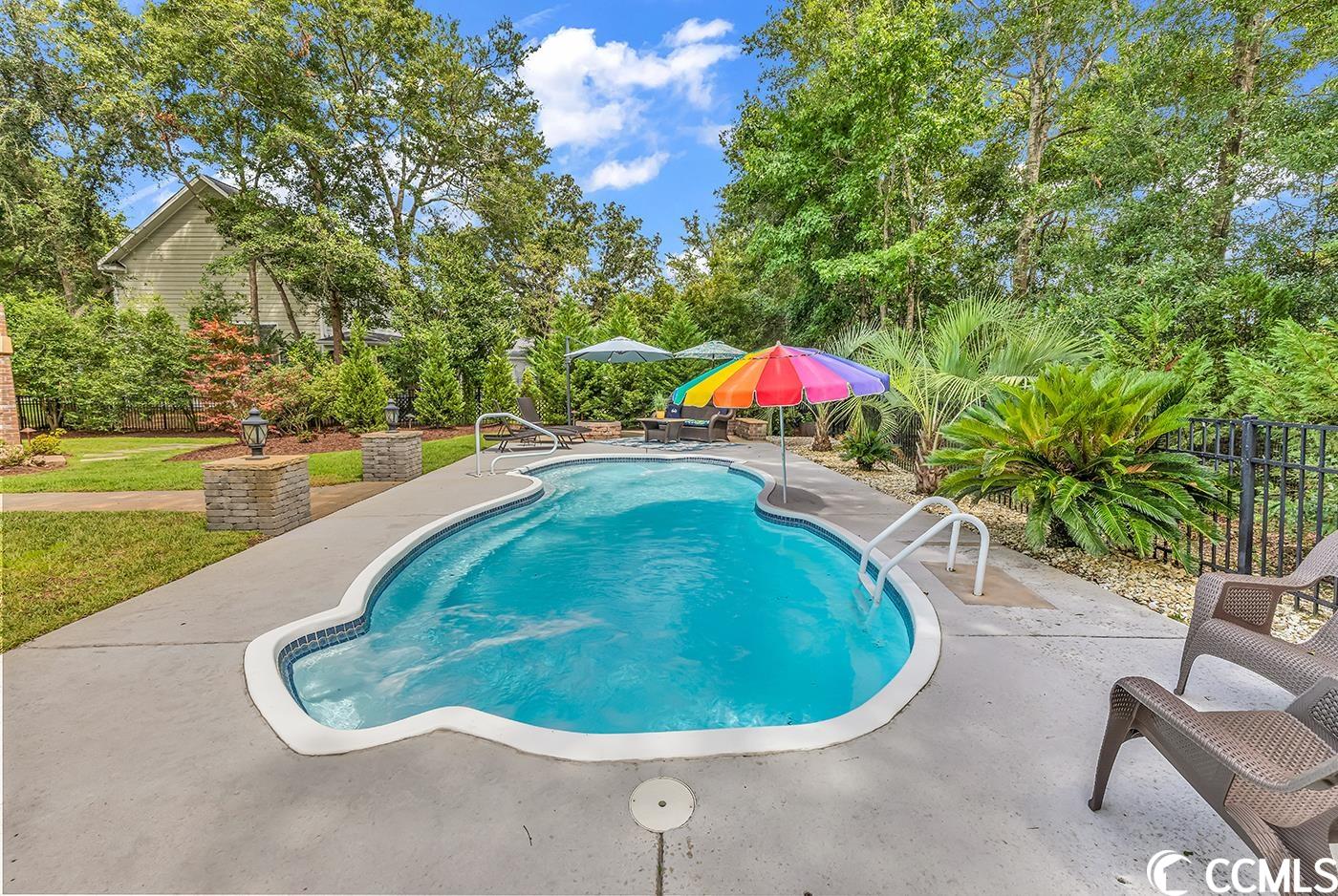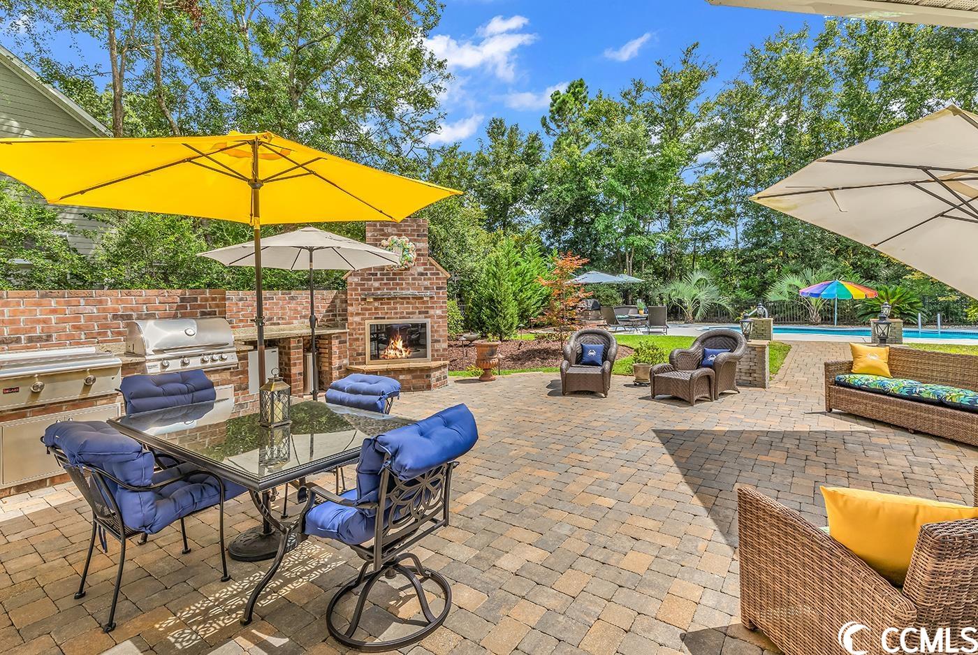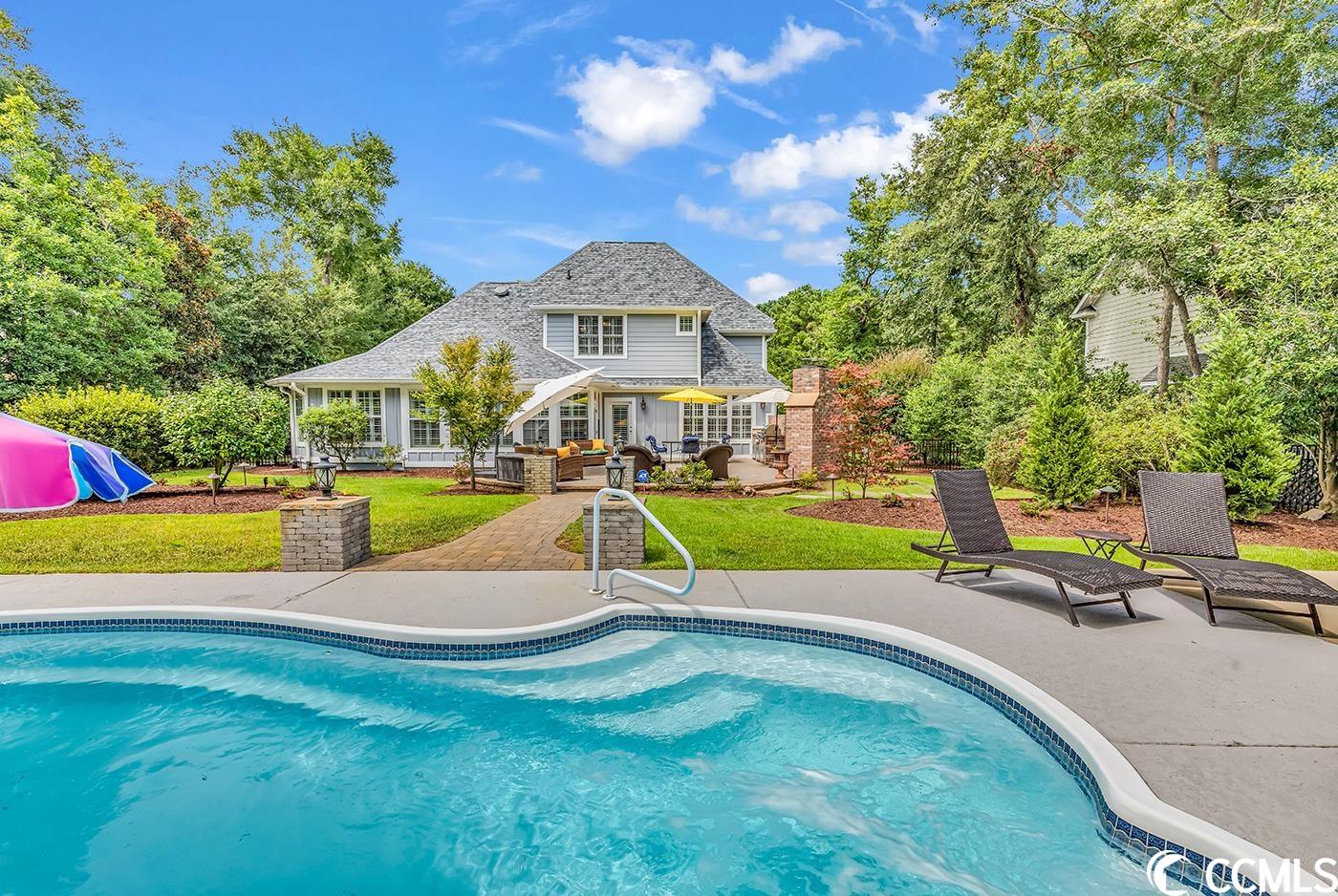 Very well maintained! Amazing custom built home offering 5 bedrooms, 3.5 baths, 3 car garage capability. Home only 5-10 minutes to beach, plantation shutters through out, new roof, siding, professionally landscaped with night lighting. Woman or man cave in third garage. Fenced in yard with nice outside patio and summer kitchen with stainless steel appliances, outside fireplace has stainless steel doors. Inviting salt water pool and pool shed. Pool has been maintained with new motor, salt cell and filtration system. Spacious gourmet kitchen with walk-in pantry. Home offers two living areas with primary bedroom on main floor. Double sided fire place in Carolina room. Upstairs has another primary bedroom, 2 additional baths with a 2023 remodeled hall bath and an office/study. Home also features a Central vacuum and is wired for surround sound. A must see home. Won't last long!