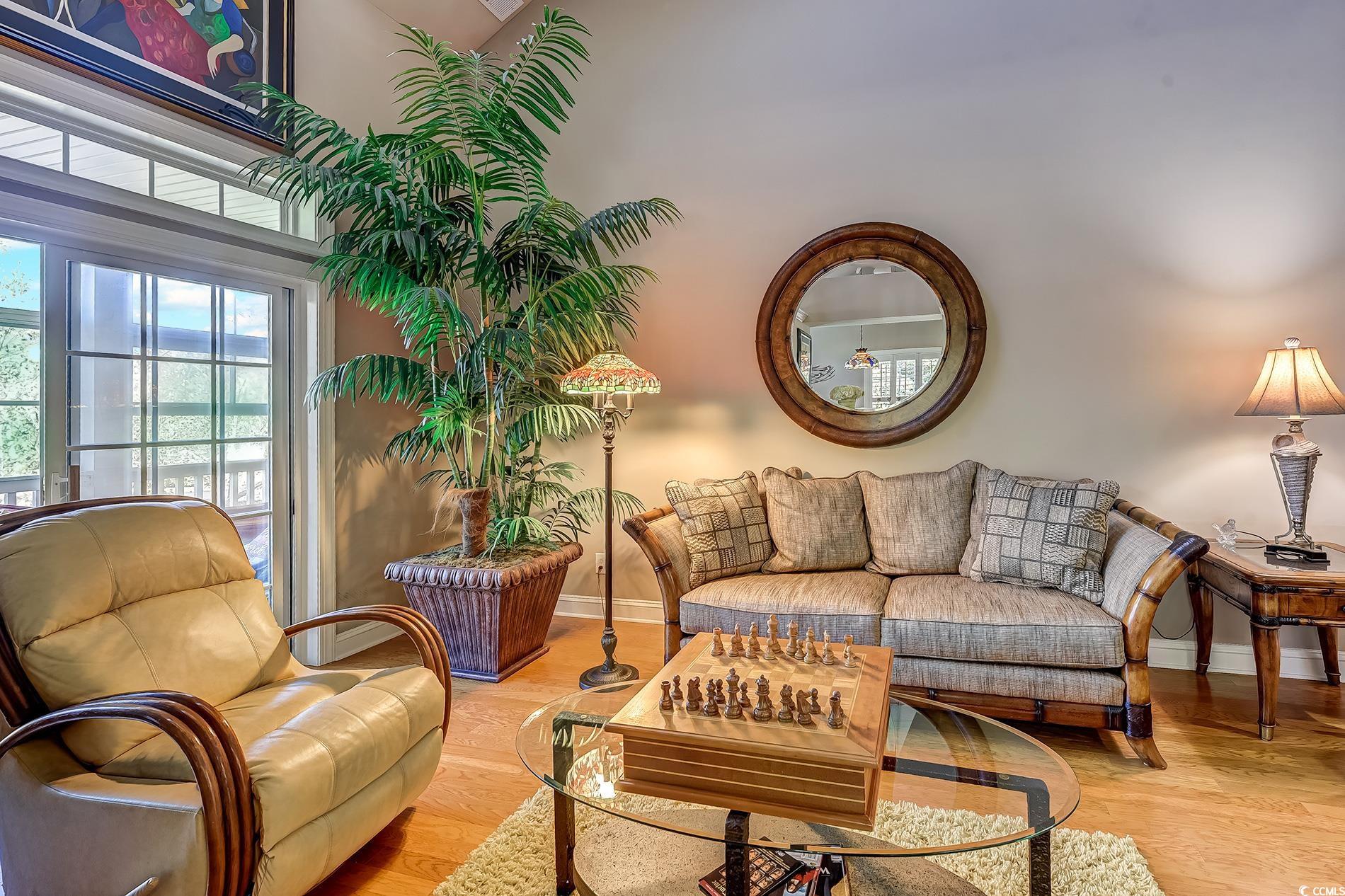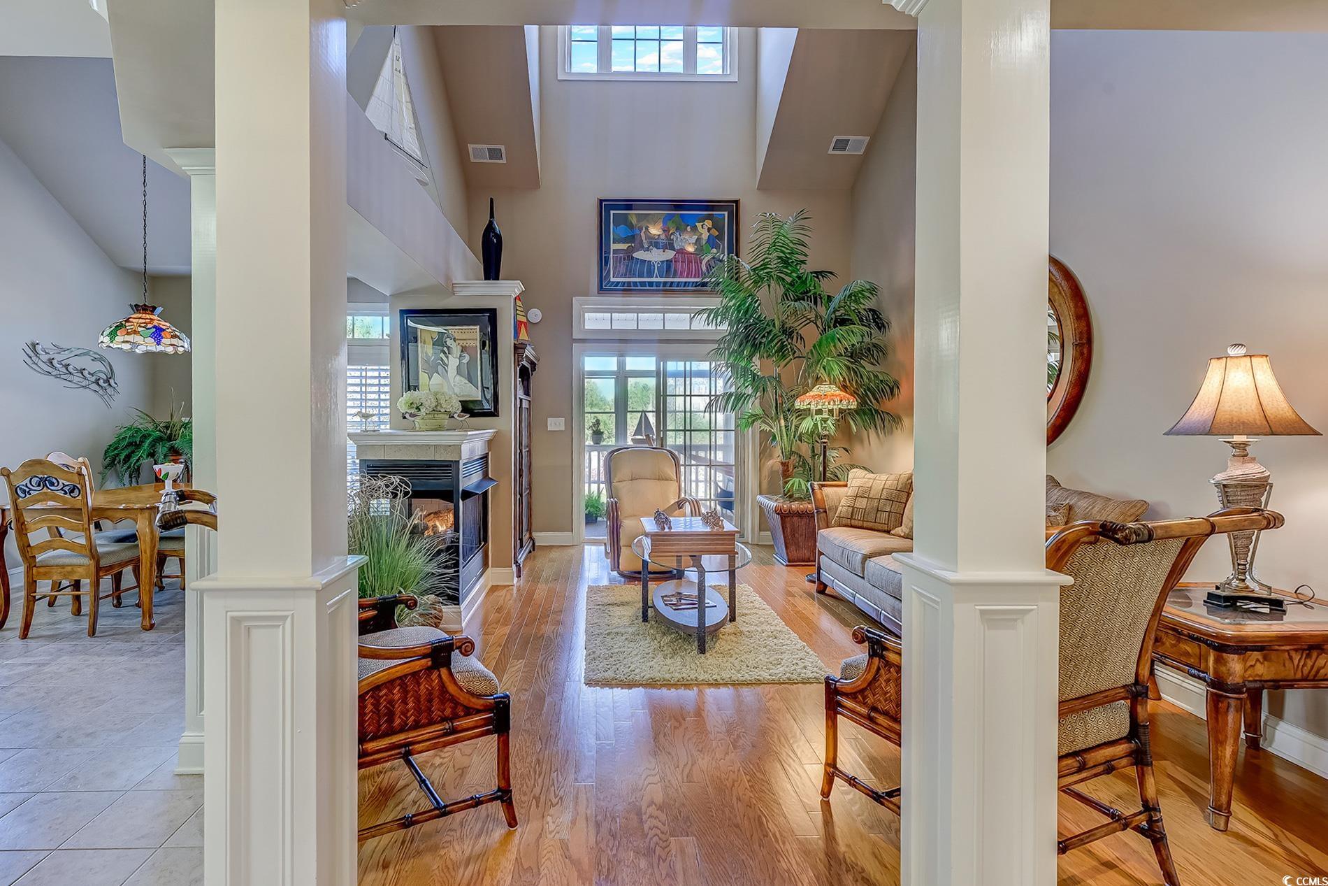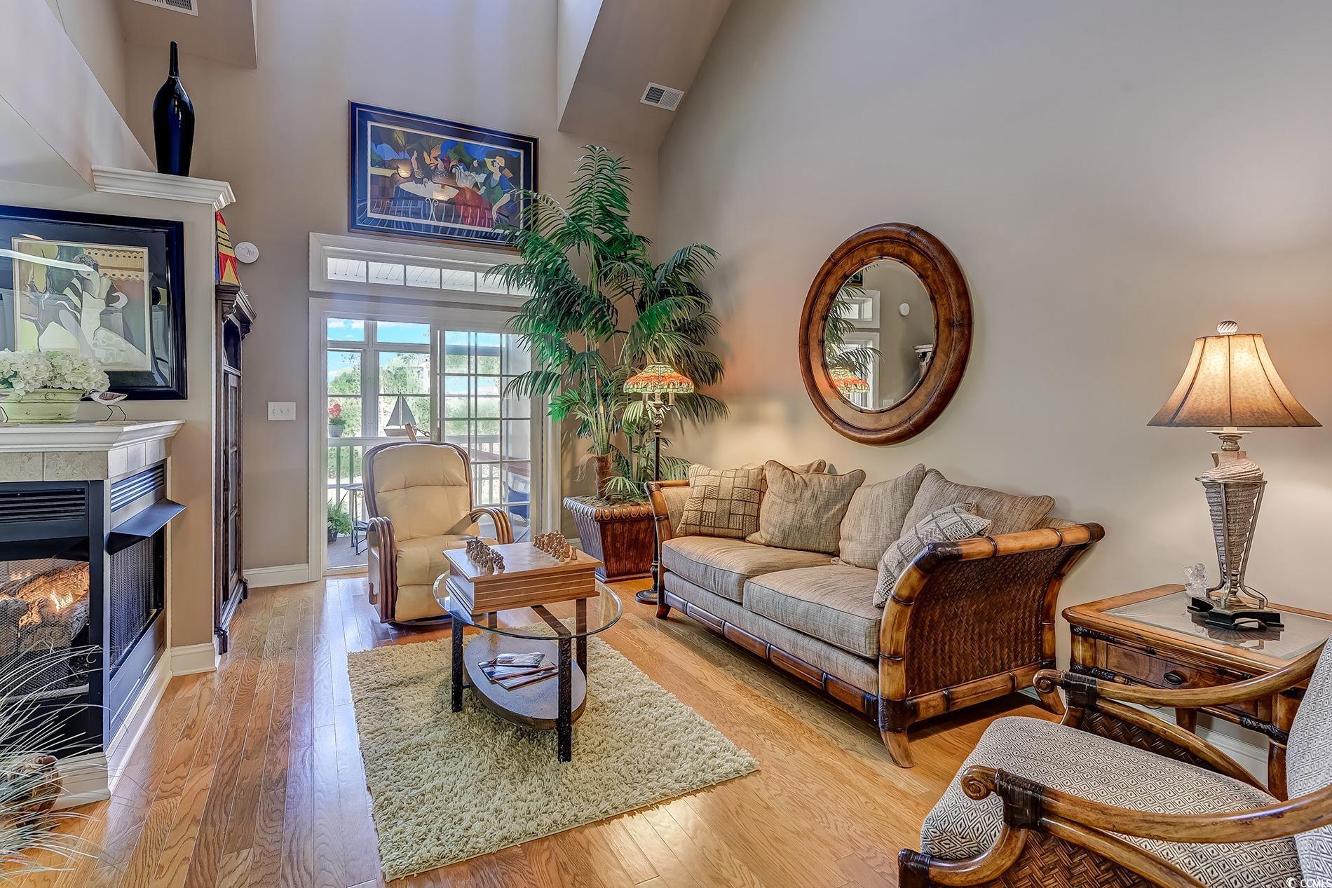 Immaculate, well-maintained luxury 4 bedroom, 3 bath, end unit condo, located in the prestigious gated community of the Villas at the International Club. The owners of this meticulously maintained home are the only ones who have lived in this condo since it was built.The condo was used as a second home for many years. Extremely spacious features include entering in the foyer with a breathtaking, vaulted cathedral ceilings, multiple tray ceilings and white plantation shutters throughout the house. The kitchen has updated appliances, new backsplash, Corian countertops, plenty of cabinets, counter space and a pantry. Preparing dinner in the kitchen, entertaining in the dining room or living room you can enjoy the three sided fireplace. This is an extremely open floor plan with able outdoor space and plenty of natural light. With access to the large back porch from your living room and master bedroom you can enjoy the beautiful pond view with a lighted fountain at night. Enjoy year around with the three season windows. There is also an open deck off of the dining room with stairs to the yard.The covered front porch includes security, motion lighted stairs.The master bedroom offers tray ceilings, a large walk-in closet, with access to the balcony. The master bath is very spacious and also features a Jetted tub, double vanities and walk in shower. The first floor also features 2 more spacious bedrooms one being a en suite.The Laundry room is on the first floor with plenty of storage space. Upstairs, one more bedroom with an en suite and a walk in closet. Across the hallway, ""a loft area, great space for a cozy chair and a good book"" is a bonus room being used as a family room. Looking for storage? There are two doors that lead to two large floored attic spaces for lots of storage. This condo is close to the villas pool which HOA has made it available for sunning & socializing year around. Stores, restaurants, the beach, golfing, boating are but minutes away. This would make a great second home or permanent residence. Close to Hospitals, shopping, and the Murrells Inlet Marshwalk, Huntington Beach State Park, and Brookgreen Gardens. Schedule a showing today!