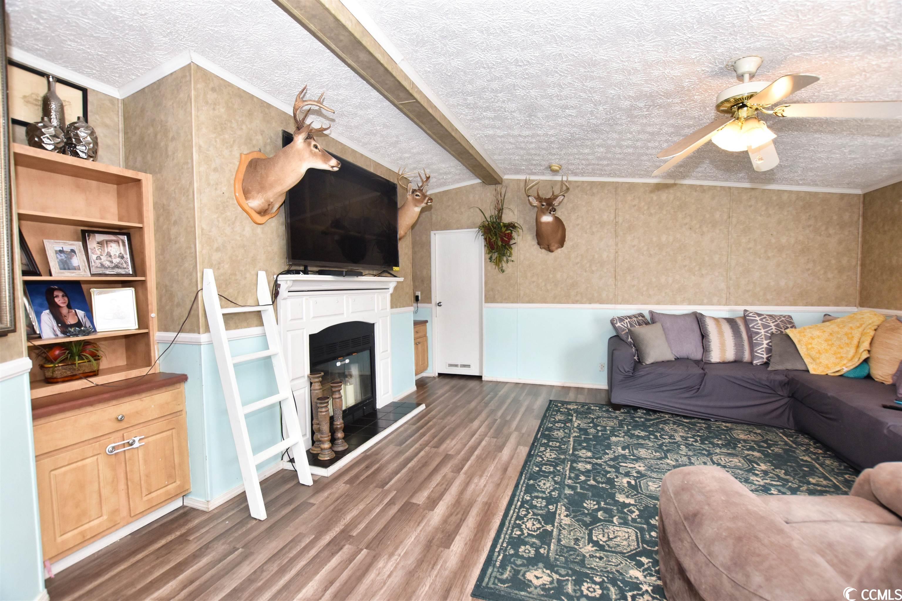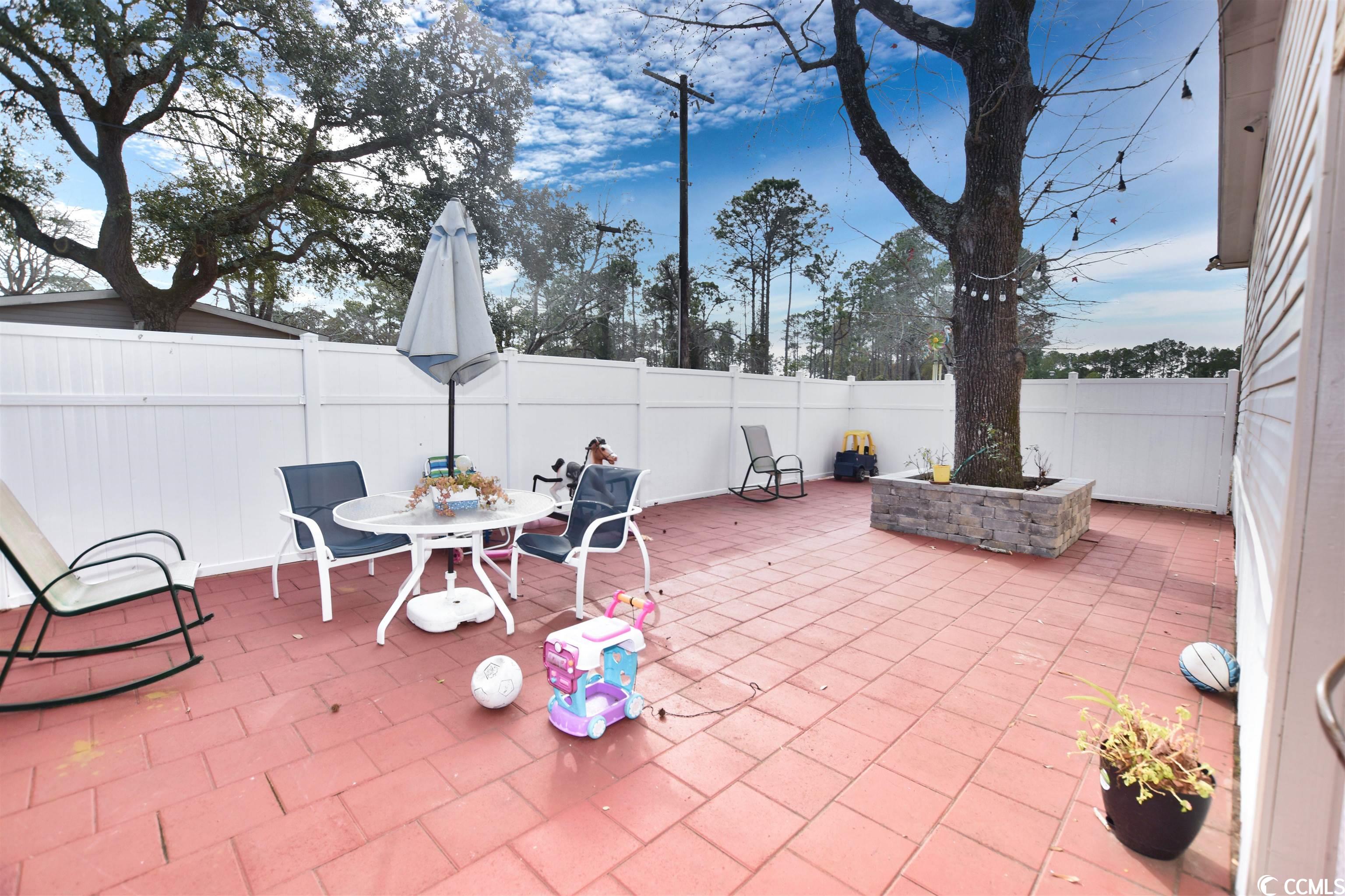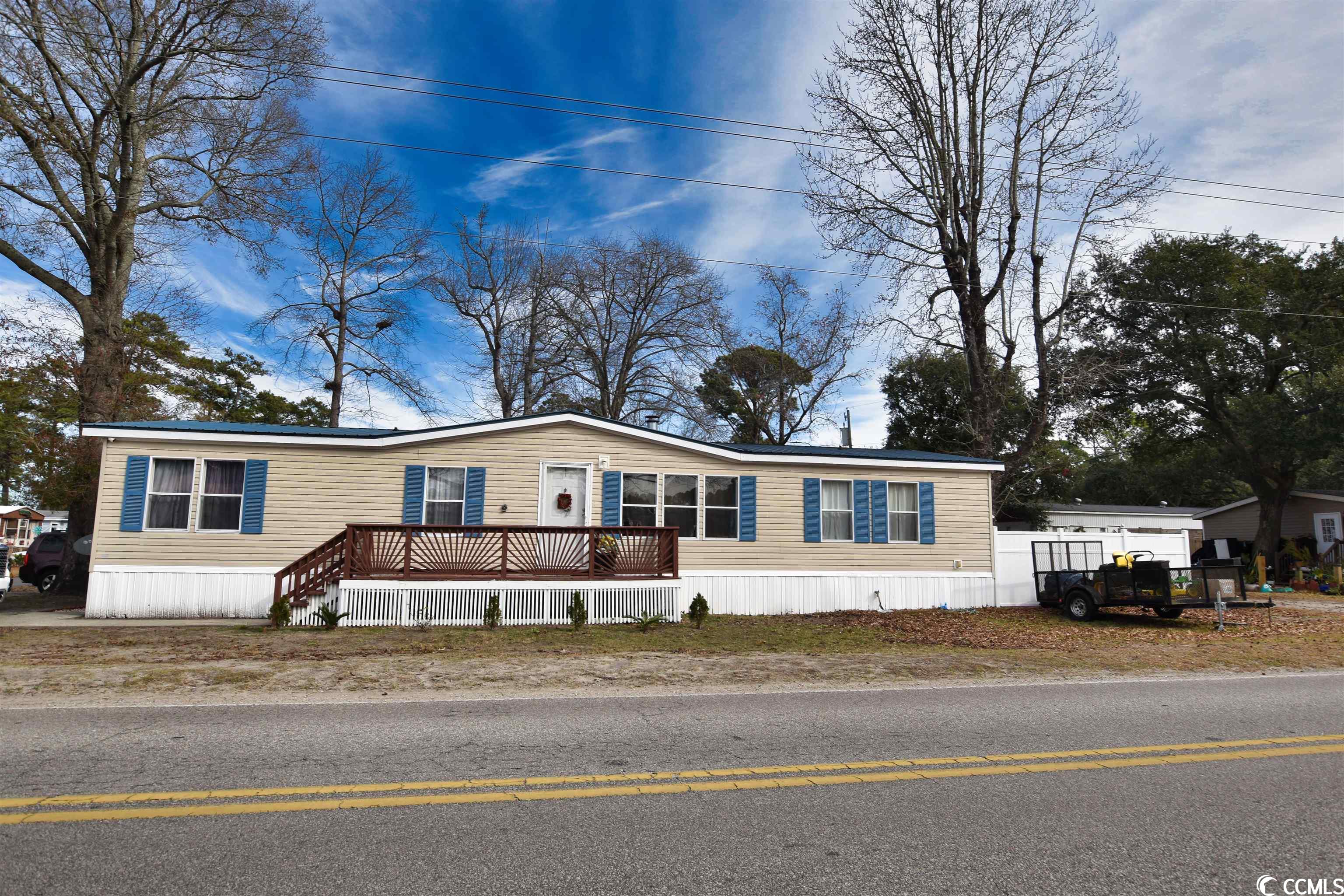 This charming 3-bedroom, 2-bathroom residence offers an exceptional outdoor space for hosting gatherings, nestled in the sought-after Crystal Lake Community. The home, a spacious double wide mobile unit, boasts modern luxury vinyl plank flooring throughout. Its main living area features high vaulted ceilings and a dedicated dining space. The master bedroom, easily accessible from the living room, includes an en-suite bathroom with dual vanities, a large garden tub, and a separate shower. The kitchen is equipped with a central work island and a breakfast bar, leading into a cozy family room with a fireplace and an open layout. Two additional bedrooms and another full bathroom are situated on this wing of the house. The outdoor area is truly a highlight, offering a covered section, durable surface flooring, and a privacy fence, perfect for enjoying a drink or a barbecue while relishing in the ambiance of your private courtyard. Additionally, there's a separate shed for added storage. The home's location is ideal, close to beaches, shopping centers, restaurants, the Market Common, Myrtle Beach International Airport, and all the attractions Myrtle Beach is renowned for.