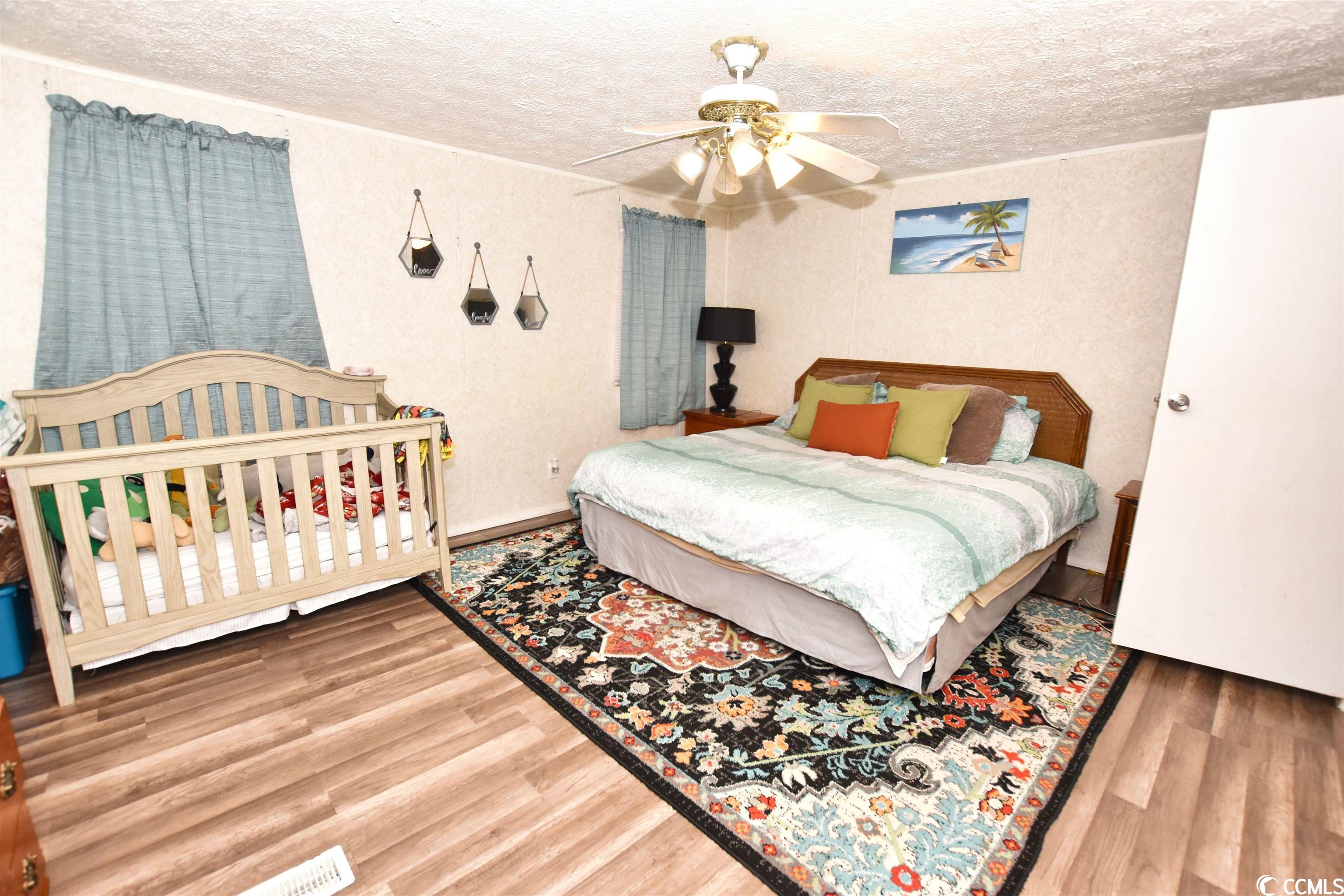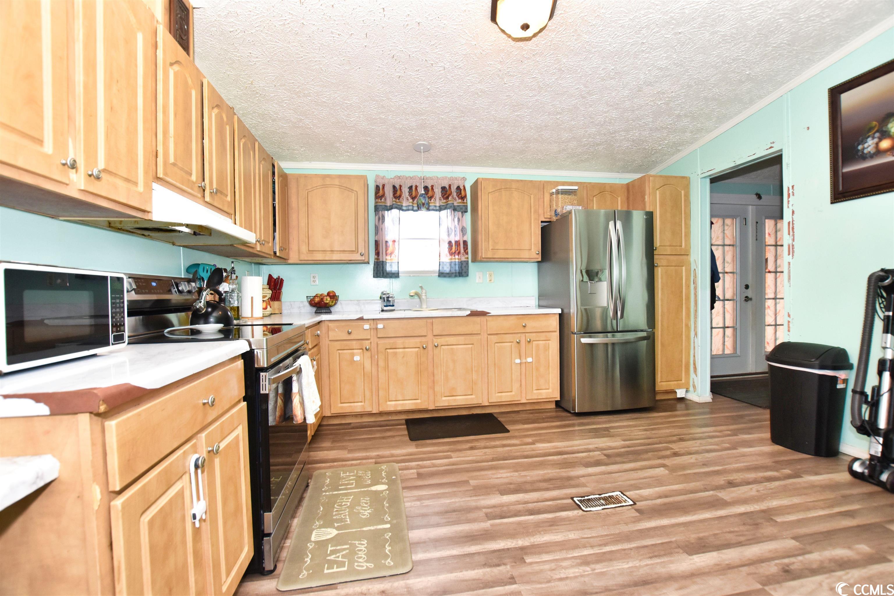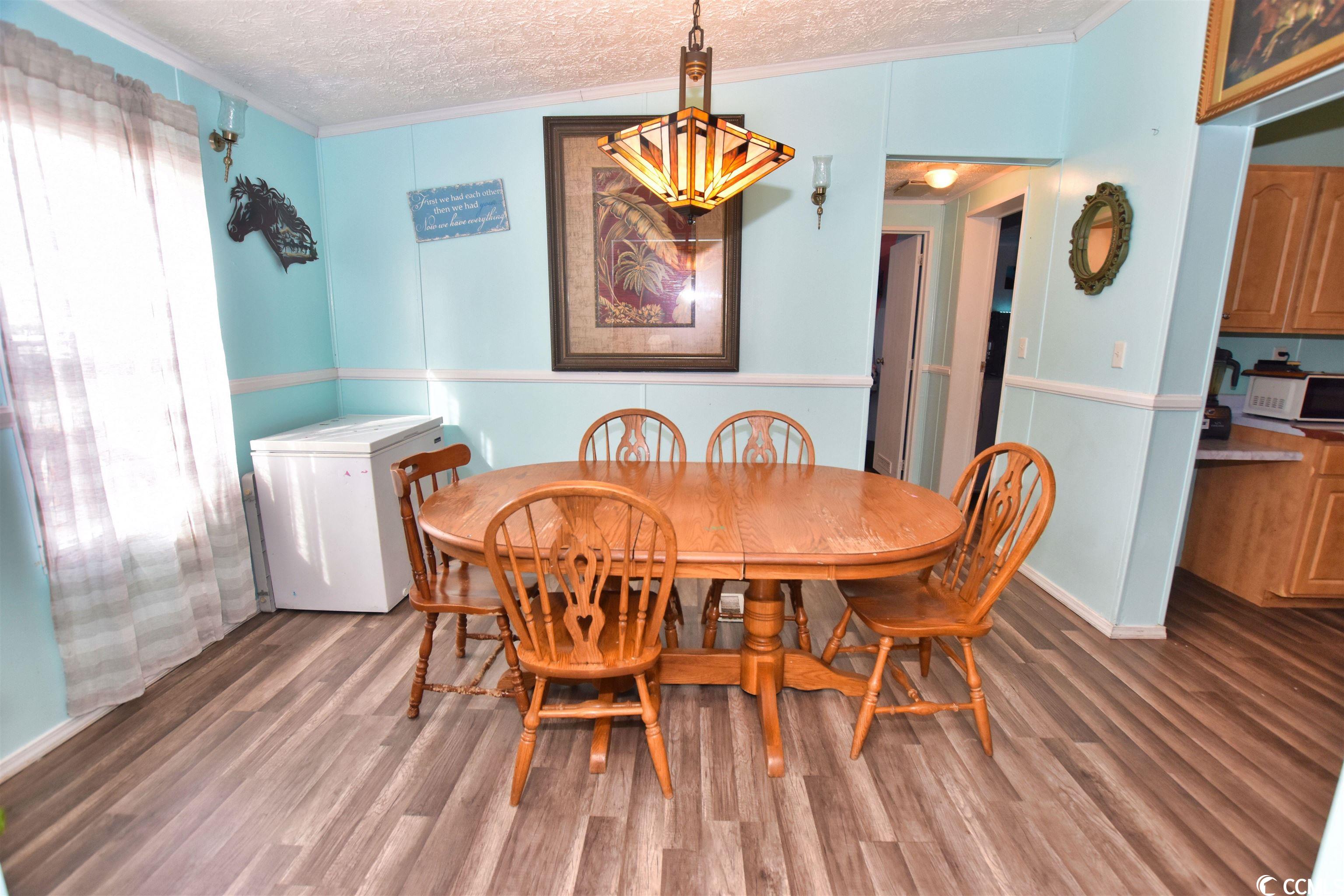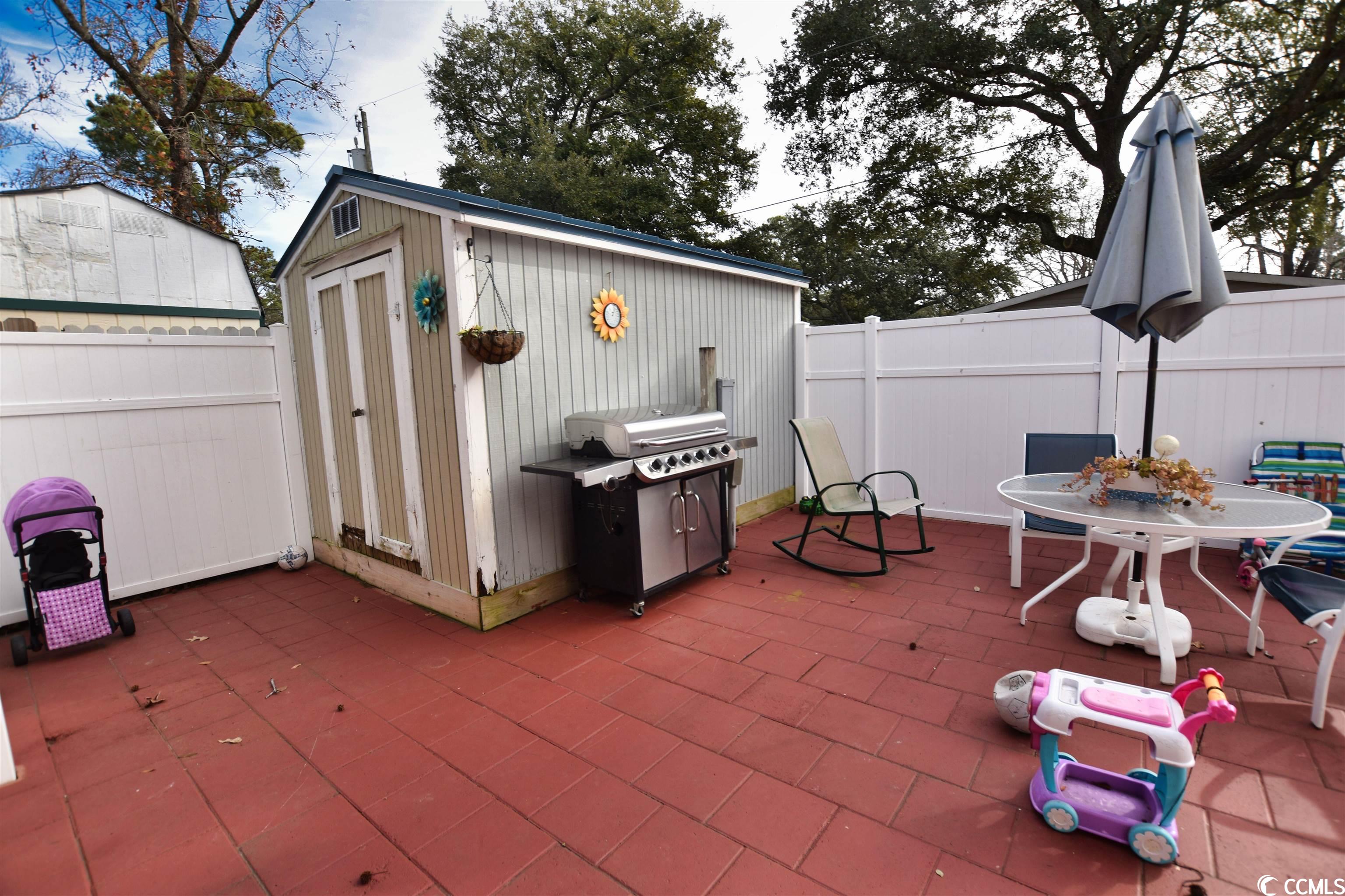 This charming 3-bedroom, 2-bathroom residence offers an exceptional outdoor space for hosting gatherings, nestled in the sought-after Crystal Lake Community. The home, a spacious double wide mobile unit, boasts modern luxury vinyl plank flooring throughout. Its main living area features high vaulted ceilings and a dedicated dining space. The master bedroom, easily accessible from the living room, includes an en-suite bathroom with dual vanities, a large garden tub, and a separate shower. The kitchen is equipped with a central work island and a breakfast bar, leading into a cozy family room with a fireplace and an open layout. Two additional bedrooms and another full bathroom are situated on this wing of the house. The outdoor area is truly a highlight, offering a covered section, durable surface flooring, and a privacy fence, perfect for enjoying a drink or a barbecue while relishing in the ambiance of your private courtyard. Additionally, there's a separate shed for added storage. The home's location is ideal, close to beaches, shopping centers, restaurants, the Market Common, Myrtle Beach International Airport, and all the attractions Myrtle Beach is renowned for.