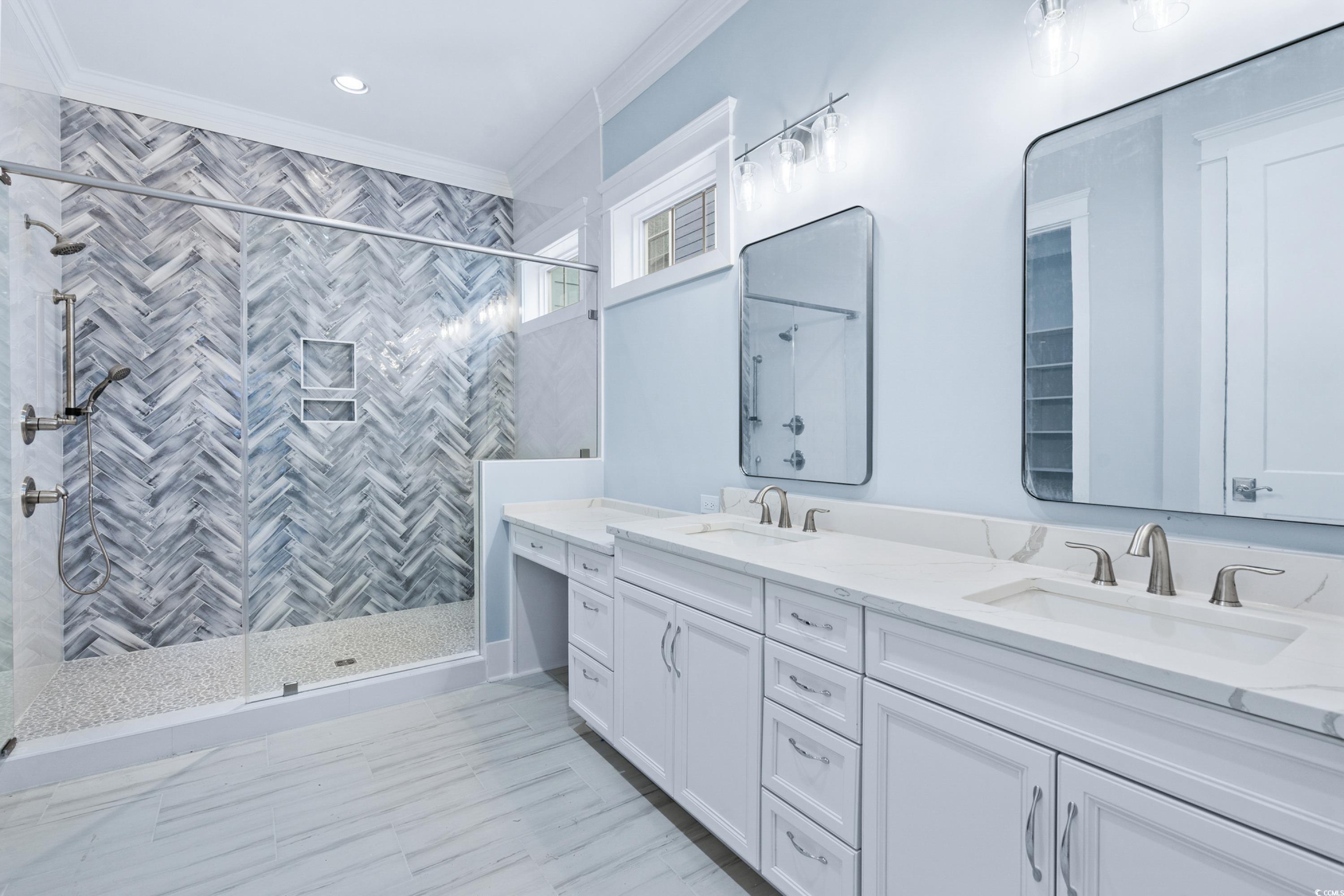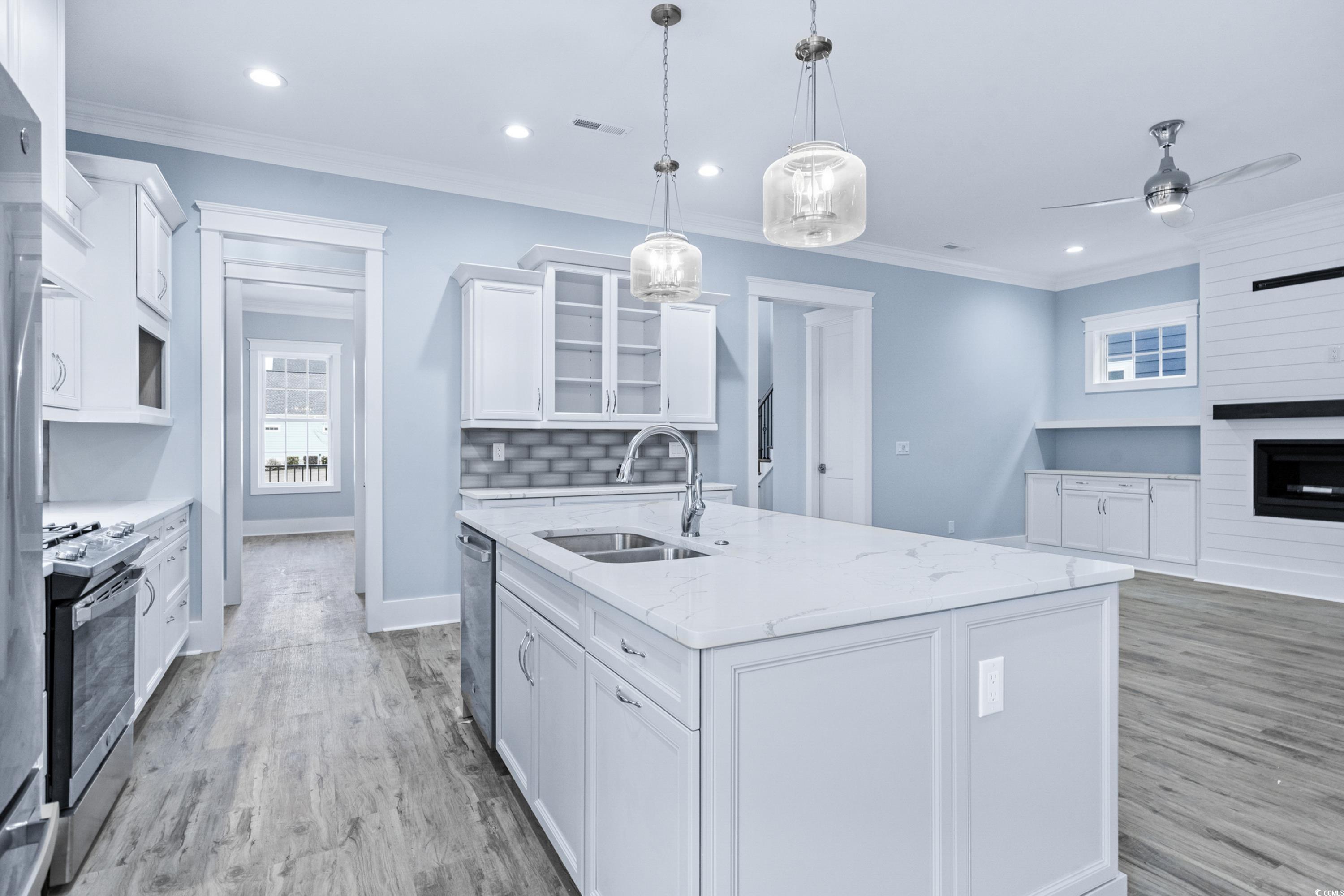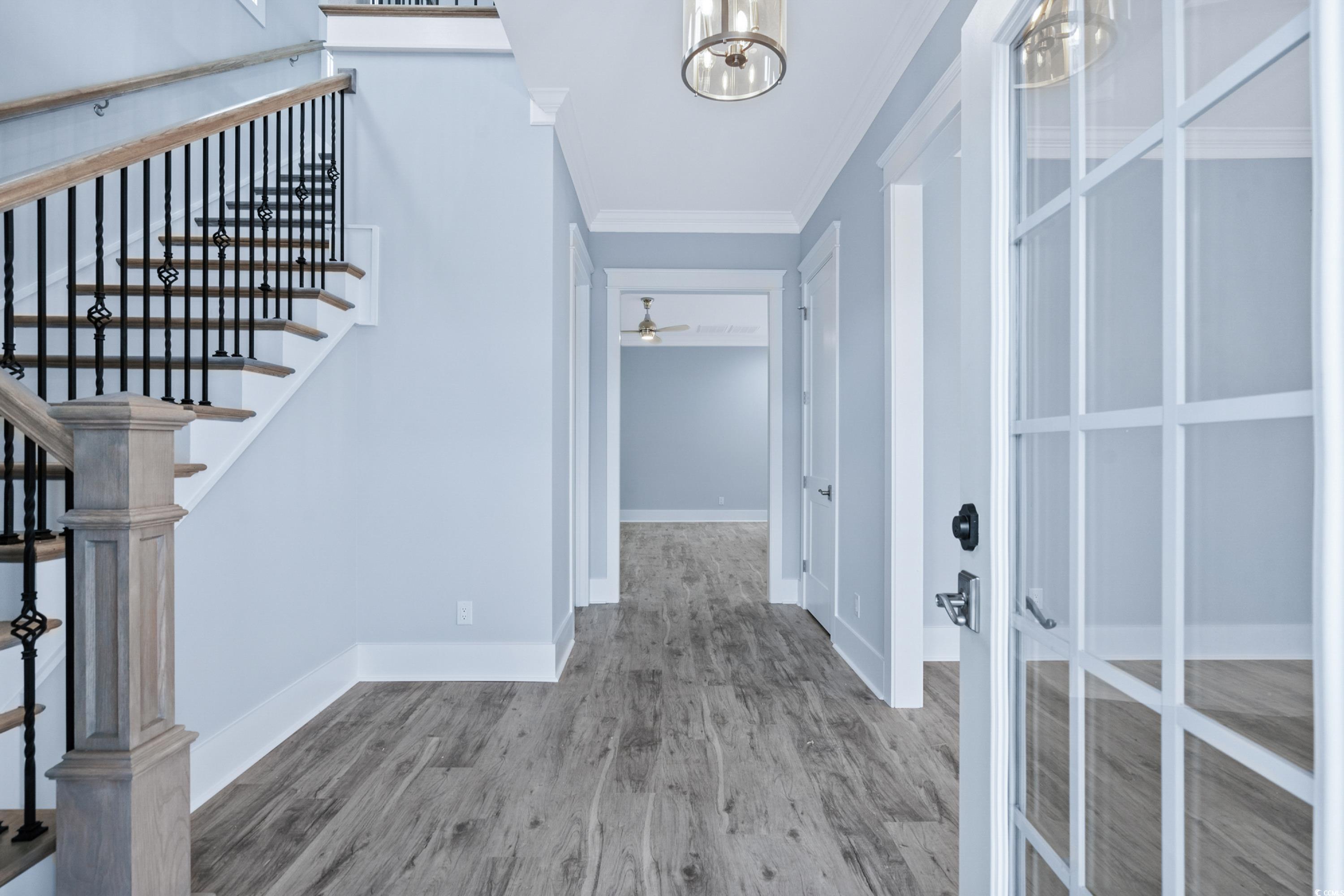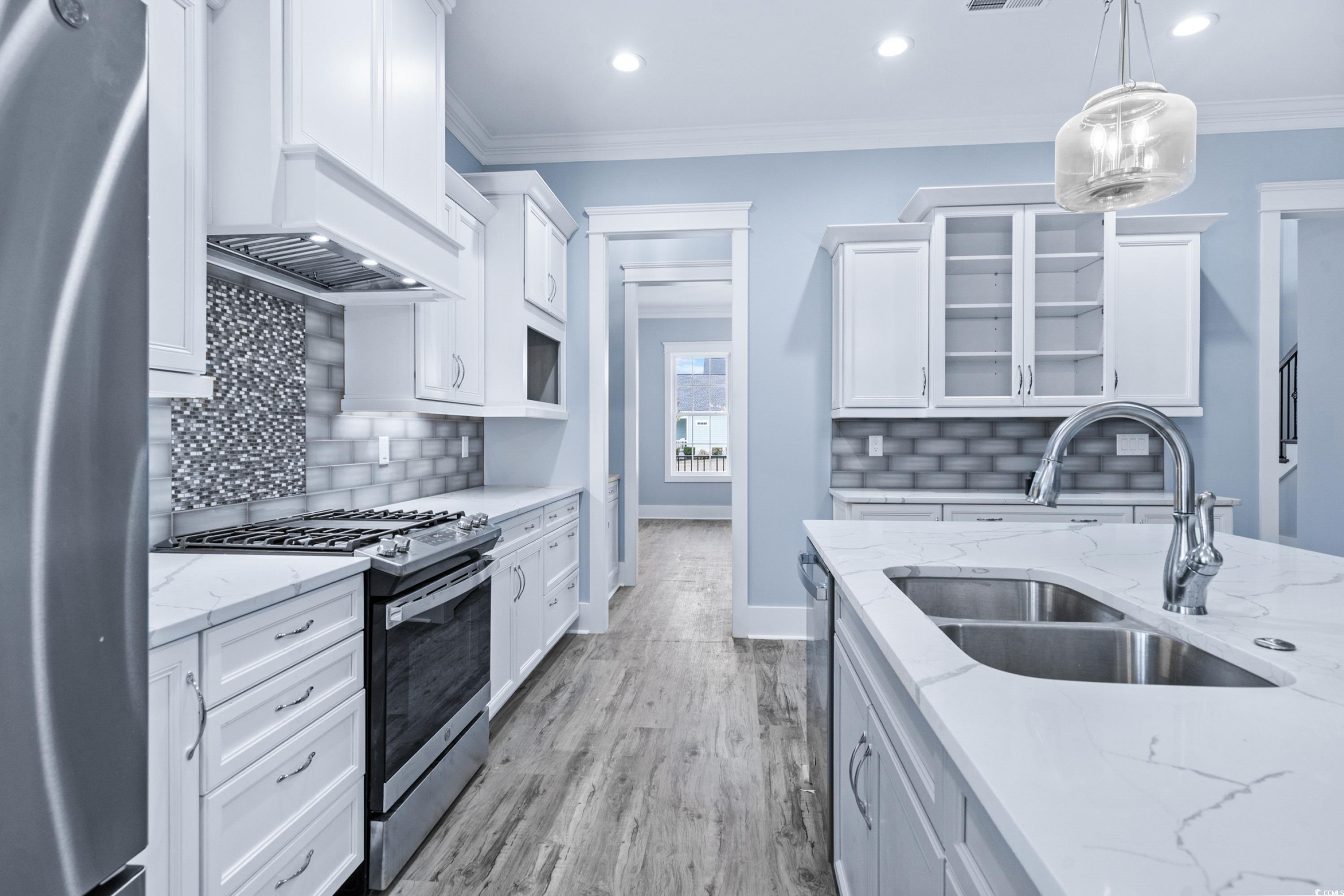 This gorgeous 4 bedroom, 4 full and 2 half-bath home is ready for its first owners. This Charleston style home is 2 story, with a large front porch and 2nd floor balcony. Walk through the front doors to find your large foyer with additional storage under the stairs. This home has a large formal dining room, butler pantry and large pantry making this home perfect for hosting. Primary is located on the first floor sporting an oversize shower and WIC. A luxury vinyl plank and tile home only, with 2 piece crown molding throughout. Upstairs you'll find a huge loft area to relax and enjoy the lake view directly across the street. 2 ensuites located on 2nd floor as well. The best part of this home is the large courtyard featuring a breezeway to your oversized rear entrance garage! Garage has a complete ensuite on 2nd floor. Perfect for hosting guests, a separate living area or mother-in-law suite. Don't miss the chance to see this!