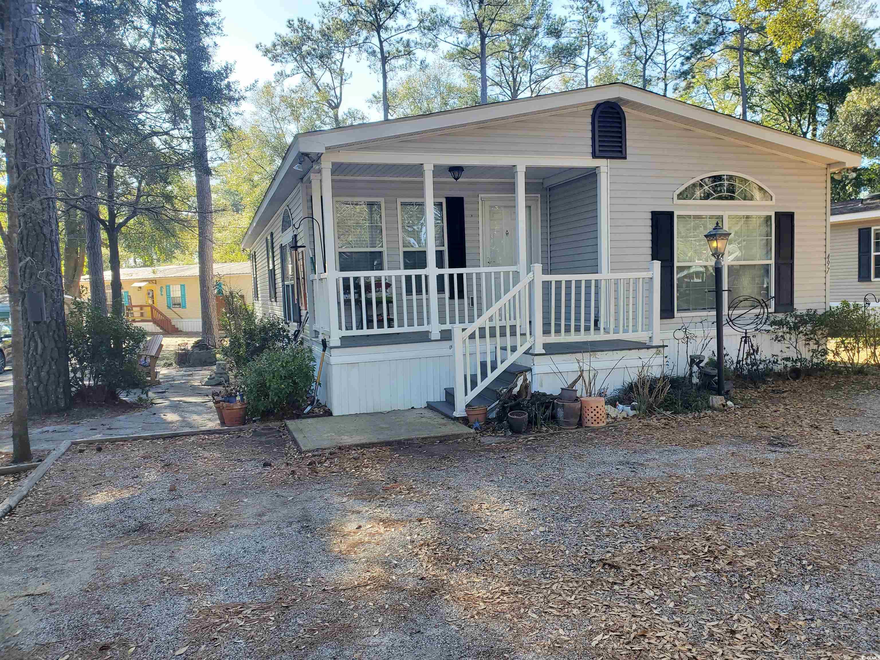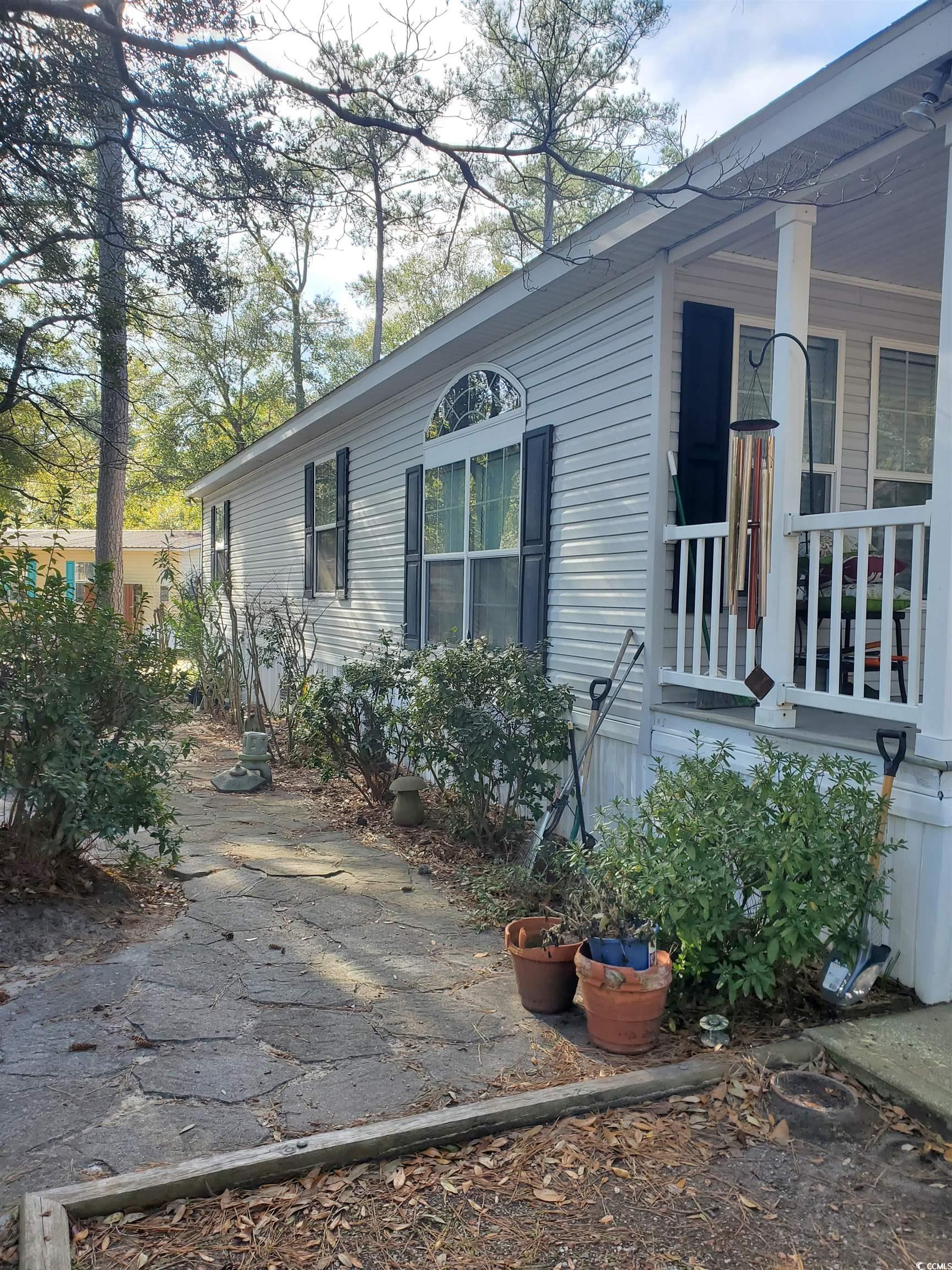 This well kept double wide has attractive pavers and landscaping. Home has a formal dinning room for entertaining. You can also unload all of your beach accessories in the back shed and relax on your front deck or side patio which has beautiful pavers and a water feature for added ambiance. There are no pictures of the inside because the owner is moving and there are boxes every where. The home is in great condition and will show well once all boxes are gone.