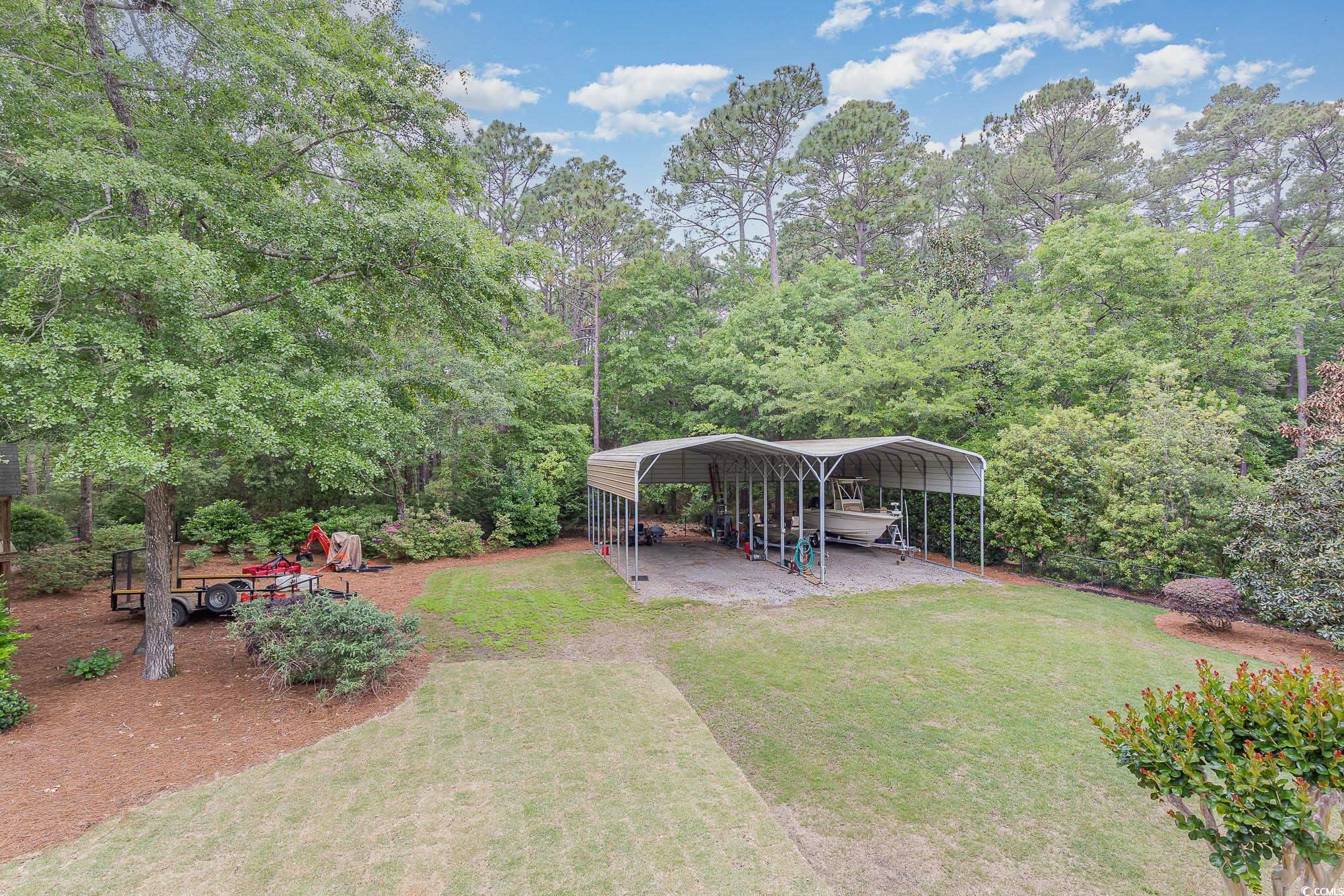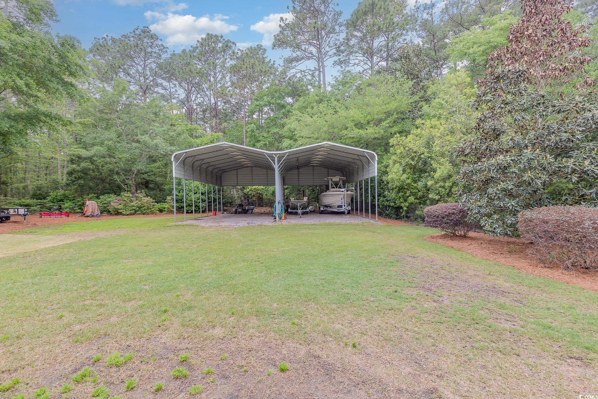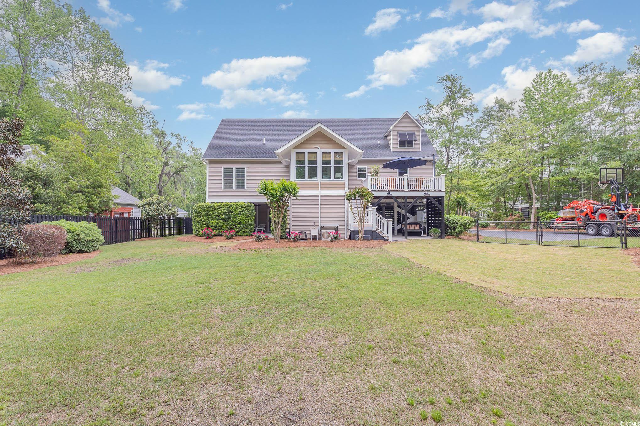 Calling all outdoor enthusiasts, golfers, and beach lovers! This raised beach house in Hagley Estates in Pawleys Island has so much to offer! This non HOA community is a quick golf cart ride to the beach or to Hagley Boat Landing to watch the sunsets. The 0.57 of an acre lot offers a 14-acre protected land trust that cannot be developed behind it, a 36 foot x 40 foot RV/boat pavilion with electric (50 amp service) and water, manicured landscape, an outdoor shower with hot/cold water, outdoor fish cleaning station with running water at utility sink, two covered sitting areas, a 12 foot x 16 foot deck and we havent even gotten to the inside yet! The inside offers three levels of living space. The first level offers garage space and a separate entry bedroom/office with a full bathroom! There are additional storage areas on this level as well. The main level of the home includes 3 bedrooms, a living room, dining space, kitchen with granite countertops and stainless steel appliances, and an amazing sunroom that overlooks the spacious fenced in backyard. The third level encompasses the primary suite. A large bedroom with sitting area, ensuite bathroom plus a huge bonus area for exercising, crafting, or whatever your heart desires! A half bath rounds out the top floor. This is a must see for anyone wanting privacy, space, and room for your outdoor toys! Pawleys Island offers pristine beaches, plenty of five-star restaurants, shops, and ten top rated golf courses.