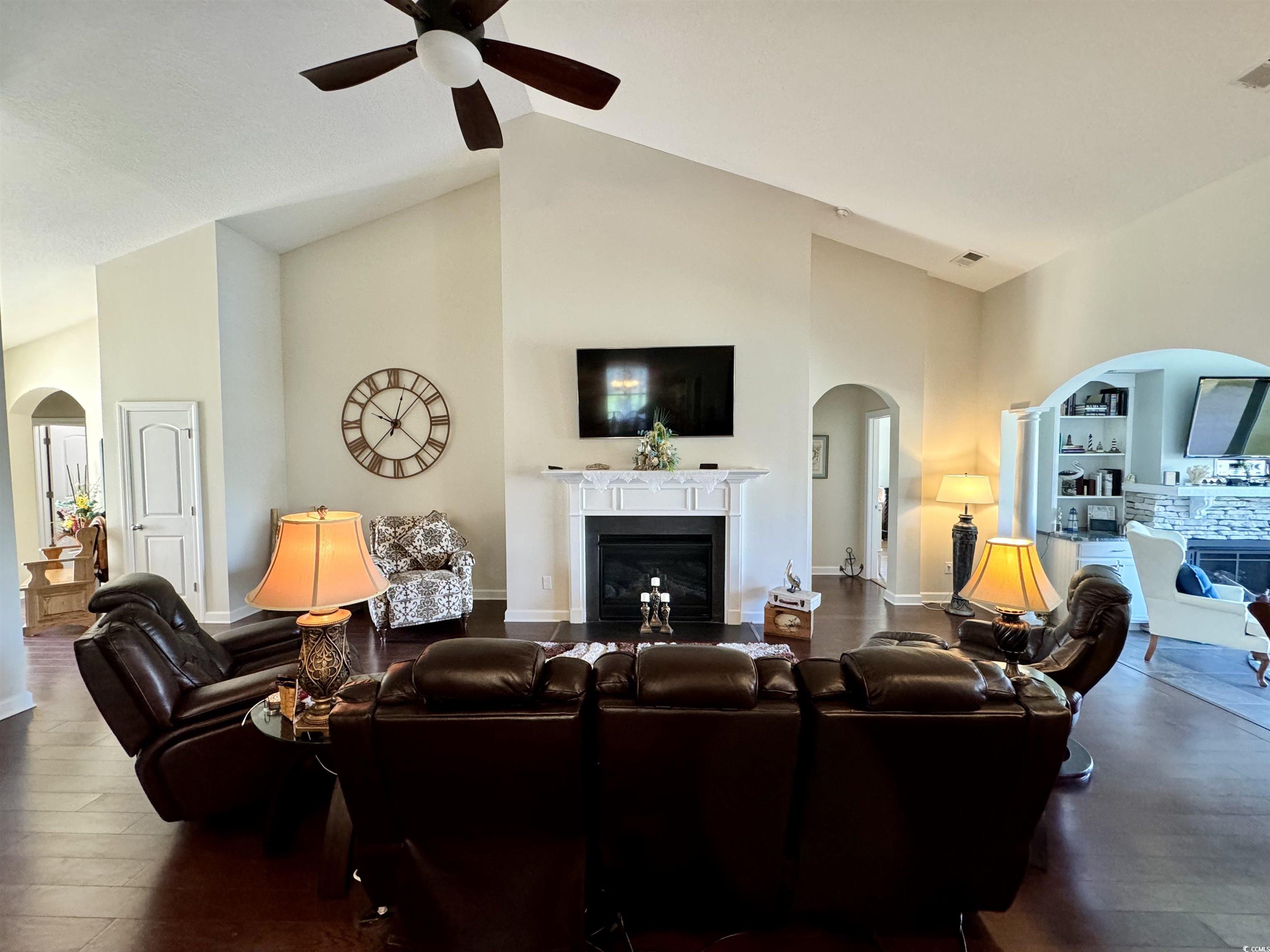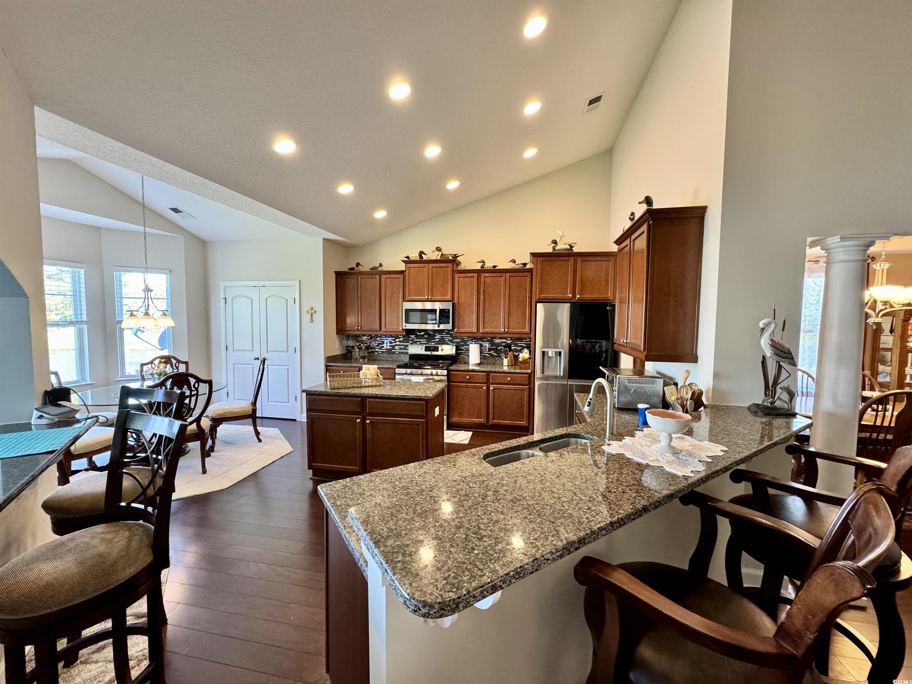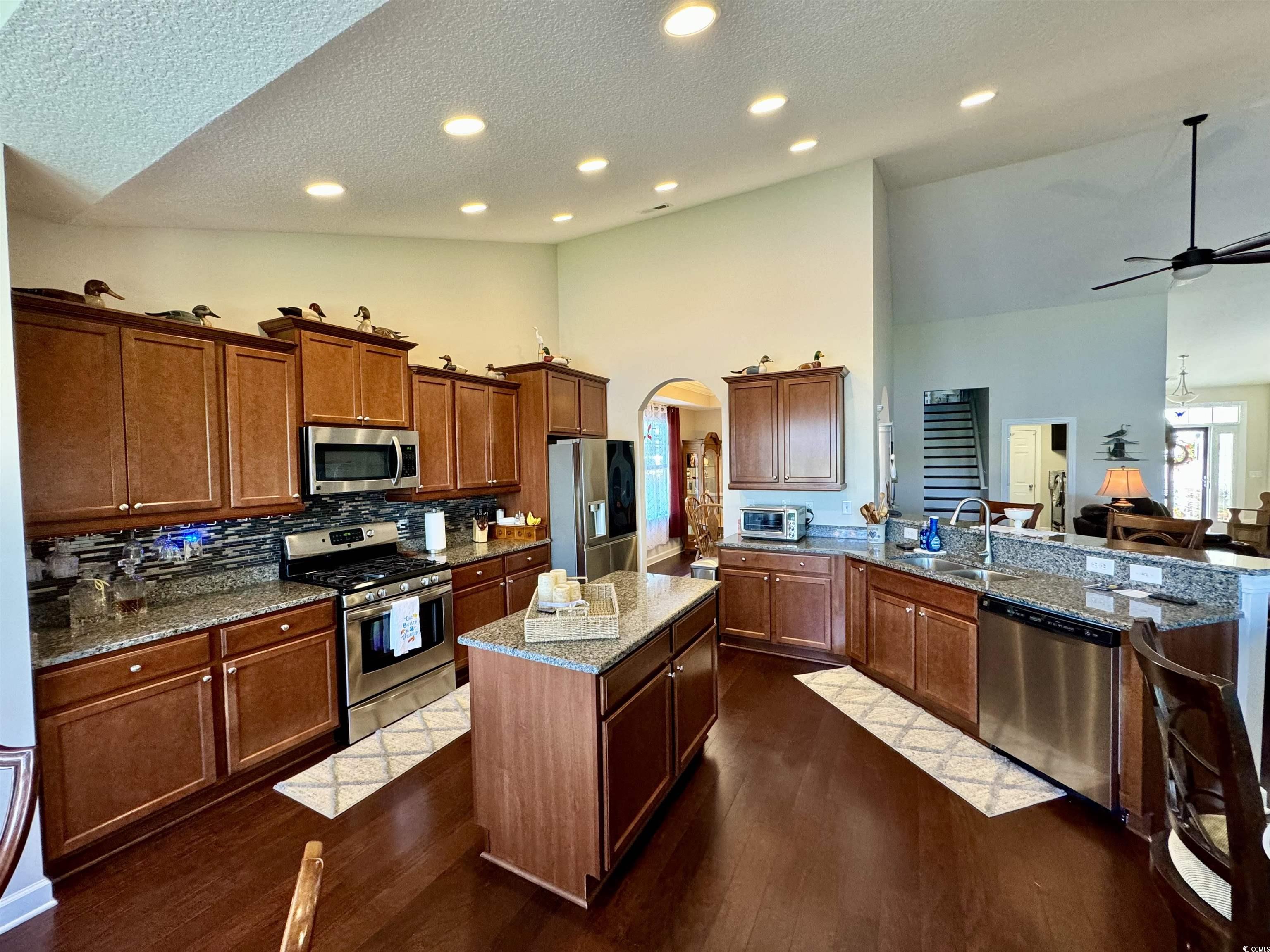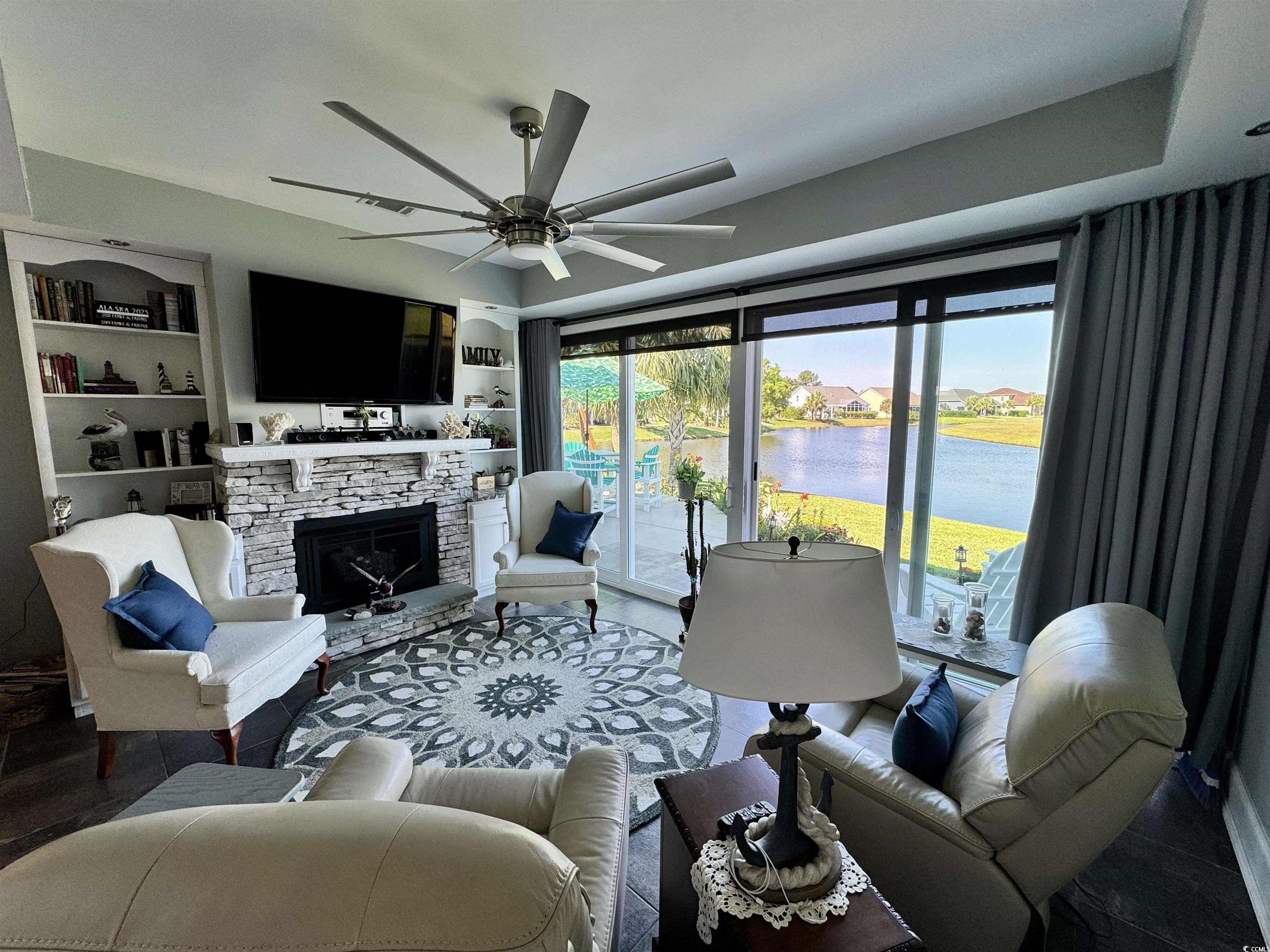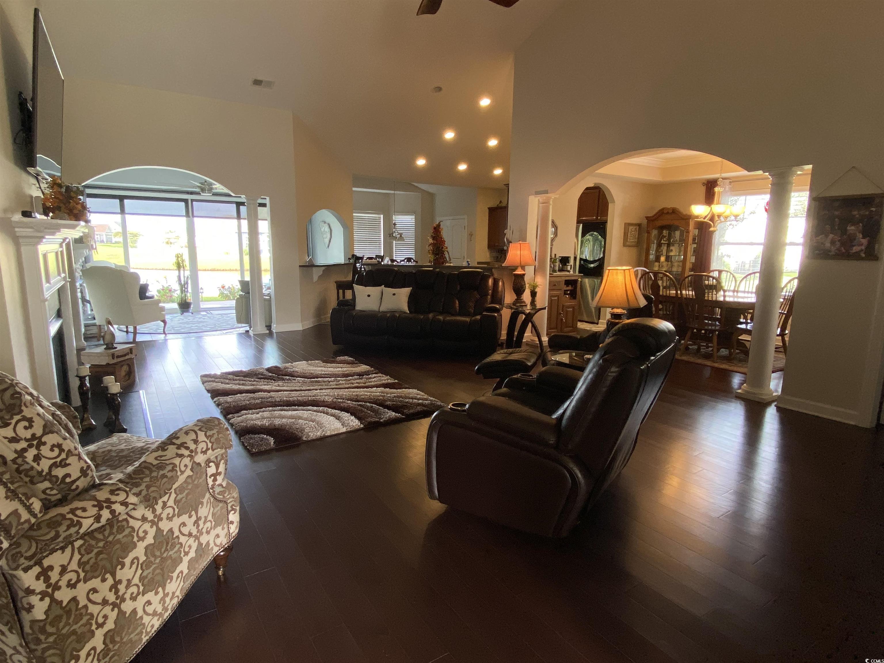 This MAGNIFICENT 4BR 3 BA cul-de-sac home in the gated neighborhood of Brighton Lakes in Myrtle Beach is truly a must see! The yard is so meticulously manicured and the lake views are amazing that surround 3 sides of the home. Sit back in the newly converted sun room as you watch the swans play in the water just outside your door and enjoy views of water fountains and stunning sunsets. A new roof was installed in 2023 along with Solar Panels which reduce the electric bill. There is an extra large garage, custom master suite, an office, outdoor accent lighting, irrigated flower beds and yard, 2 gas fireplaces, gas range, attic solar fans, and much, much more. The neighborhood has a large amenity center, swimming pools, gym, and a playground. Brighton Lakes is near schools, walking trails, outlet mall, restaurants, shopping, and a short drive to the beach. This home has it ALL!