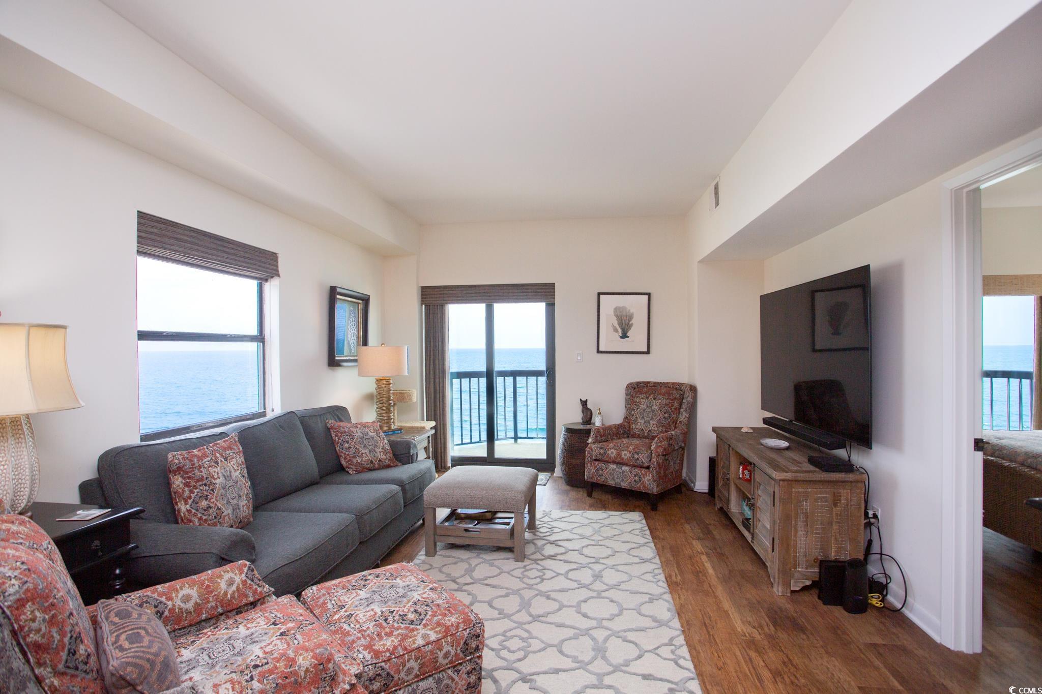 Stunning 2-story ocean front penthouse condo located in Garden City Beach, SC. This 3 bedroom, 3 bathroom condo offers a spacious beach retreat including two panoramic ocean front balconies and a primary suite that occupies the whole 2nd floor. The main floor features two bedrooms, one of which could be a junior primary suite with balcony access, kitchen, dining room and ocean front living room. The downstairs balcony can be accessed from either the living room or the junior primary suite. Details in the kitchen include dentil crown molding, stainless steel appliances, updated cabinets and granite countertops. Imagine waking up to views of the ocean through wall-to-wall, floor-to-ceilings glass windows or enjoying coffee in the sitting area or private balcony. You can do all of these things from the primary suite. In the primary suite, you will also find a primary bathroom featuring dual vanities, granite countertops and a spacious garden tub. During their ownership, the sellers have made several updates including some new furniture, replacing all glass door, all new window shades, motorized window shades in the primary bedroom, new decking on the upstairs balcony, new carpet on the downstairs balcony, new HVAC in 2022 and new washer and dryer. Reflections is a smaller building (6 floors and 18 condo units) located on the north end of Garden City Beach, SC. Amenities consist of an elevator, outdoor pool and covered and uncovered parking. The building is also a short distance to the Garden City Pier, Surfside Beach Pier or the Marshwalk in Murrells Inlet. Upcoming building updates: the building exterior will be painted, any siding repairs made, awnings removed and shutters added. Schedule a private tour of this exceptional condo today!
