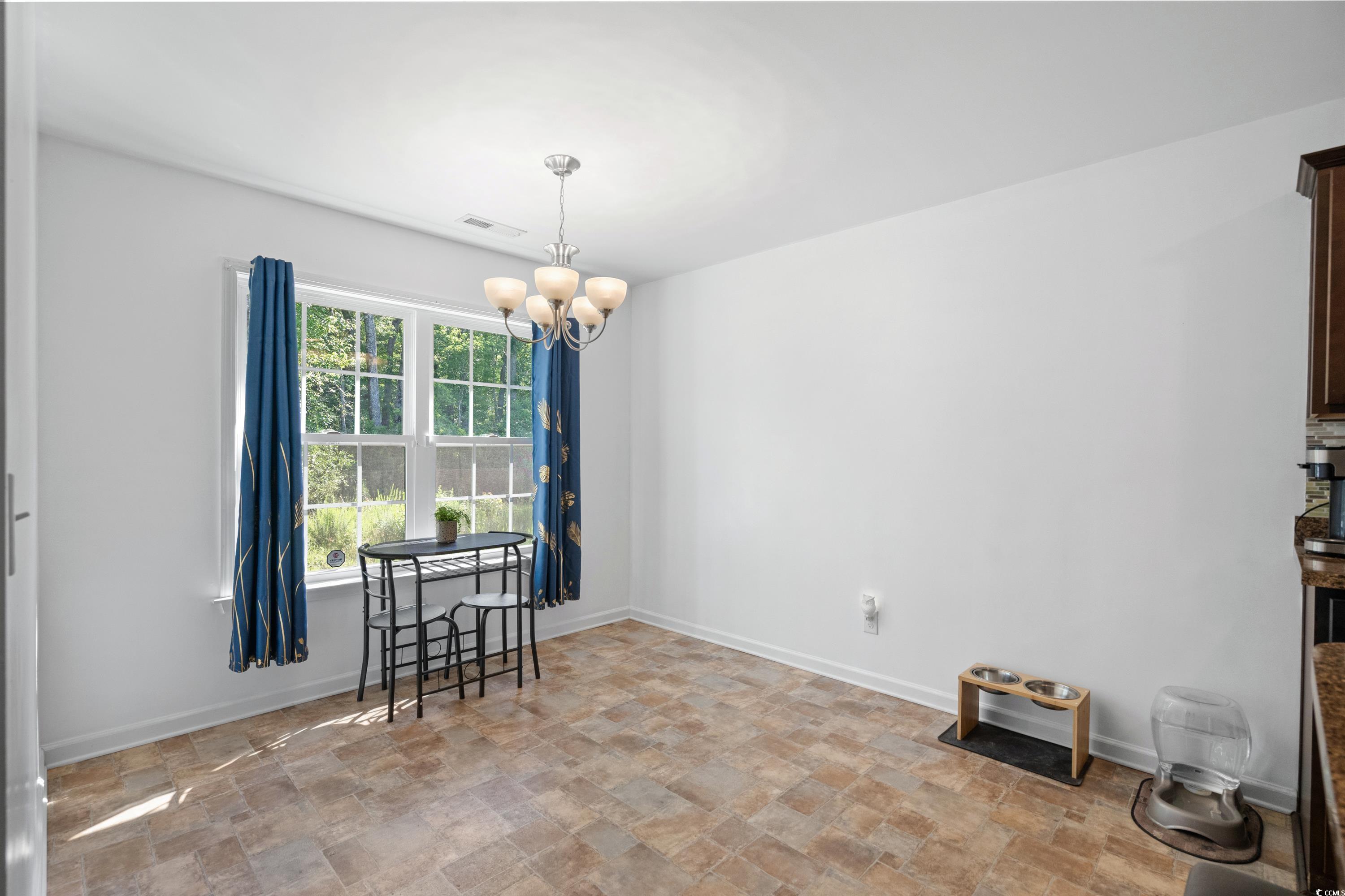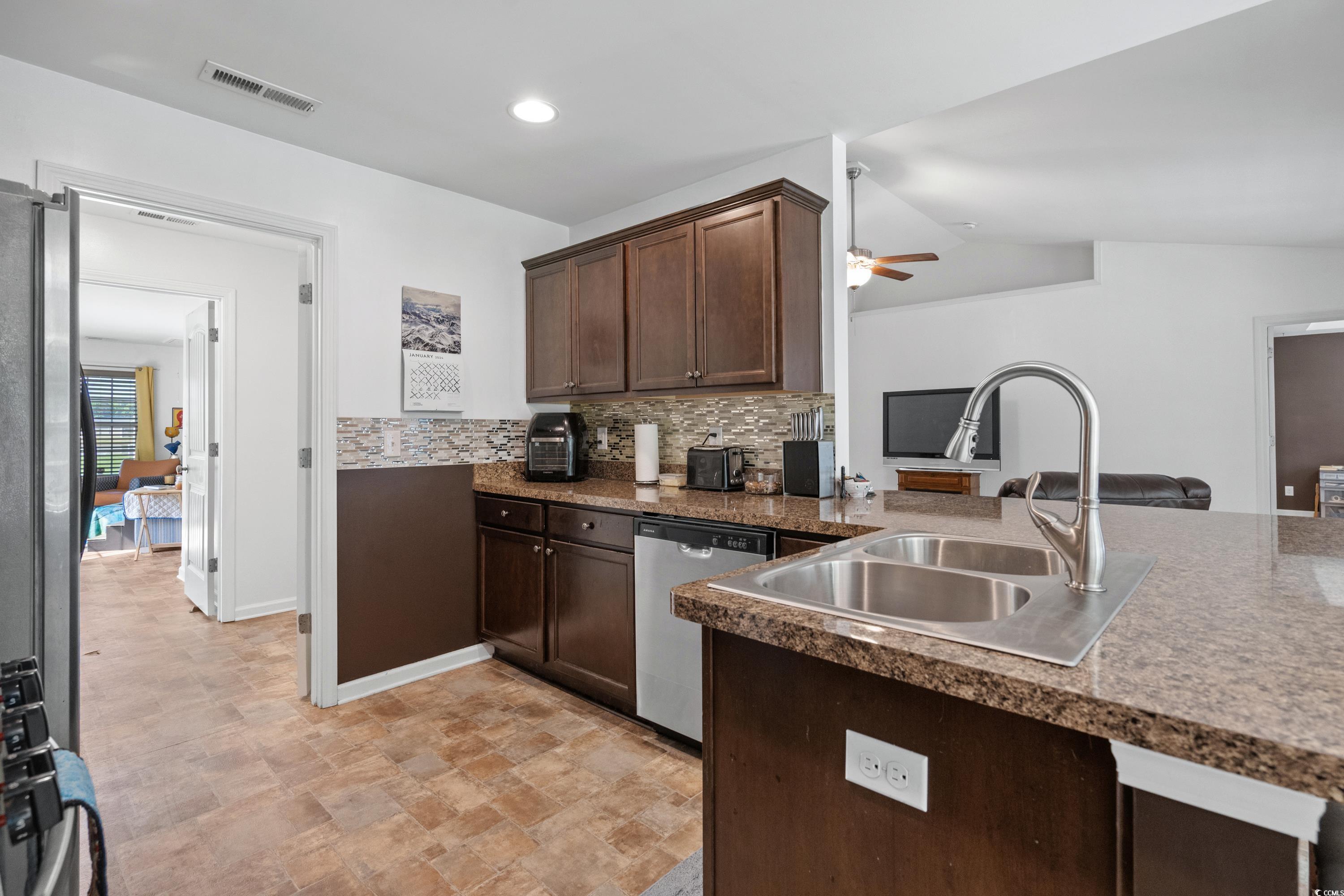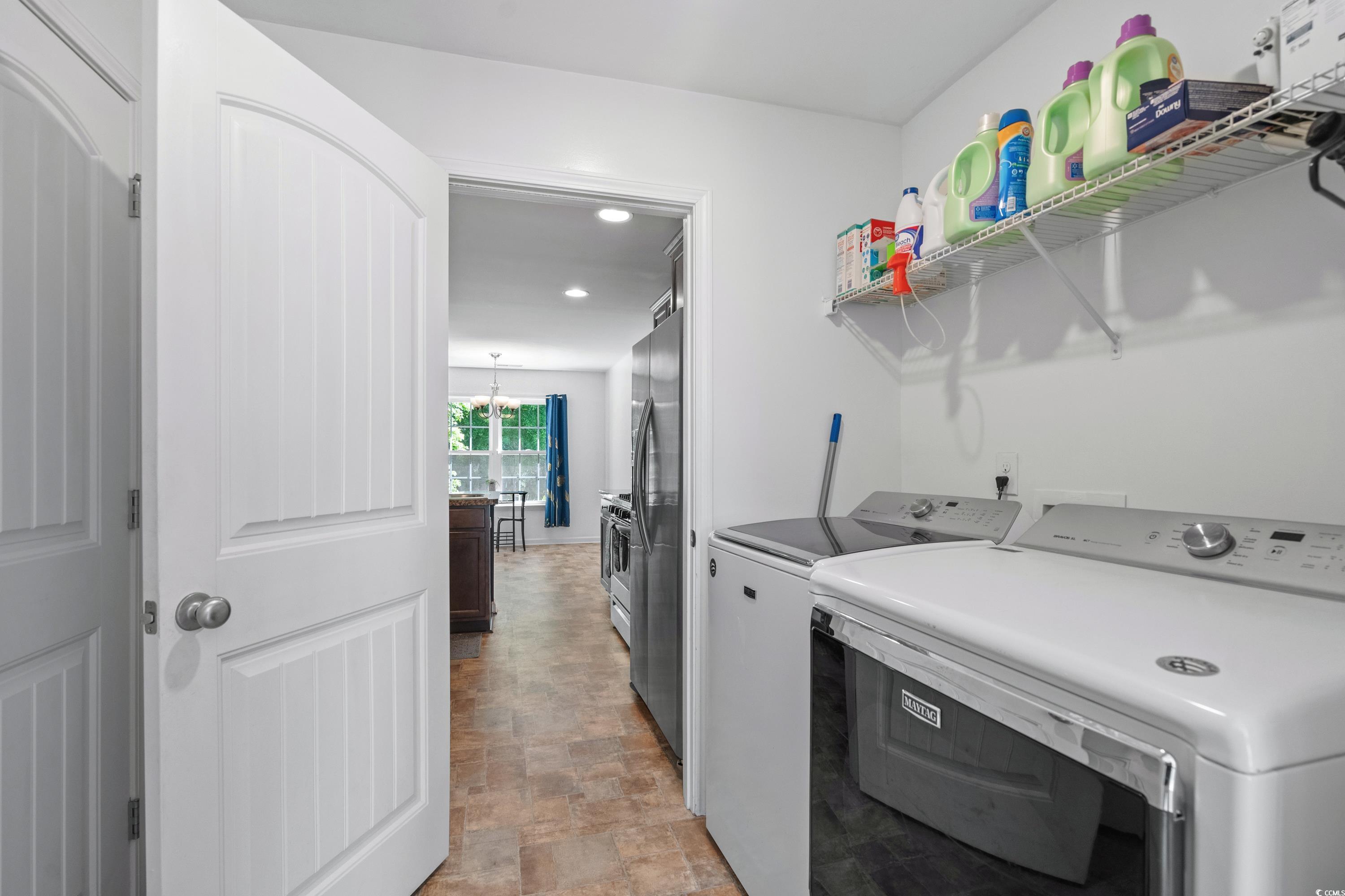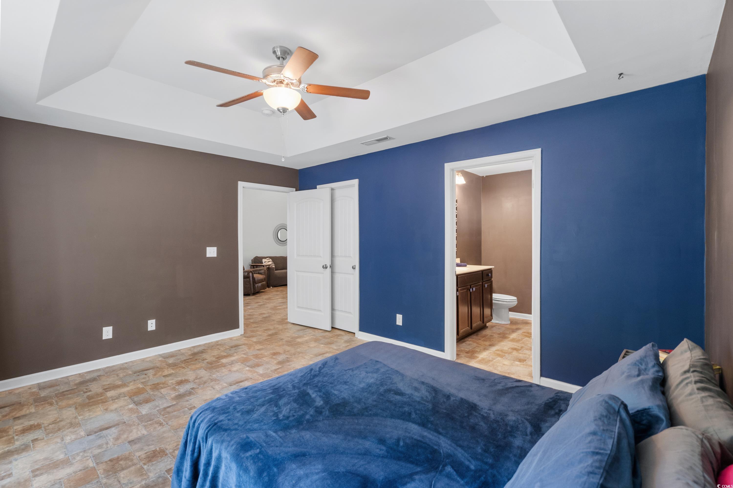 Welcome to this charming 4-bedroom, 3-bathroom home nestled in the sought-after community of Woodland Lakes. As you enter through the foyer, you're greeted by a spacious main living area featuring a vaulted ceiling adorned with a fan, and an abundance of windows flooding the space with natural light, creating an inviting atmosphere for entertaining guests. The kitchen and dining area boast seamless flow, with beautiful dark cabinets that add a touch of elegance to the room. Ample counter and cabinet space make organization a breeze, while the breakfast bar provides a convenient spot for quick meals. The master bedroom is a sanctuary of its own, complete with a vaulted ceiling and a private ensuite bathroom, offering a perfect retreat after a long day. Two additional bedrooms, each equipped with ceiling fans, share a well-appointed bathroom, ideal for accommodating both residents and guests. A unique feature of this home is the fourth bedroom, which doubles as a mother-in-law suite with its own private entrance. This spacious suite offers flexibility for various living arrangements and includes its own ensuite bathroom. Convenience is key with a laundry room just off the kitchen, making chores a breeze. Step outside onto the screened porch and bask in the tranquil sounds of nature, from morning birdsong to evening crickets. The back patio provides an ideal space for outdoor entertaining. The lot backs up to mature woods adding privacy. For those with a green thumb, a garden awaits providing an opportunity for gardening enthusiasts to cultivate their own oasis. Nearby, a firepit beckons for cozy gatherings and roasting marshmallows under the stars. Woodland Lakes is also a natural gas community. Woodland Lakes offers the perfect blend of suburban tranquility and urban convenience, with easy access to Downtown Conway and the riverwalk, as well as being just 20 miles from the pristine shores of the Atlantic Ocean. Don't miss your chance to call this meticulously crafted home yours! Buyer is responsible for verification