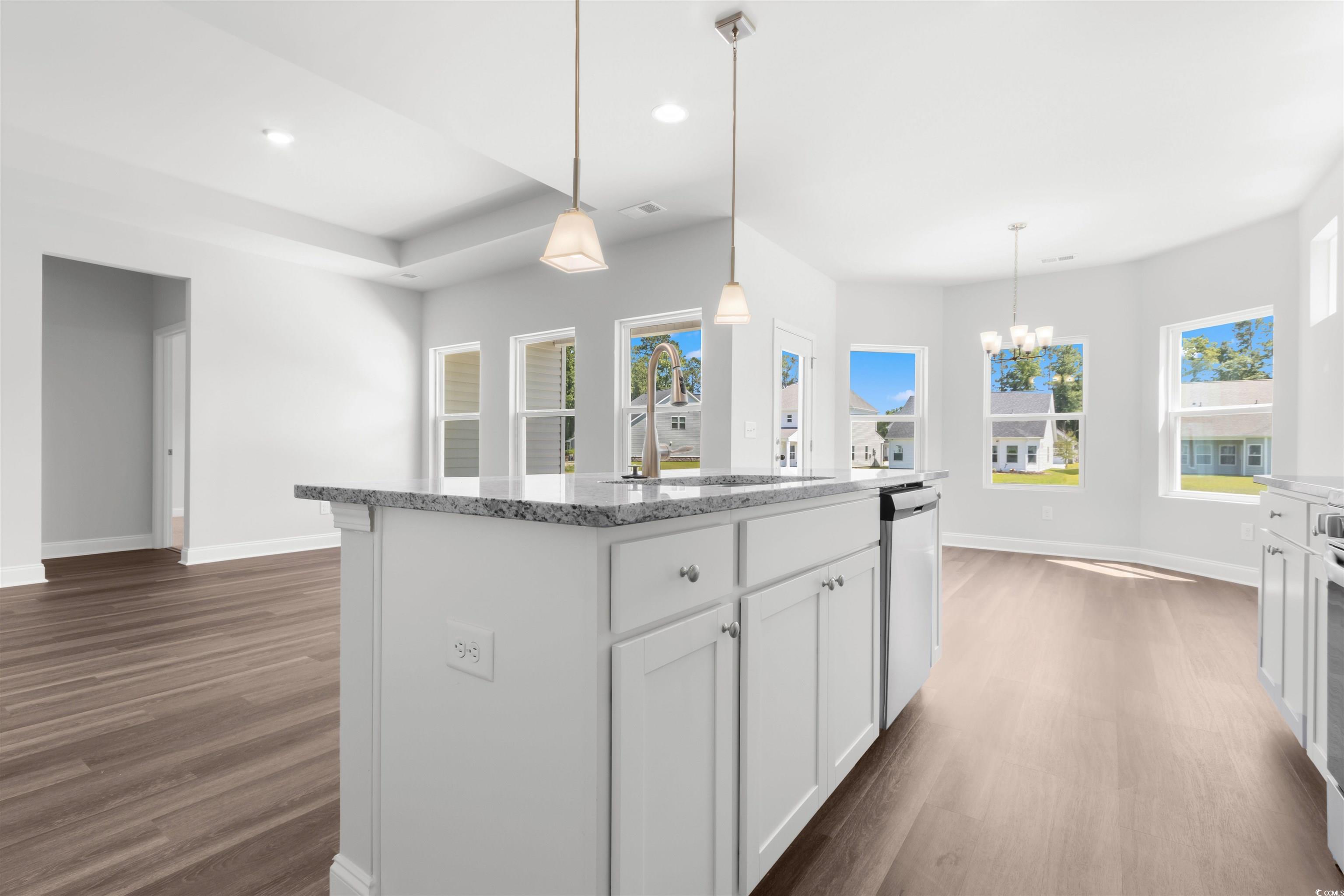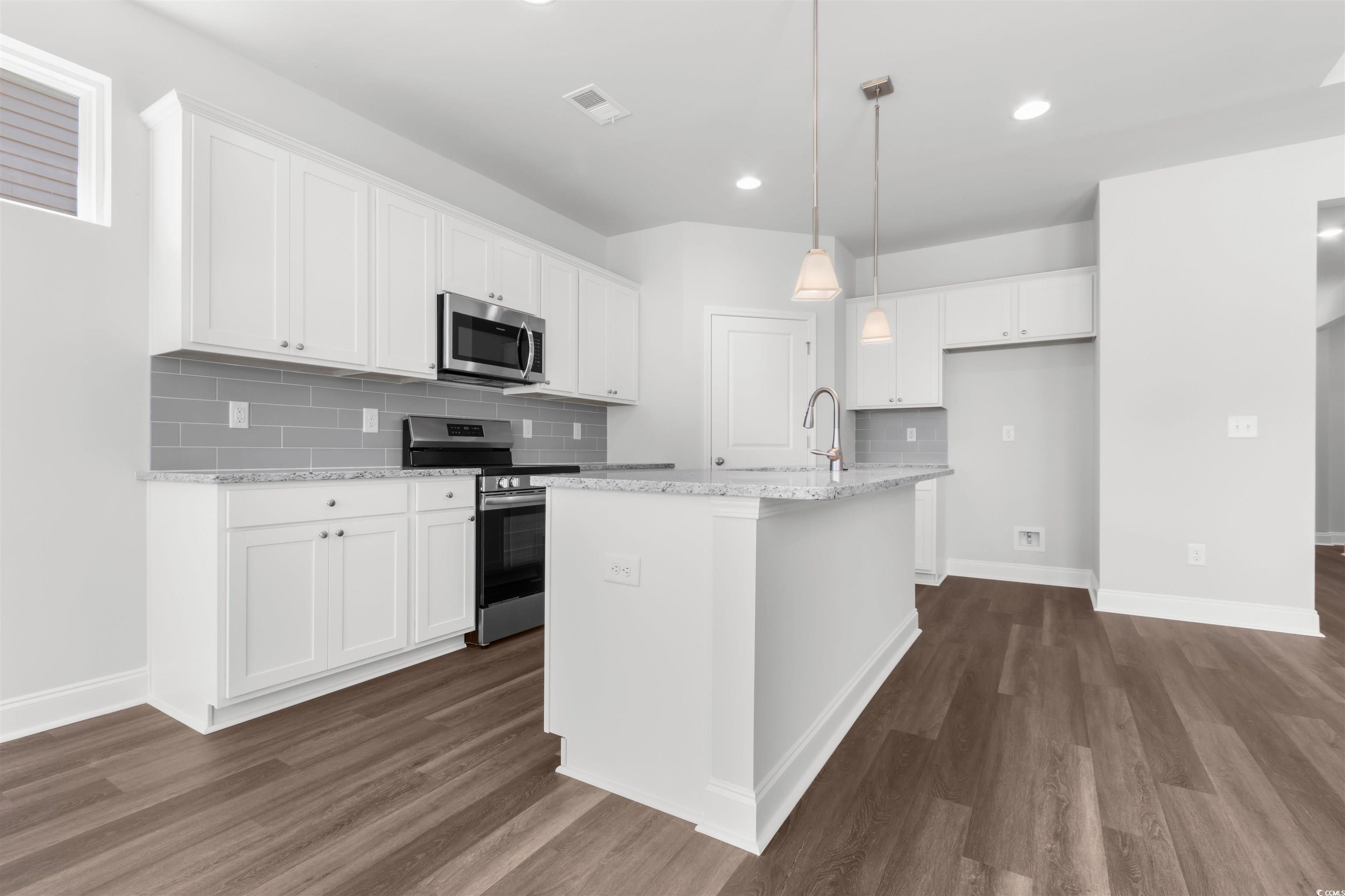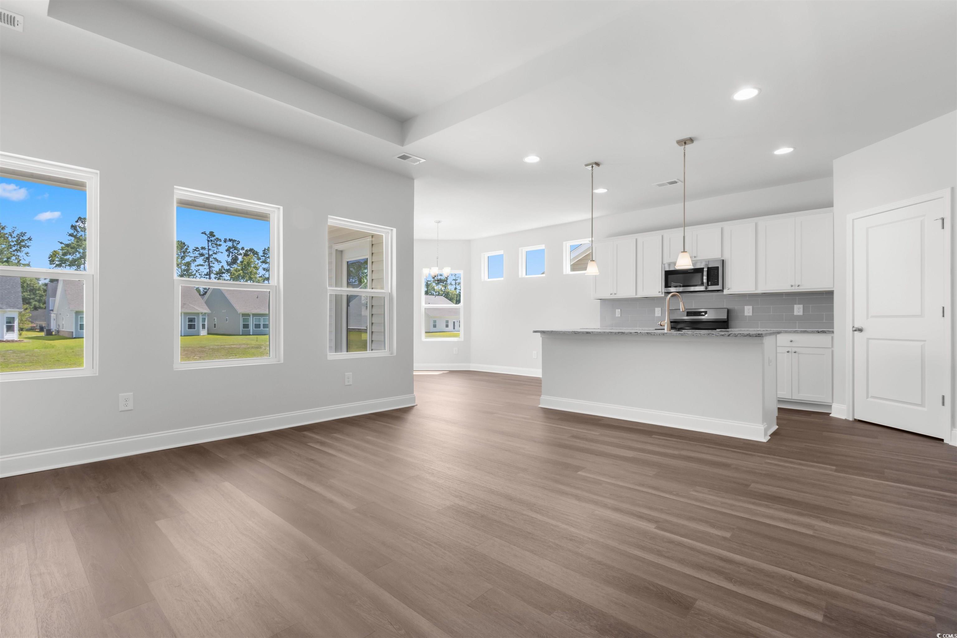 Introducing The Harmony, a thoughtfully designed one-level home that combines modern upgrades with functional living spaces. This beautiful 3-bedroom, 2-bathroom home features a spacious layout, with a welcoming foyer entrance that leads into an open-concept living area full of natural light. The common areas are enhanced with upgraded Mohawk laminate flooring, offering durability and style, while the bathrooms feature elegant tile flooring. The home boasts 9-foot ceilings throughout, with tray ceilings in both the living room and the primary bedroom, creating an airy, expansive feel. A versatile office/flex space provides the perfect spot for a home office, gym, or creative area. The well-appointed kitchen and living room seamlessly connect, providing the perfect space for entertaining or relaxing. The primary suite is a true retreat, complete with a tray ceiling and a bathroom with a spacious walk-in closet. The home also includes comfort-height toilets for added convenience and storage access in the garage to keep everything organized. Step outside to enjoy the serene covered back patio or unwind on the charming front porch, adding curb appeal and an inviting space to relax. In addition to its stylish features, The Harmony comes equipped with irrigation to keep your lawn lush and vibrant year-round. This home is a perfect blend of modern amenities, thoughtful design, and comfort, offering a tranquil and functional space for everyday living. Spring Oaks is a beautiful new home community offering natural gas homes, blending comfort with sustainability. Ideally located near Historic Downtown Conway, residents enjoy easy access to the Riverwalk, local restaurants, shops, and the stunning coastal beaches. Its the perfect spot for modern living with the convenience of nearby attractions. Photos are of a representative model and the home has an estimated May completion.