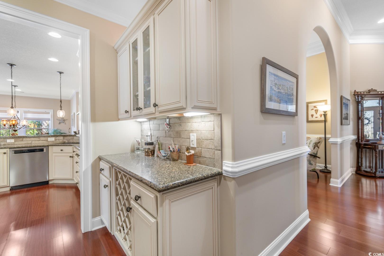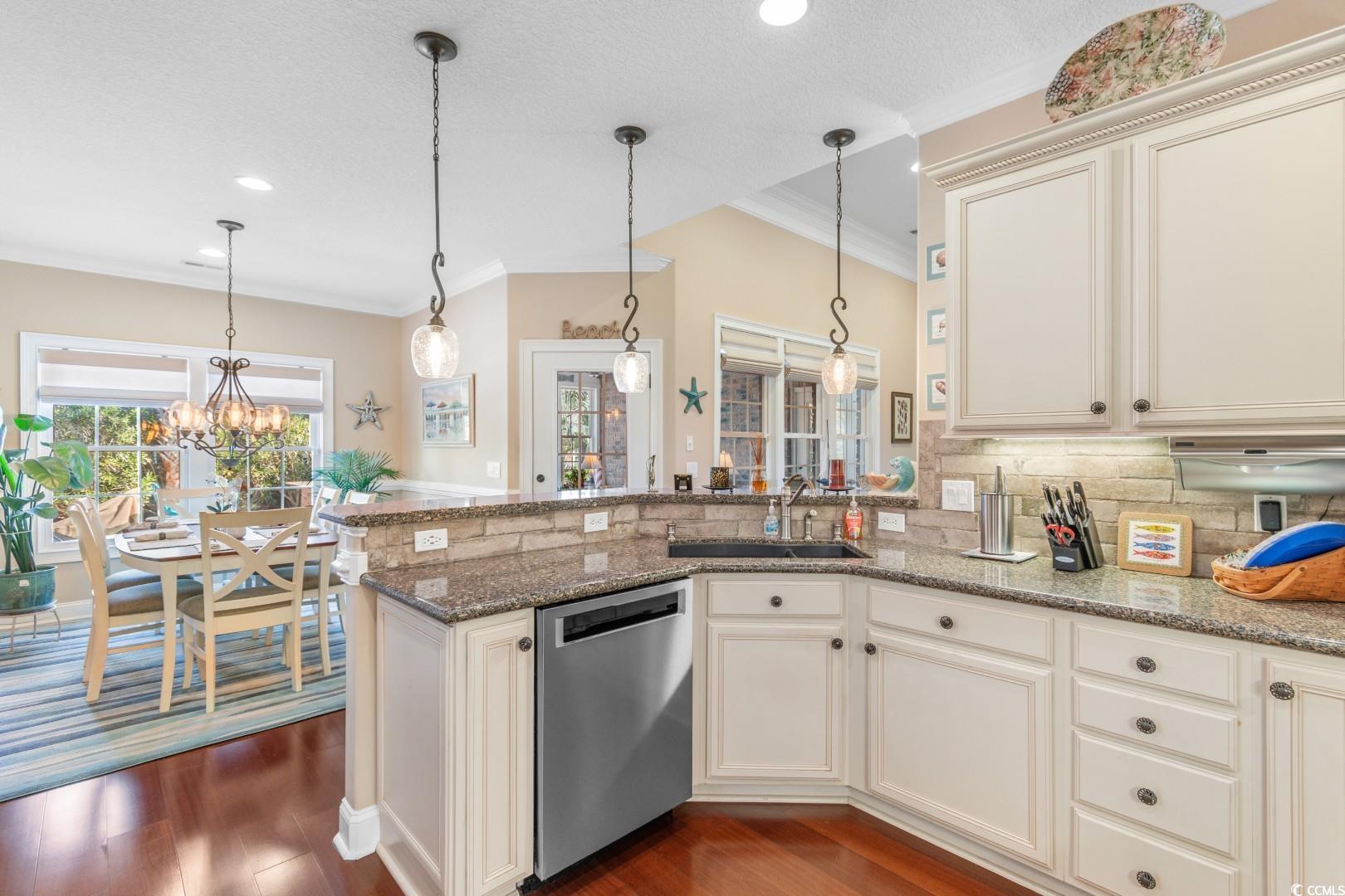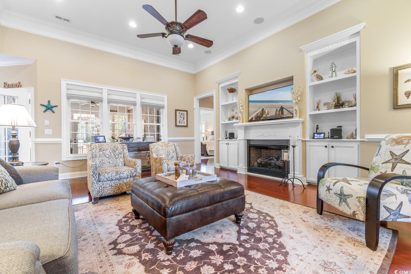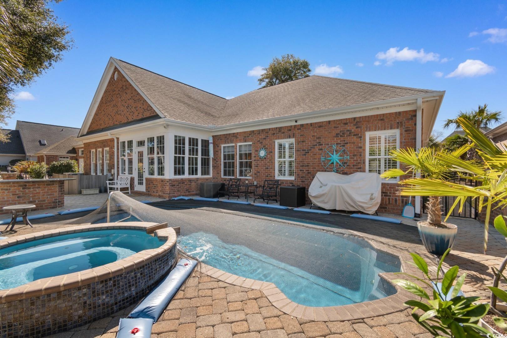 Step into a thoughtfully designed interior featuring 12' ceilings in the great room, foyer, and formal dining area, a coffered ceiling in the dining room, a vaulted ceiling in the front bedroom, and a tray ceiling in the master suite. Crown molding runs throughout the home, complementing the rich hardwood floors and porcelain tile baths. Each bathroom boasts full tile showers with frameless Shower Guard specialty glass and granite countertops, while the master bath offers a garden tub, double vanity, and a fully customized closet. The gourmet kitchen is a chef's dream, featuring custom cabinetry, Silestone countertops, a wall oven with a separate cooktop, soft-close drawers, 42"" wall cabinets, and a large breakfast bar. The adjacent breakfast room is spacious enough for a full-sized table. A wet bar with a fridge in the bonus room adds to the home's entertainment appeal. All kitchen appliances and the security system convey. Significant updates have been made to enhance the home's appeal. In 2018, the interior was painted, granite countertops were added in the bathrooms, lighting fixtures in the kitchen and baths were updated, and a new kitchen backsplash was installed. In 2019, the pool was resealed, and a new heater was installed. Most recently, in 2024, a new HVAC system was added. Additionally, the porch was enclosed with climate control, increasing the heated square footage to 3,100. Seaside Plantation is a highly sought after gated community with a resort style community pool & clubhouse, located in the heart of North Myrtle Beach, close to all of the area's famous dining, shopping, golf, and entertainment attractions. You won't want to miss this. Schedule your showing today.