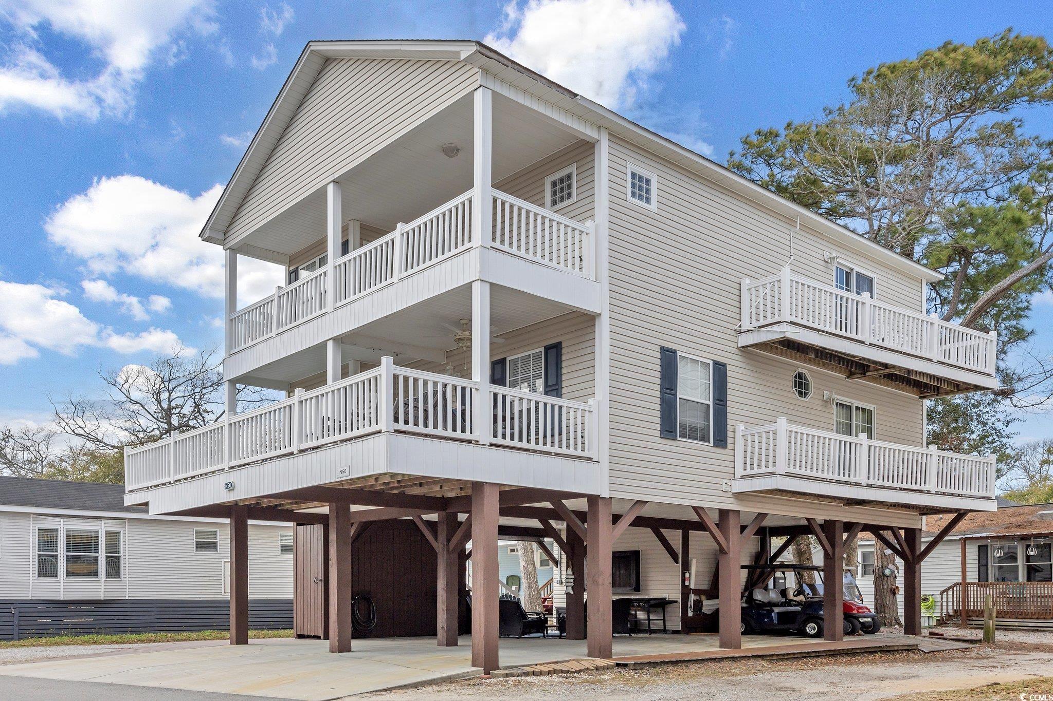 Grab your swimsuit and come indulge in all that Ocean Lakes has to offer along the Grand Strand. All you need is your personal items with this furnished home. This open 4 bedroom, 3.5 bath home is ready to make memories for years to come. Featuring large spacious bedrooms, with a master on each floor, you also have 4 decks around the house for sunning, hanging out and enjoying the shade and breeze year round. The home at N50 also features many recent upgrades like new furniture, upgraded LVP flooring throughout, new main decking and fresh paint inside. There is plenty of parking underneath the home for you and your guest, a recently added entertainment area with seating and tv and also a storage garage for your beach toys and extras. Located centrally in Ocean Lakes, you can access the store, snack shack and even the arcade and water park all within walking distance if you choose. Did we mention Lazy River, water slides, indoor pool, putt-putt, and recreation center with daily activities? The ocean is a straight shot from either end of the street. Hop on the golf cart or your bicycle to go explore and take in the beauty of Ocean Lakes and enjoy activities and events around the year. This home would be great to live in full time, or even used as a second home and rental property. The openness of the main floor makes for great game nights and socializing with your friends and family. The fully stocked kitchen is ready for all occasions and hosting meals for many. N50 also has excellent rental income history because of how well maintained it has been kept. There is no HOA in Ocean Lakes, but there is a yearly lot lease paid half in January and half in July. Ocean Lakes offers 24 hour security, gated entry, a mile of beach front, activities year round for all ages and amenities for everyone. Come see for yourself all that Ocean Lakes has to offer and compliment this well designed home. Schedule your showing today!