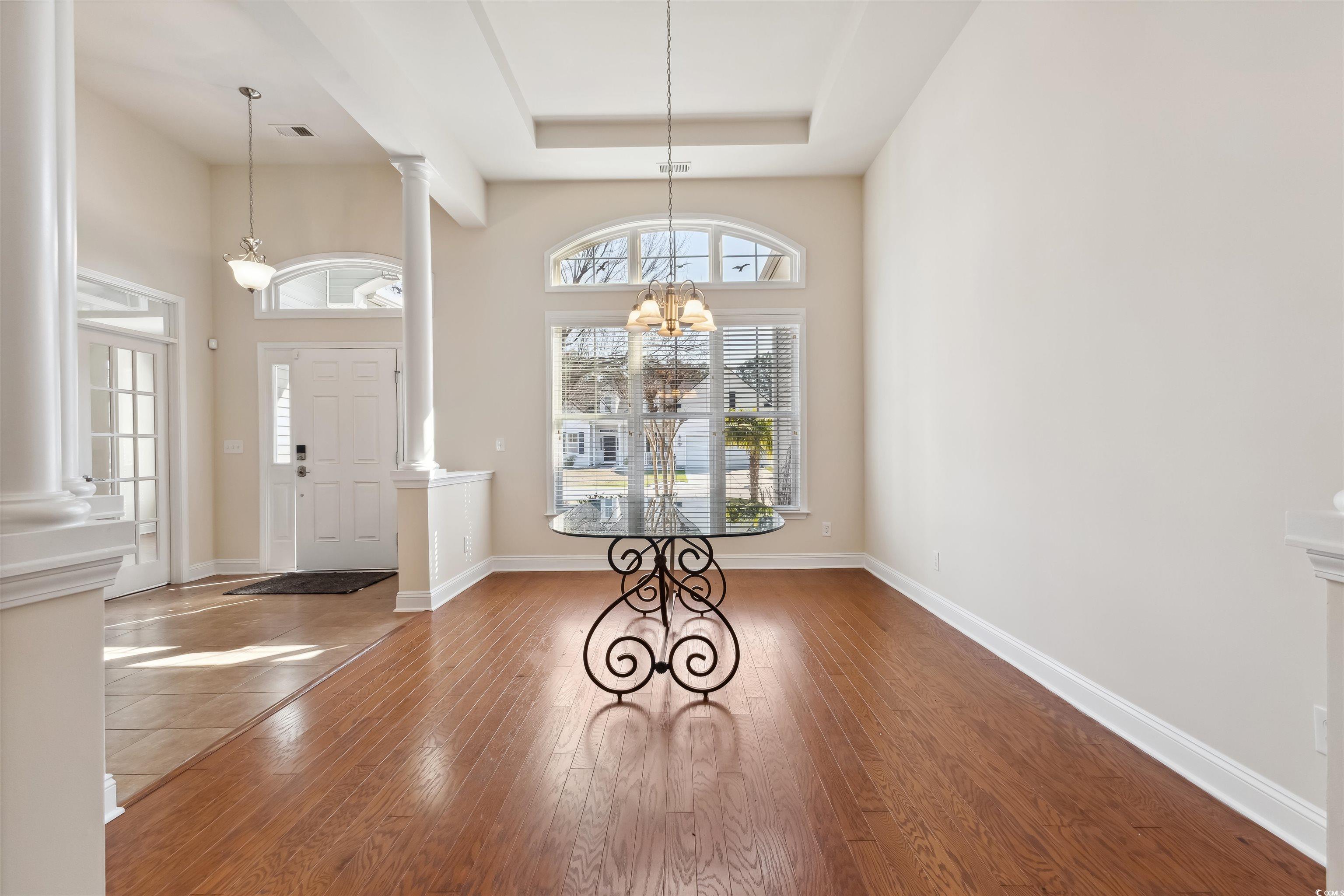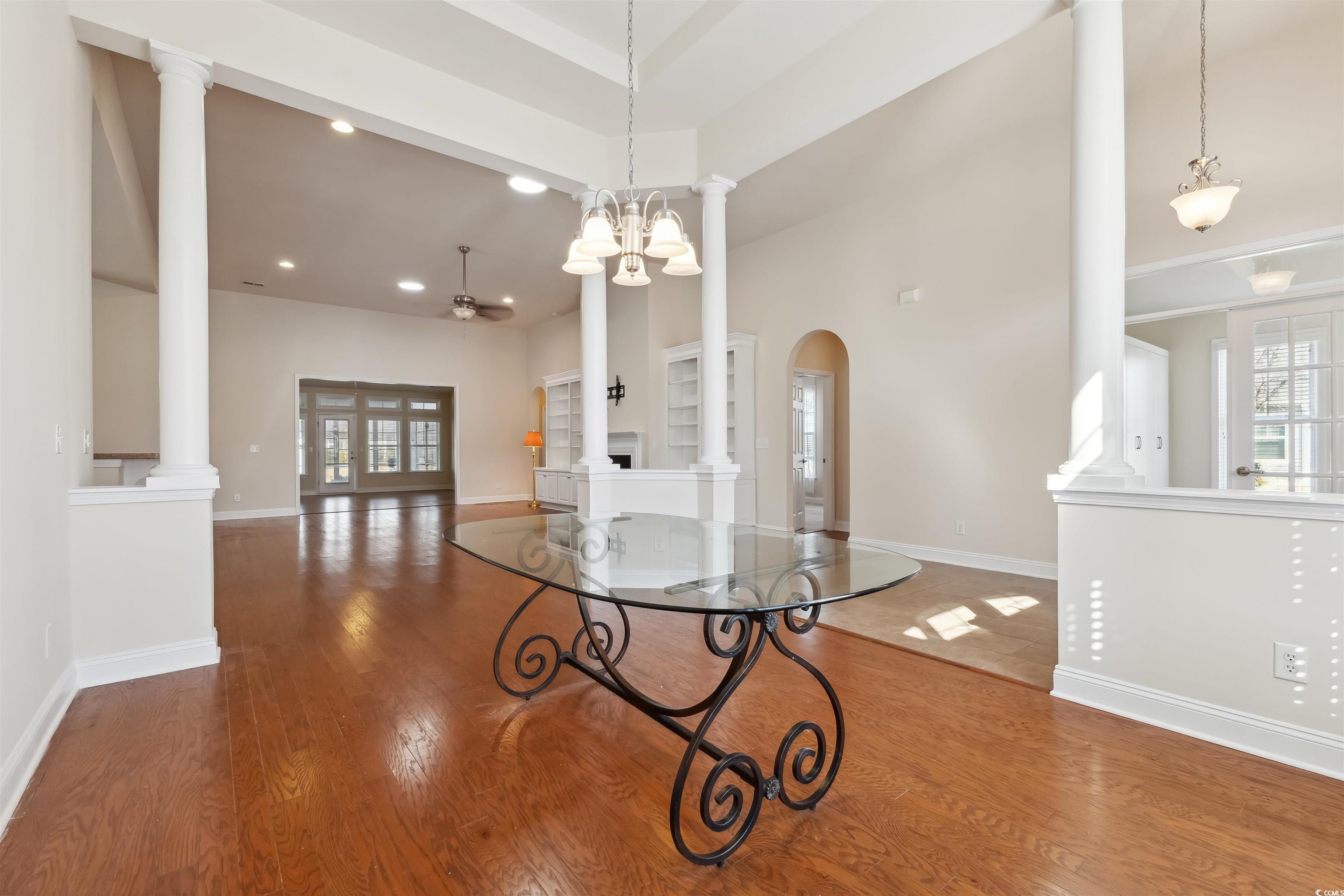 Welcome to 1106 Dowling St located in the Berkshire Forest community of Carolina Forest. Your new home boasts potentially 5 bedrooms, 4.5 bathrooms, over 3400 heated square feet and is situated on a 0.25 acre pond view lot. As you enter through the foyer, the 12 foot tall, expansive living area with built ins and fireplace is filled with an abundance of natural light. The formal dining room is the perfect place to share those special meals prepared from the very spacious and storage a plenty filled kitchen with double ovens. 2 primary suites are situated on the main floor as well as another secondary bedroom and an office/flex space that could be the 4th bedroom downstairs. The heated and cooled sun room leads you to the three season screened patio that starts your outdoor oasis. Upstairs above the garage is your bonus room with attached bathroom that could be your 5th bedroom or media/flex space. The 2 car oversized garage has the optional extension to fit even the extended vehicles. Amenities in this community includes 2 large community swimming pools, fitness center, lighted tennis courts and basketball courts, Community meeting rooms with kitchens, large screened porch with tables and seating overlooking the pool, splash pad for the kids, childrens playground, and a large fresh water lake. Do not let this opportunity pass you by, make your appointment to view this spacious magnificent home today.