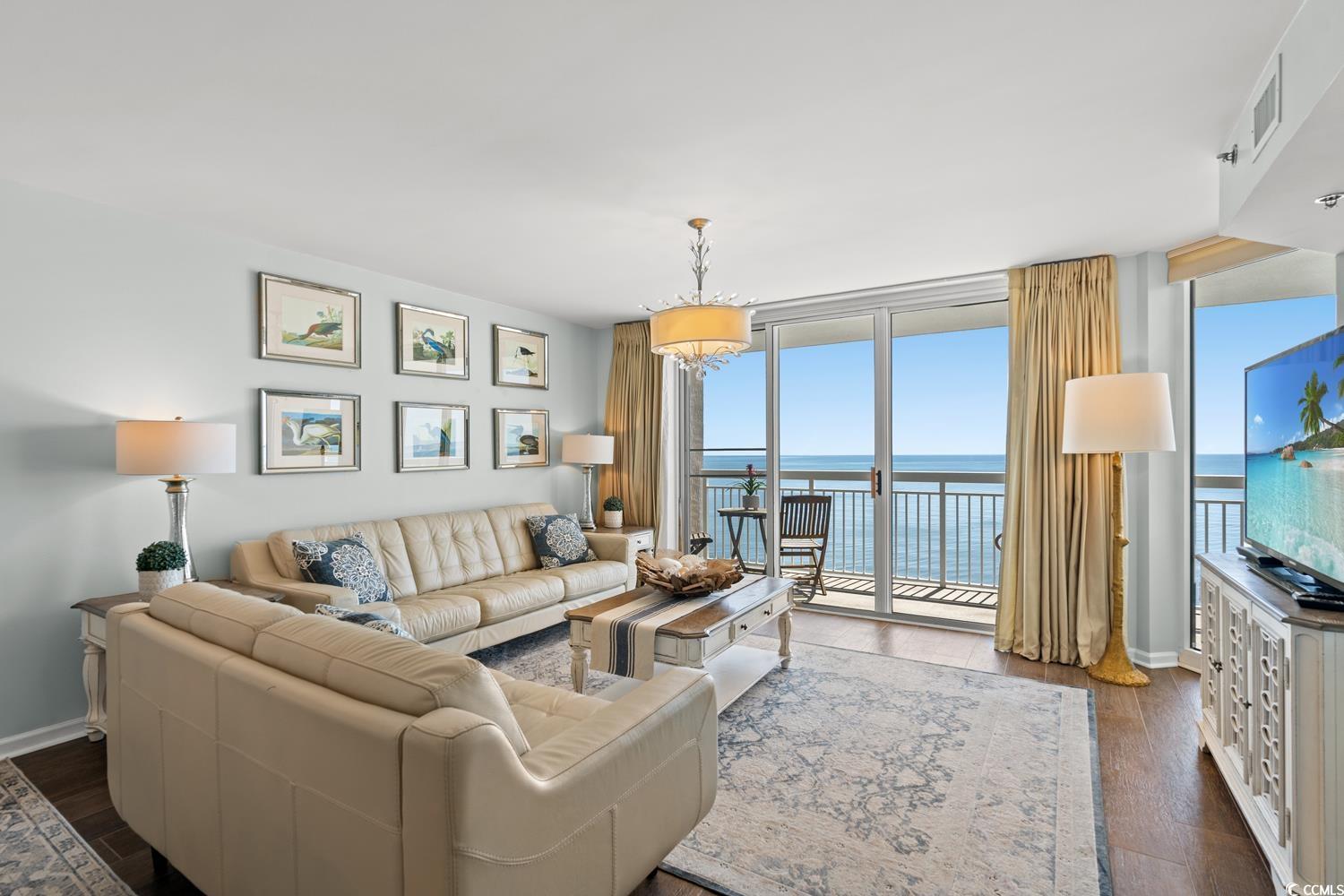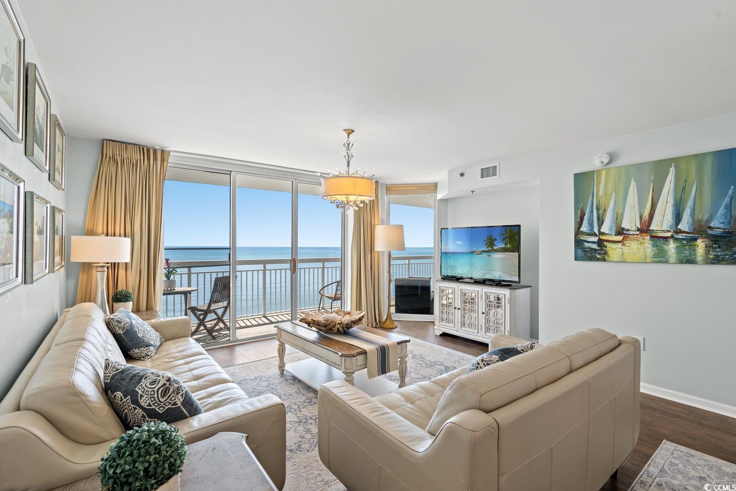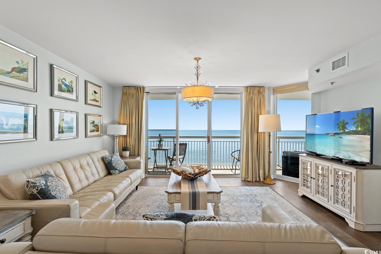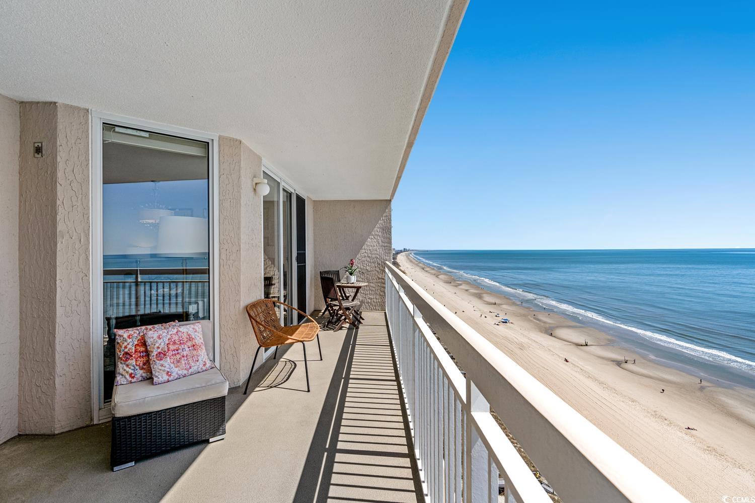 A spectacular 4-bedroom 4 bathroom unit in Crescent Shores directly oceanfront in North Myrtle Beach. This unit was used as a primary residence for the past 7 years. During this time, the owner customized the entire unit from ceilings to floors, making it unique to the building. Some of the extraordinary additions include a stunning kitchen with custom cabinetry for extra storage and glass cabinet doors for display purposes. Flat ceilings and ceramic tile throughout the entire unit. Custom drapes, light fixtures, furniture and artwork gives the unit a luxury designer feel. All the appliances were updated during the owners residency, as well as the hot water heater. The very latest addition was a brand-new HVAC installed in March 2025! The direct view of the Atlantic Ocean is outstanding from the kitchen, living room and primary bedroom. The oceanfront balcony is very spacious and offers ample room for an outdoor sofa and chairs. The unit offers large closets in every room, including a walk-in closet in the primary bedroom and an outdoor storage room just off the entryway. Do not miss this opportunity to own in a top-rated building offering all the desired amenities, as well as a turnkey unit that includes designer quality furnishings with all the bells and whistles! It is a great location near all the Beach's finest shopping, dining, golf, and entertainment. Excellent rental income for investment, second home or enjoy as a beach primary residence. Turn Key.