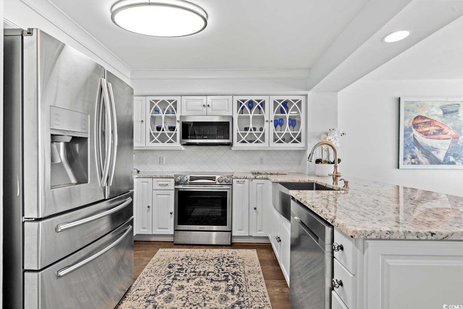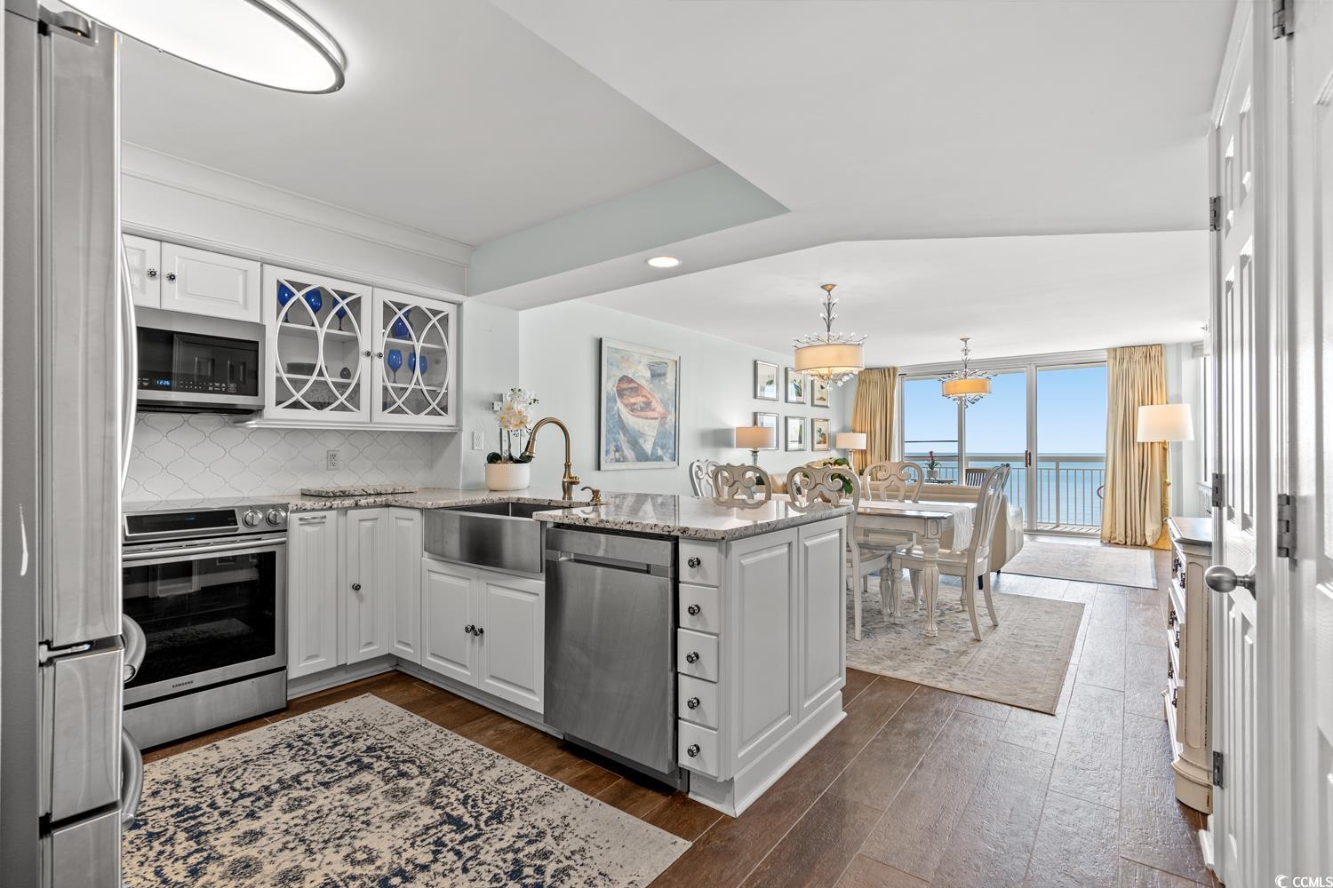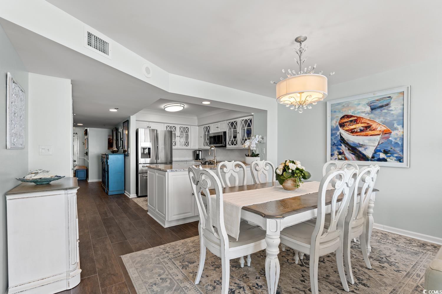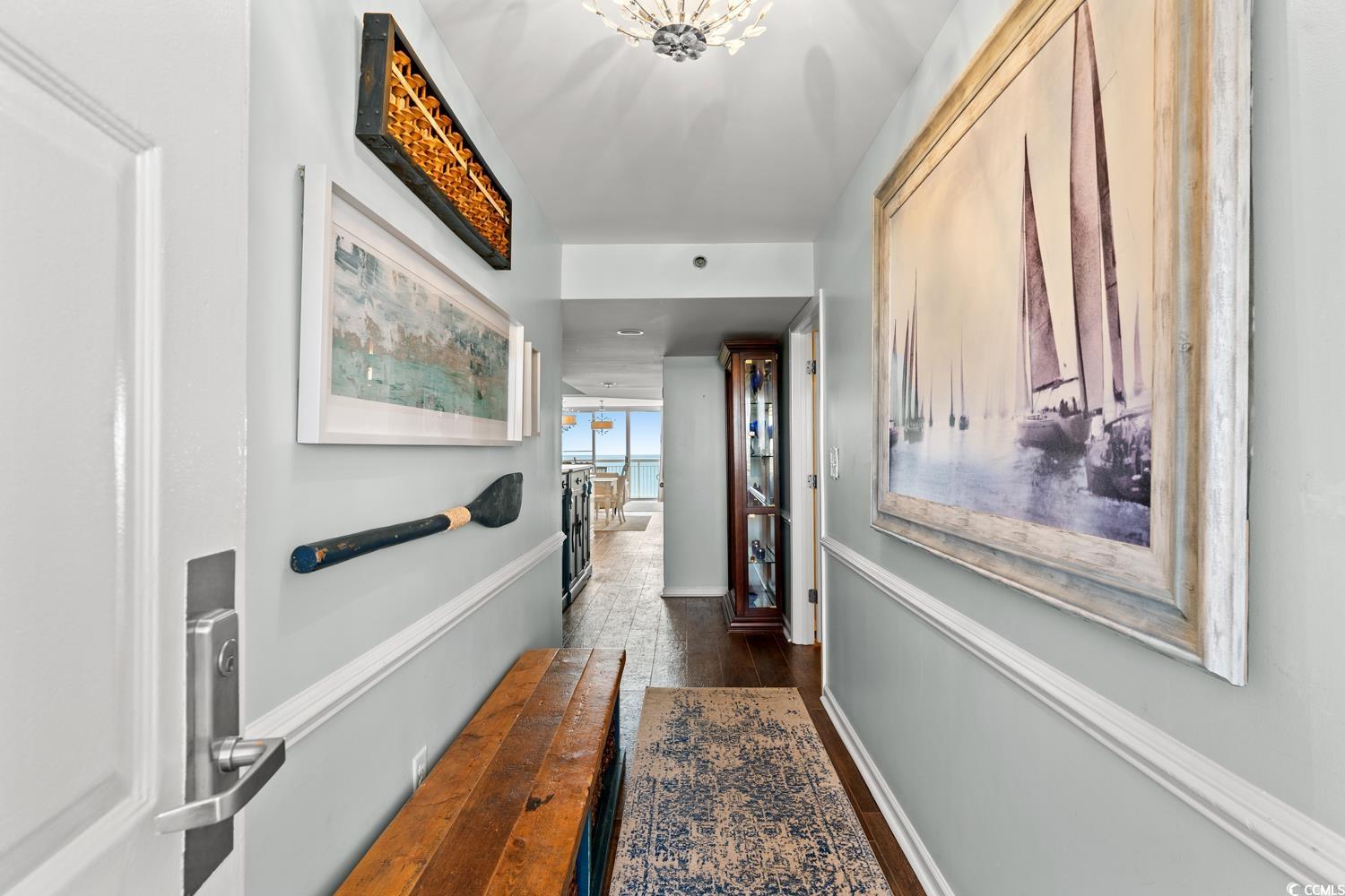 A spectacular 4-bedroom 4 bathroom unit in Crescent Shores directly oceanfront in North Myrtle Beach. This unit was used as a primary residence for the past 7 years. During this time, the owner customized the entire unit from ceilings to floors, making it unique to the building. Some of the extraordinary additions include a stunning kitchen with custom cabinetry for extra storage and glass cabinet doors for display purposes. Flat ceilings and ceramic tile throughout the entire unit. Custom drapes, light fixtures, furniture and artwork gives the unit a luxury designer feel. All the appliances were updated during the owners residency, as well as the hot water heater. The very latest addition was a brand-new HVAC installed in March 2025! The direct view of the Atlantic Ocean is outstanding from the kitchen, living room and primary bedroom. The oceanfront balcony is very spacious and offers ample room for an outdoor sofa and chairs. The unit offers large closets in every room, including a walk-in closet in the primary bedroom and an outdoor storage room just off the entryway. Do not miss this opportunity to own in a top-rated building offering all the desired amenities, as well as a turnkey unit that includes designer quality furnishings with all the bells and whistles! It is a great location near all the Beach's finest shopping, dining, golf, and entertainment. Excellent rental income for investment, second home or enjoy as a beach primary residence. Turn Key.