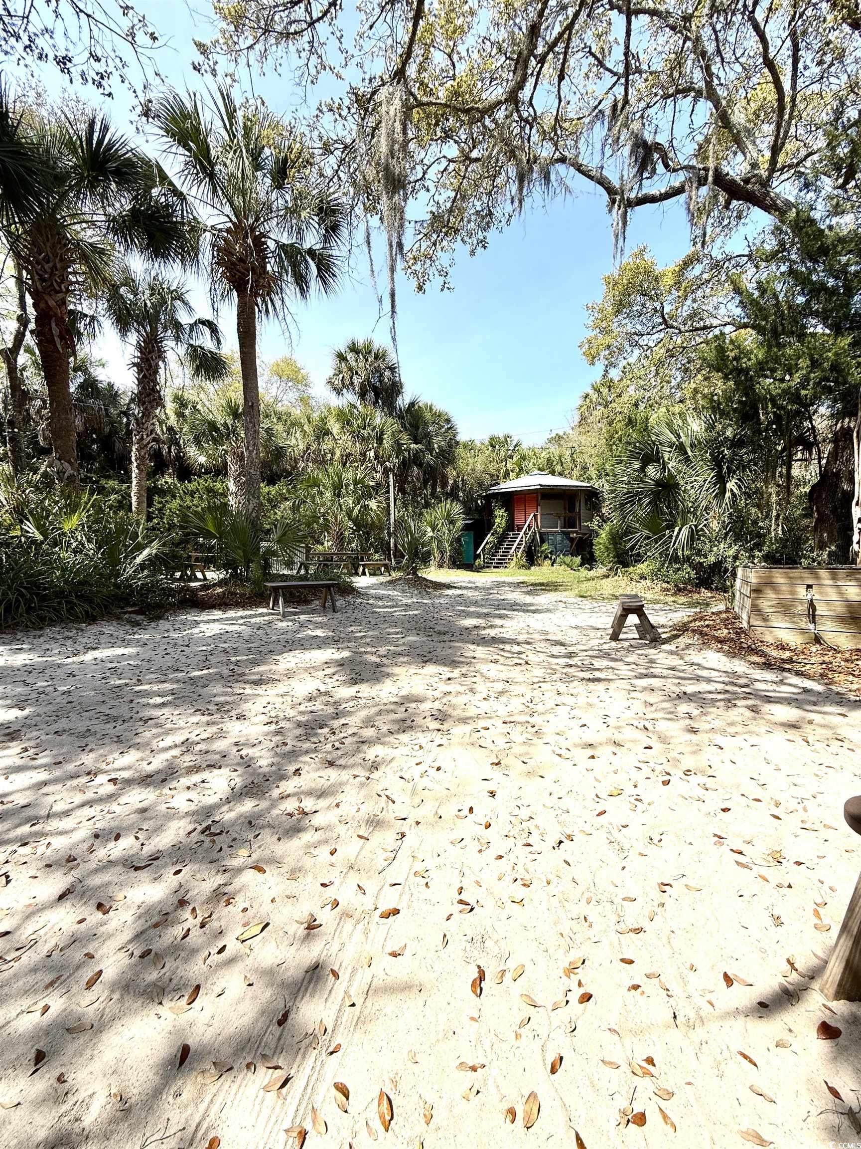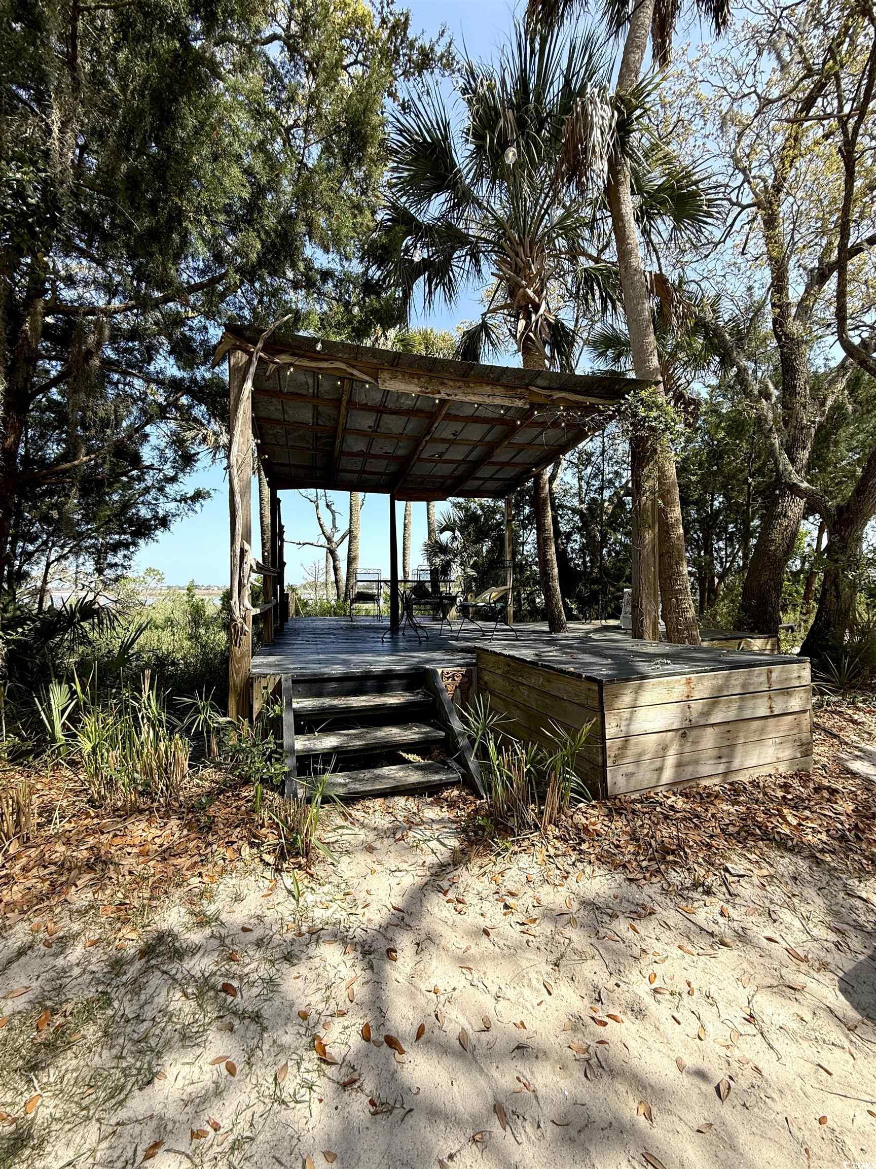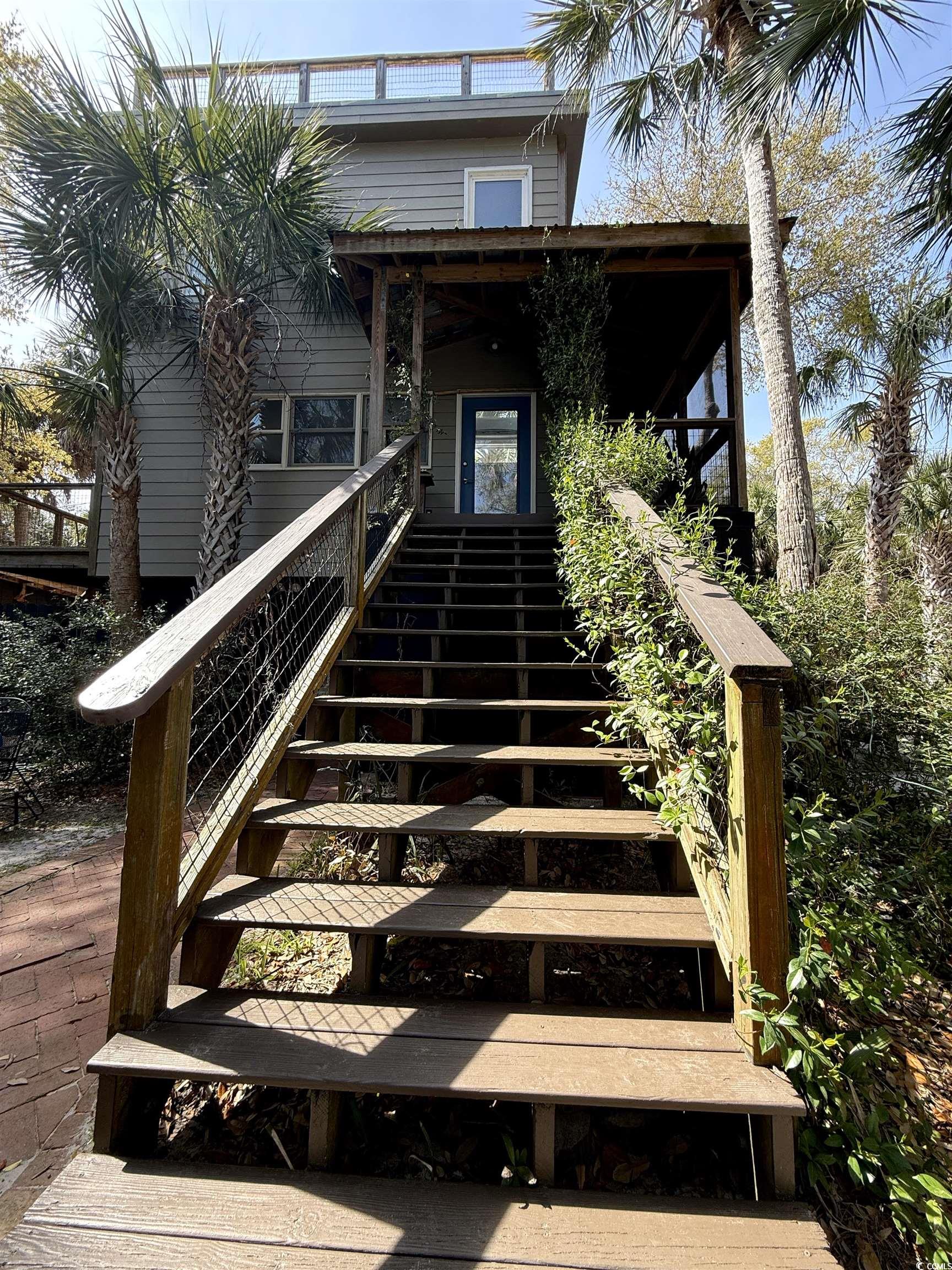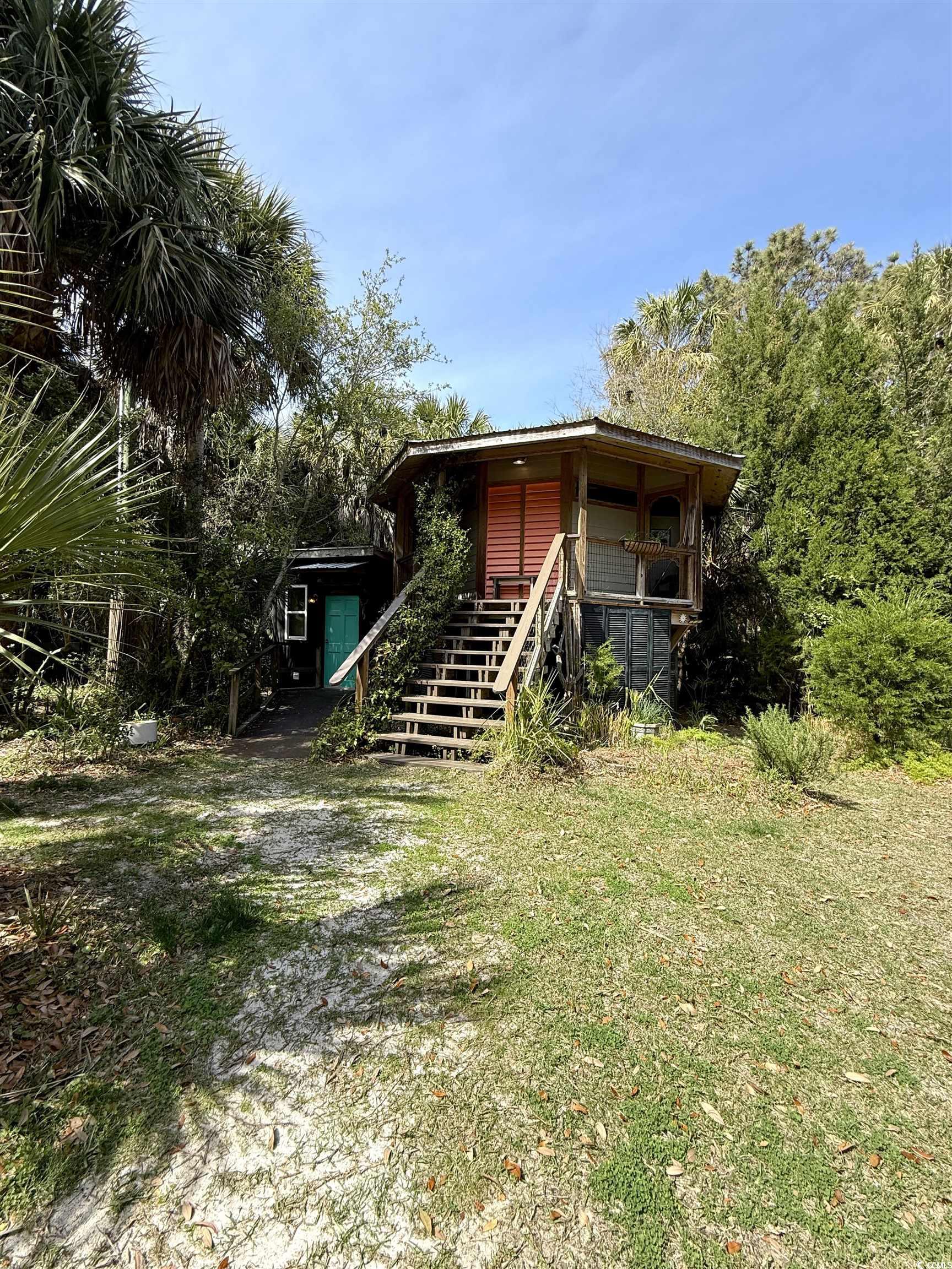 As the boat eases up to the dock at 4113 Buccaneer Road on Goat Island, you feel the busy life melt away and your peace and tranquility begin to settle. Beautiful landscape awaits you as you travel down the dock to find the house perfectly nestled amongst the palms and oaks, giving you the serene beauty of coastal living. The host of many charity events, large family gatherings, even weddings can be enjoyed at this island oasis. In the main dwelling, the large windows and outdoor living spaces give the feeling of treehouse living. The main loft bedroom overlooks the living/kitchen area. Imagine a serene, spacious bathroom nestled in nature, where large windows let in abundant natural light and offer views of the surrounding landscape. Downstairs, away from the main living area, there is an additional guest bedroom.