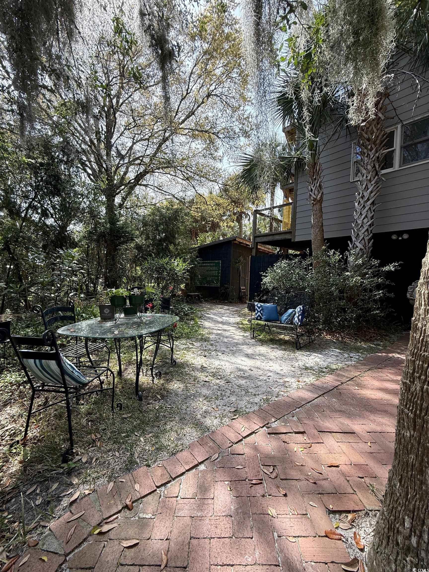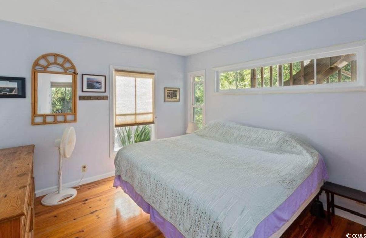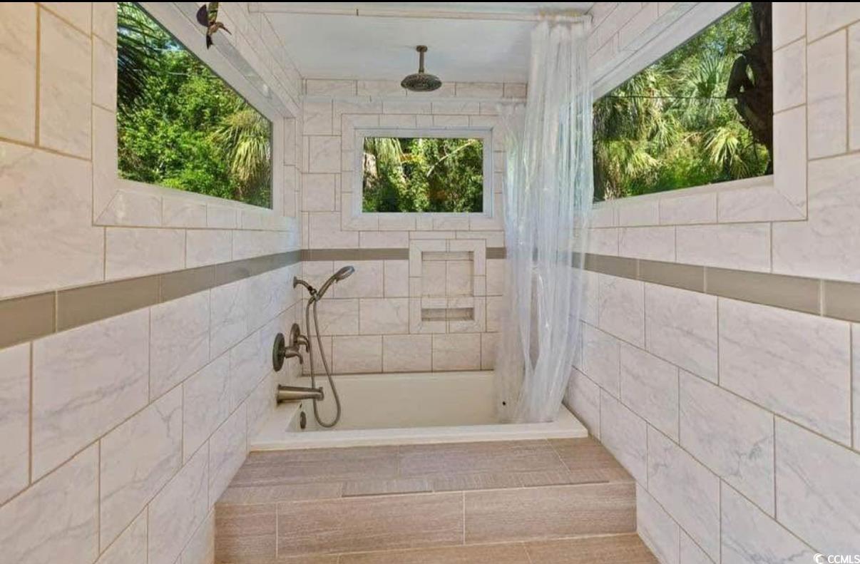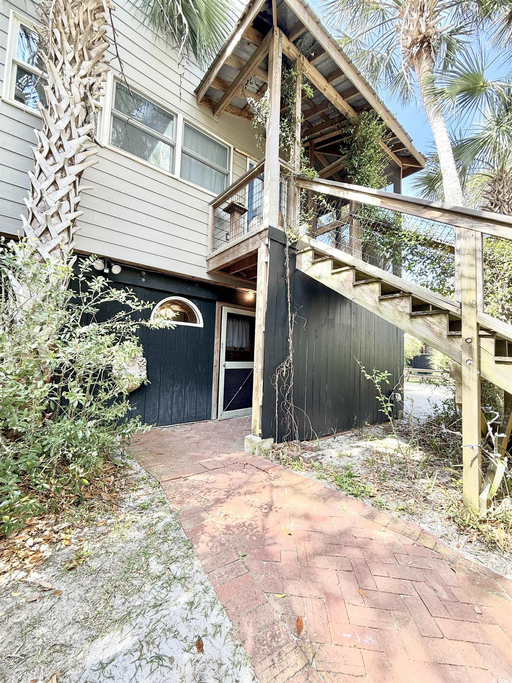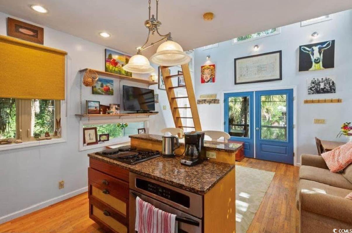 As the boat eases up to the dock at 4113 Buccaneer Road on Goat Island, you feel the busy life melt away and your peace and tranquility begin to settle. Beautiful landscape awaits you as you travel down the dock to find the house perfectly nestled amongst the palms and oaks, giving you the serene beauty of coastal living. The host of many charity events, large family gatherings, even weddings can be enjoyed at this island oasis. In the main dwelling, the large windows and outdoor living spaces give the feeling of treehouse living. The main loft bedroom overlooks the living/kitchen area. Imagine a serene, spacious bathroom nestled in nature, where large windows let in abundant natural light and offer views of the surrounding landscape. Downstairs, away from the main living area, there is an additional guest bedroom.
