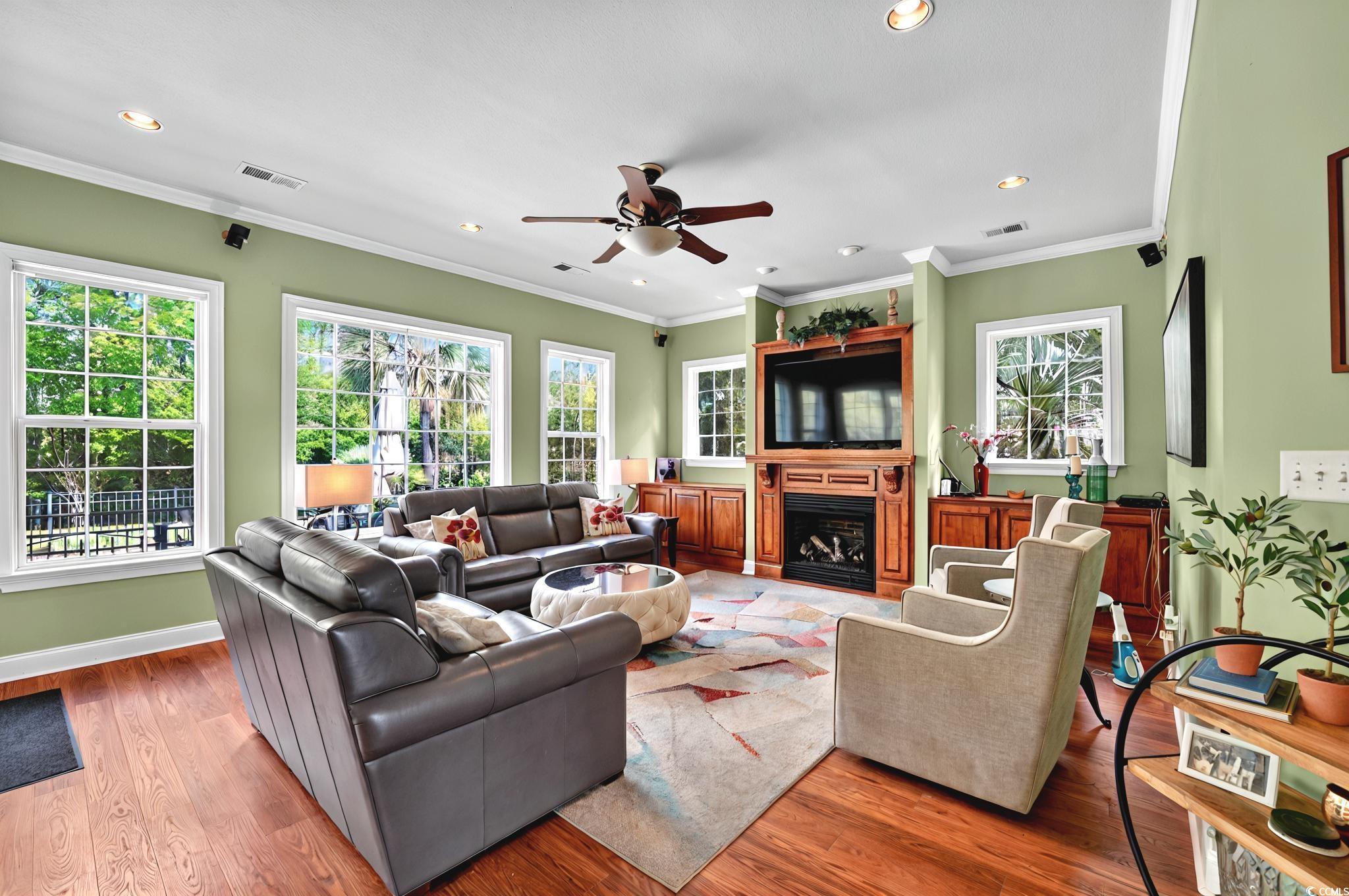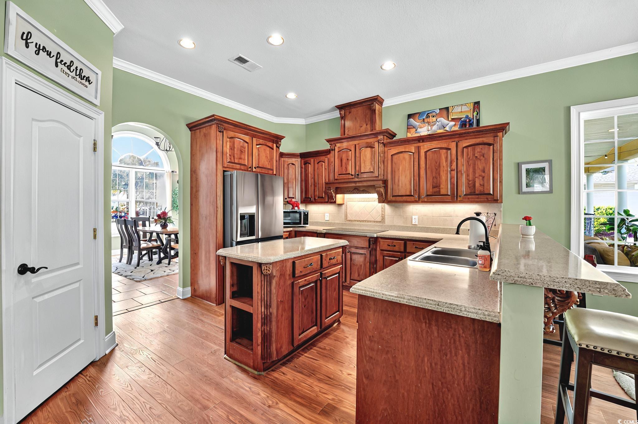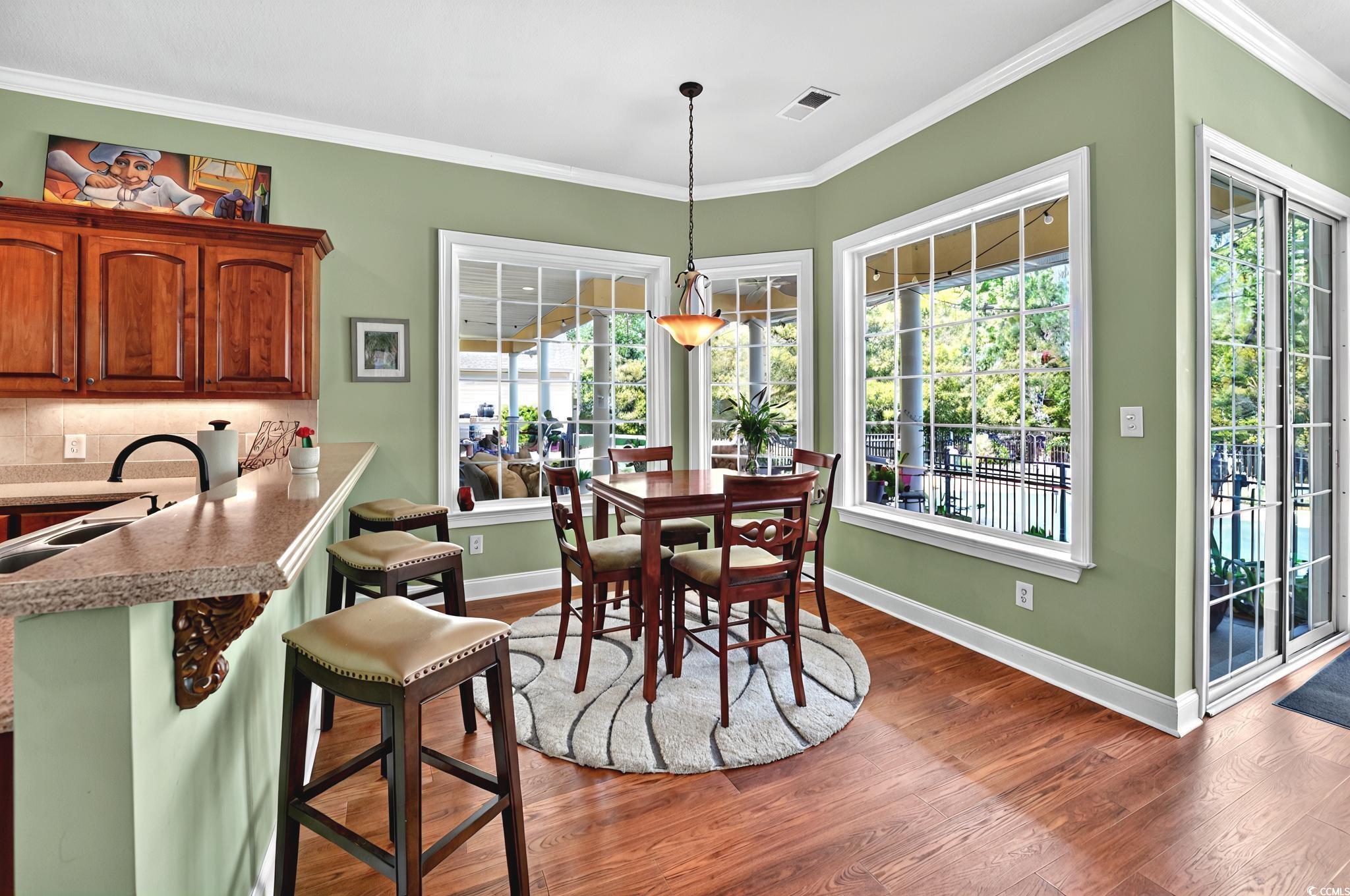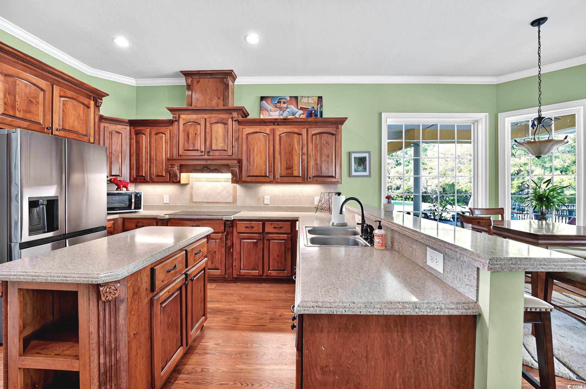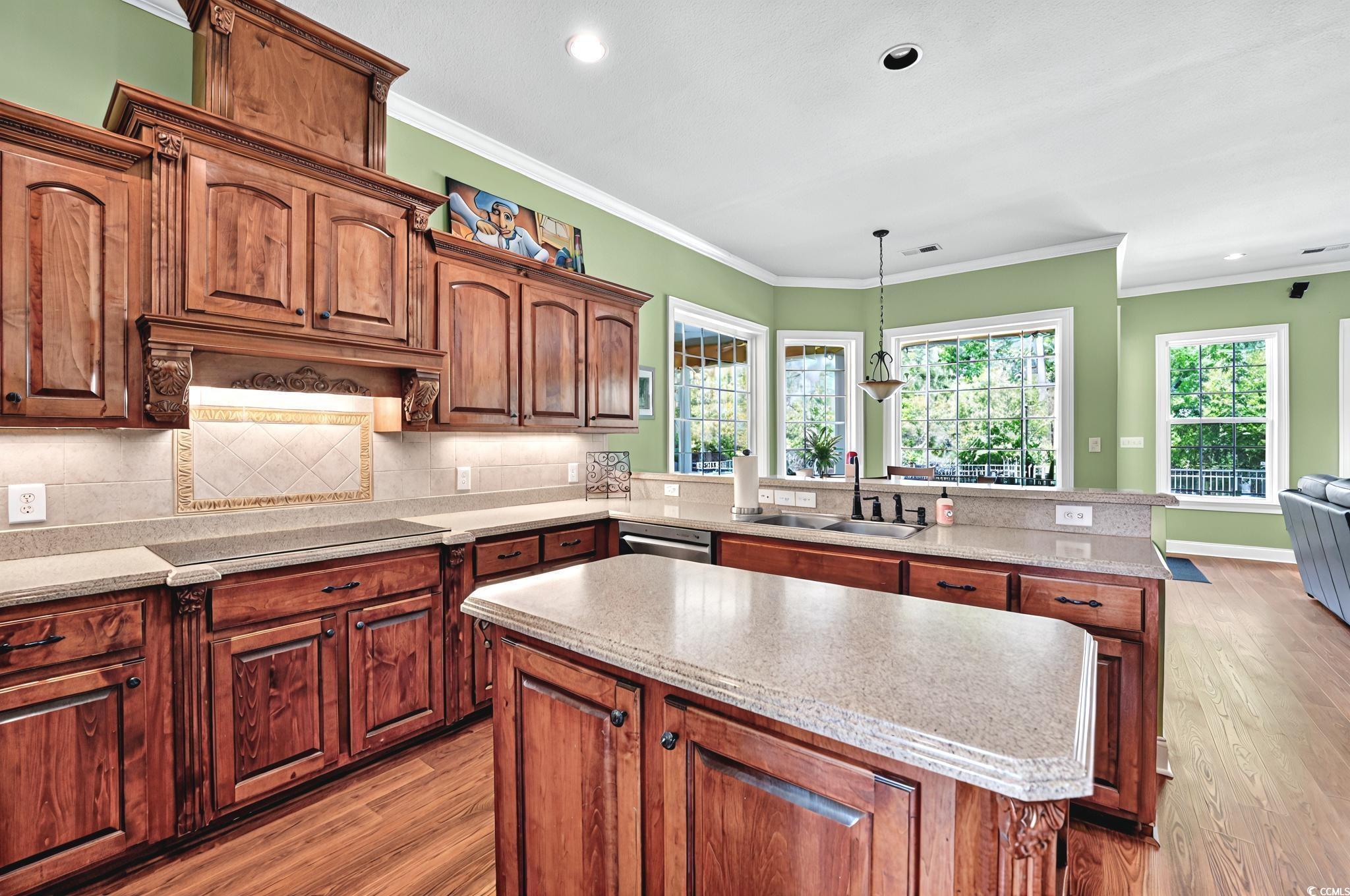 Welcome to this beautiful home located in one of the more desirable places in Myrtle Beach, Plantation Lakes! This stunning property boasts spacious interiors with plenty of natural light and modern finishes throughout. The open-concept living area seamlessly connects to a well-appointed kitchen, with new refrigerator, induction cooktop and dishwasher. With new flooring, fresh paint inside and out, new roof on 11/2022, there is nothing to do except move in and have a refreshing beverage on the back porch. This property entertains like no other, with large areas for gatherings, poolside, large back covered porch or music room. You will love the back of the house with an abundance of windows letting in all the natural light. The backyard privacy is maximized with the well thought out positioning of the neighbors houses and the backyard backing up to the woods that is a protected wet land. The pool is on the low end of maintenance, with a new pool pump installed 3/2025 security system and sprinkler system. Conveniently located near local amenities, shopping, and beaches, this home offers a superb blend of comfort and convenience. Don't miss this opportunity!