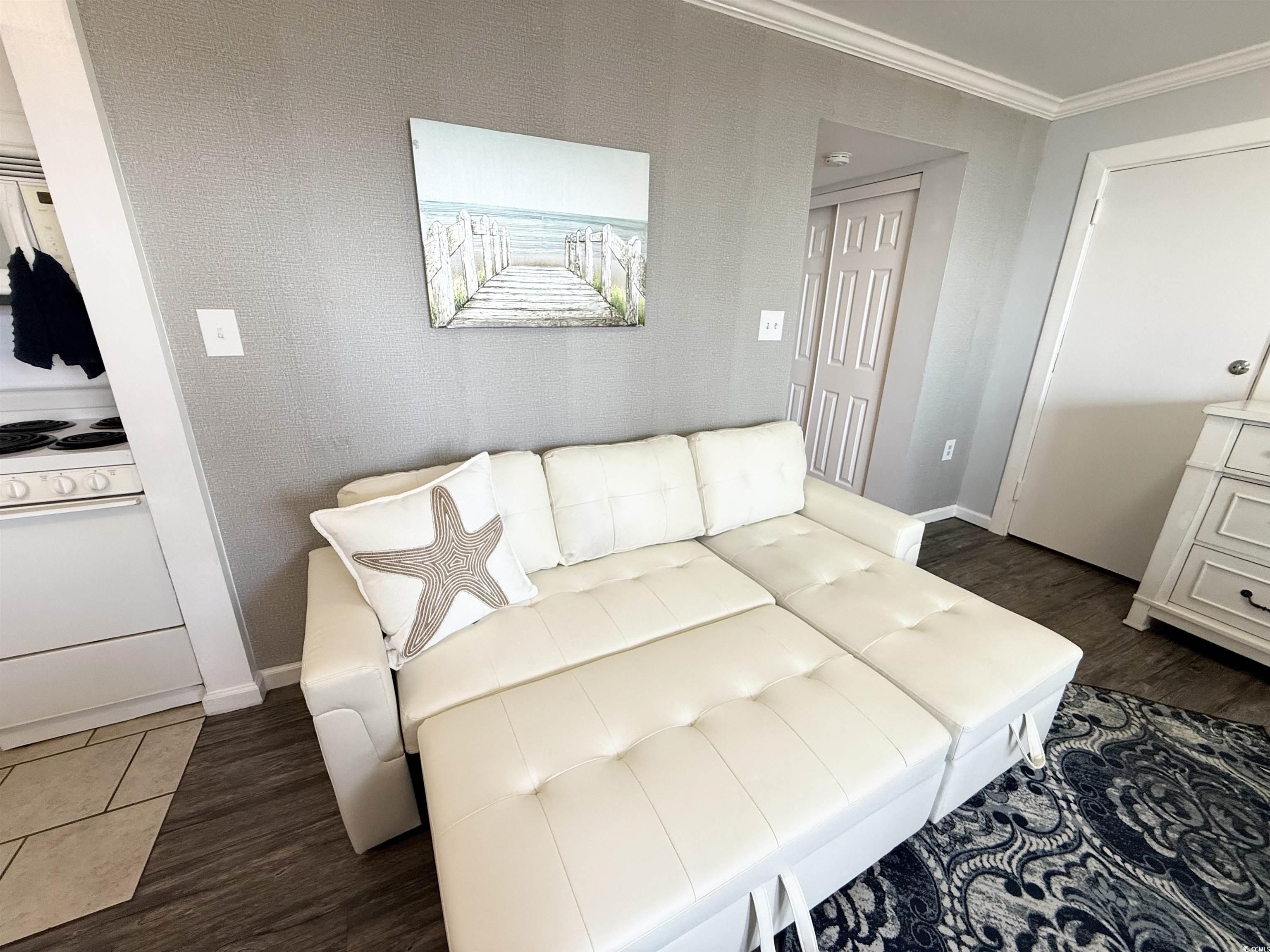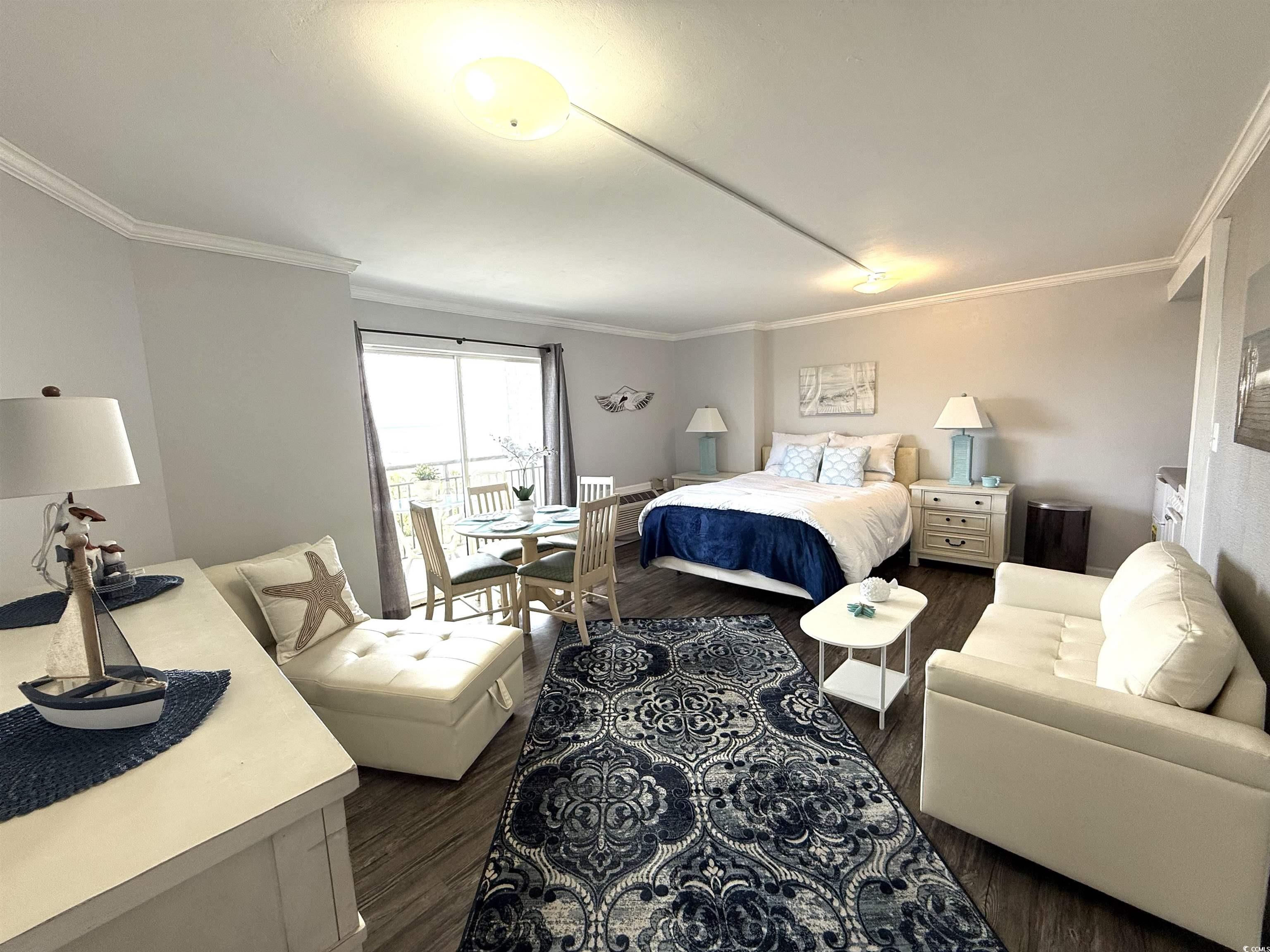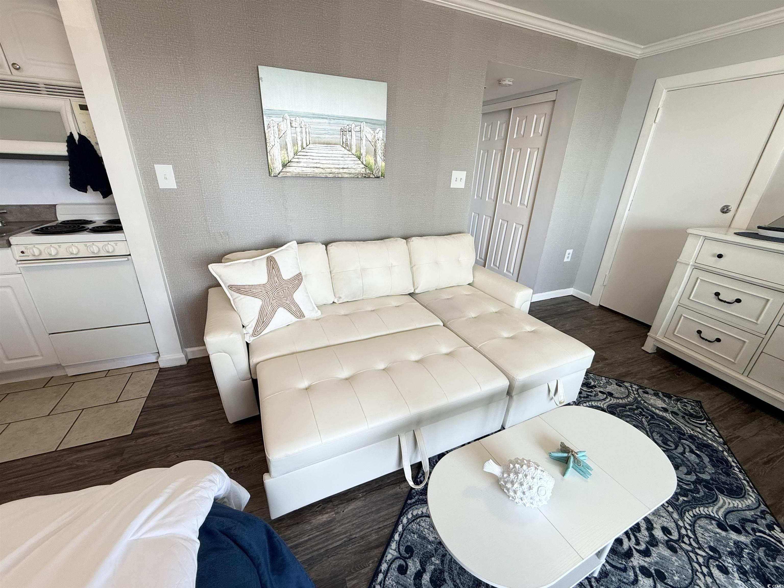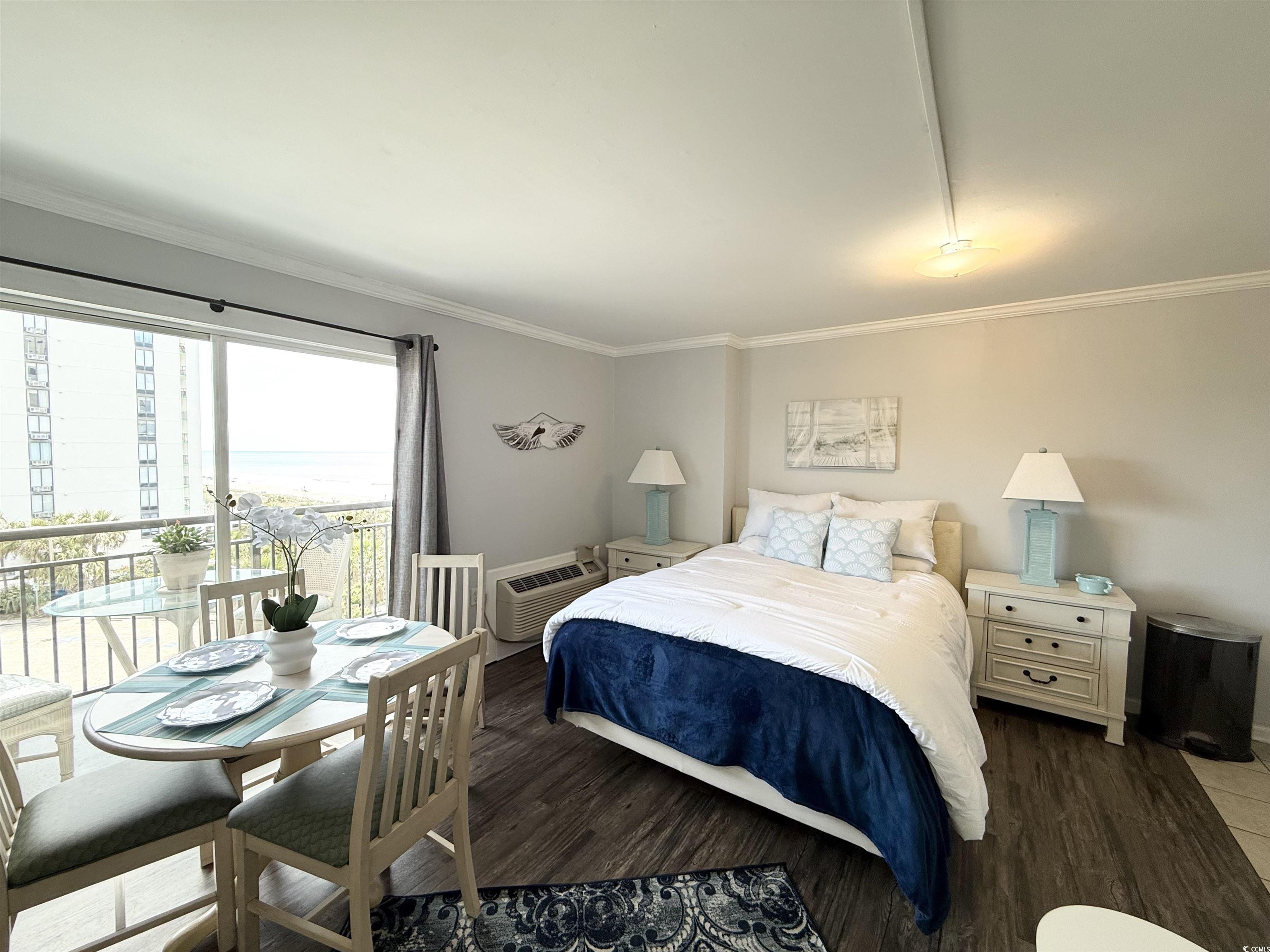 Do not miss out on the fabulous unit! As soon as you walk through the doors of this 5th floor condo you see the extraordinary, beautiful view of the beach! Showcasing luxury vinyl plank flooring, crown molding, and fresh paint, this unit is ready for you! The kitchen boasts a new refrigerator, and the AC was replaced in 2023. Enjoy your hot cup of coffee on your private balcony. You can hear the sound of the waves, hear the birds singing in the trees, and watch for dolphins in the evening. Not only do you get to take in the breathtaking views of the ocean, but you can also enjoy seeing the parades and festivities Myrtle Beach has to offer on Ocean Blvd. all from the comfort of your balcony! All utilities are included in the HOA, and the resort offers so many amenities. You have 24/7 on site security, 5 pools, 4 hot tubs, a lazy river, sauna, a full gym, and your choice of outdoor or secured garage parking. Grab a drink or a snack from the seasonal pool side Tiki Bar, or enjoy something savory from the indoor restaurant. This unit is a great place to live year round, or it could be a great rental property or vacation home.