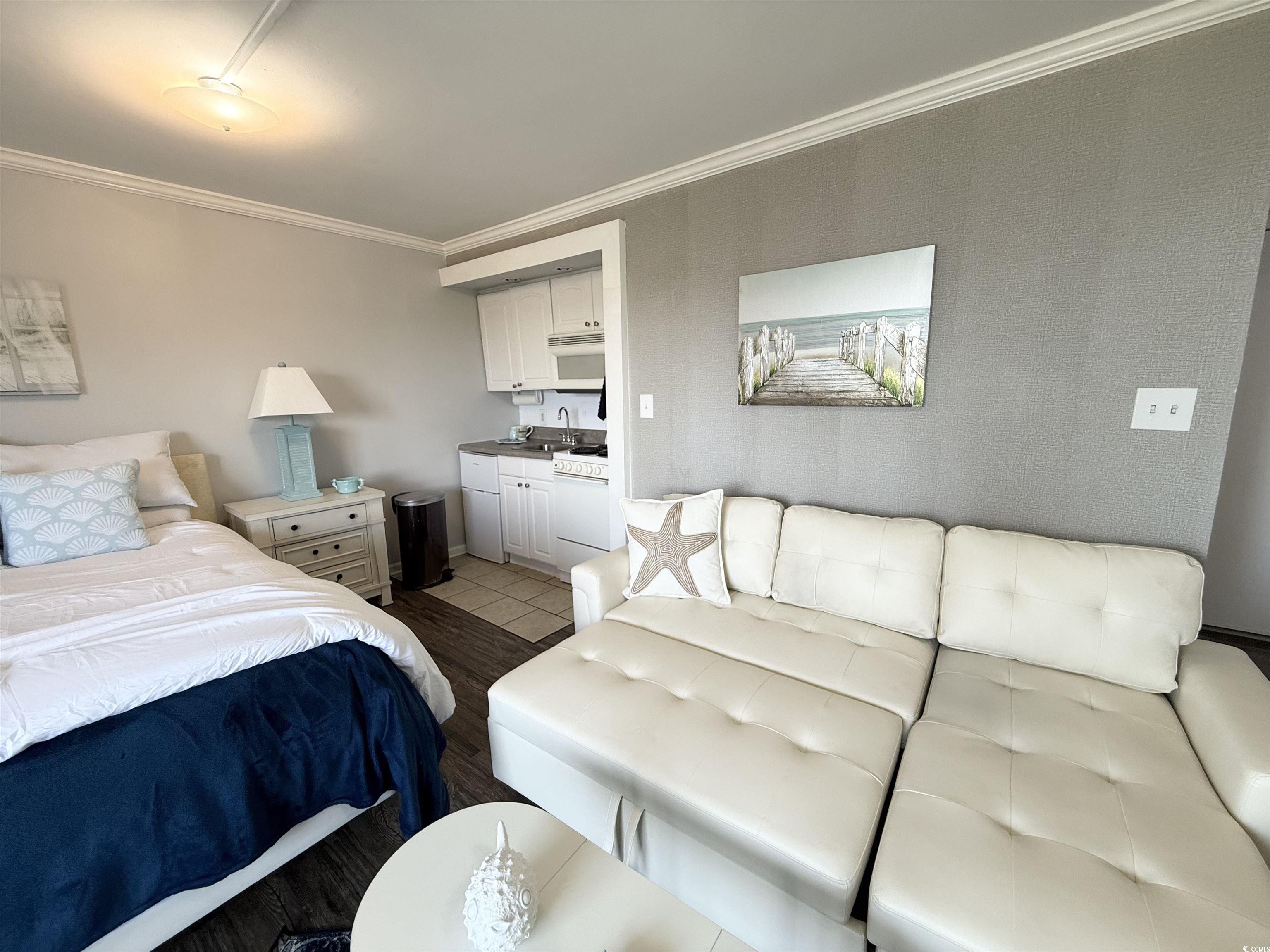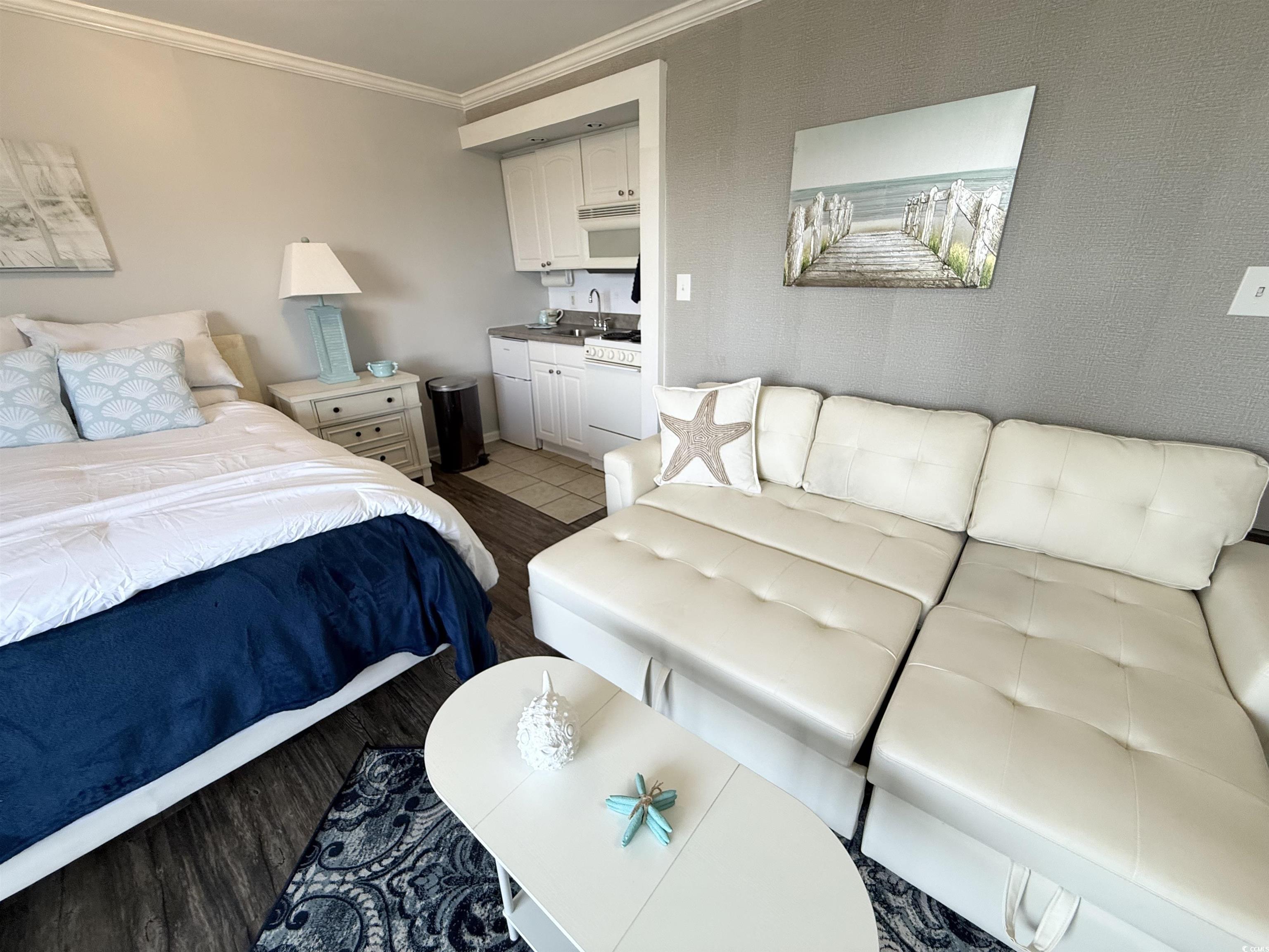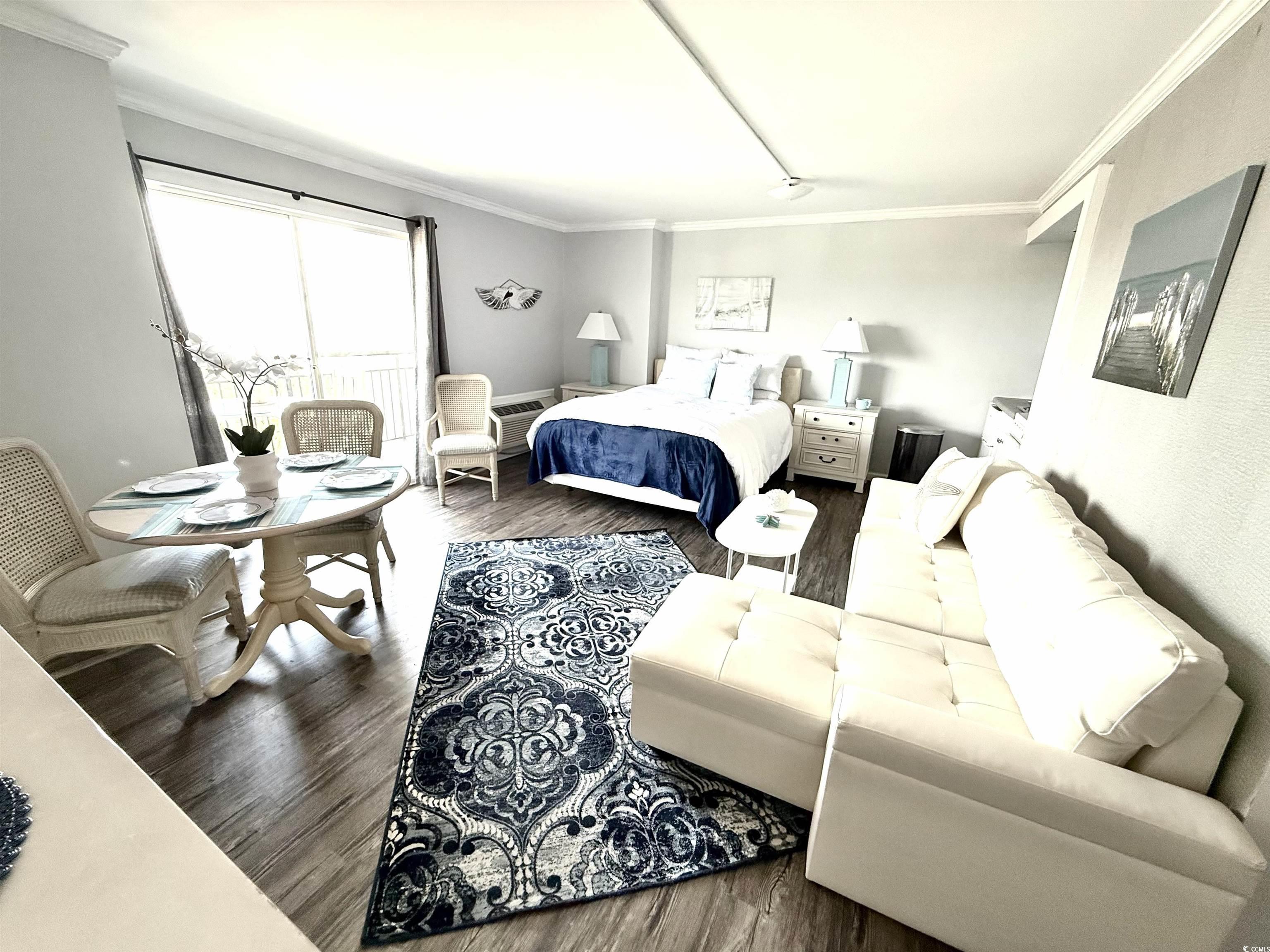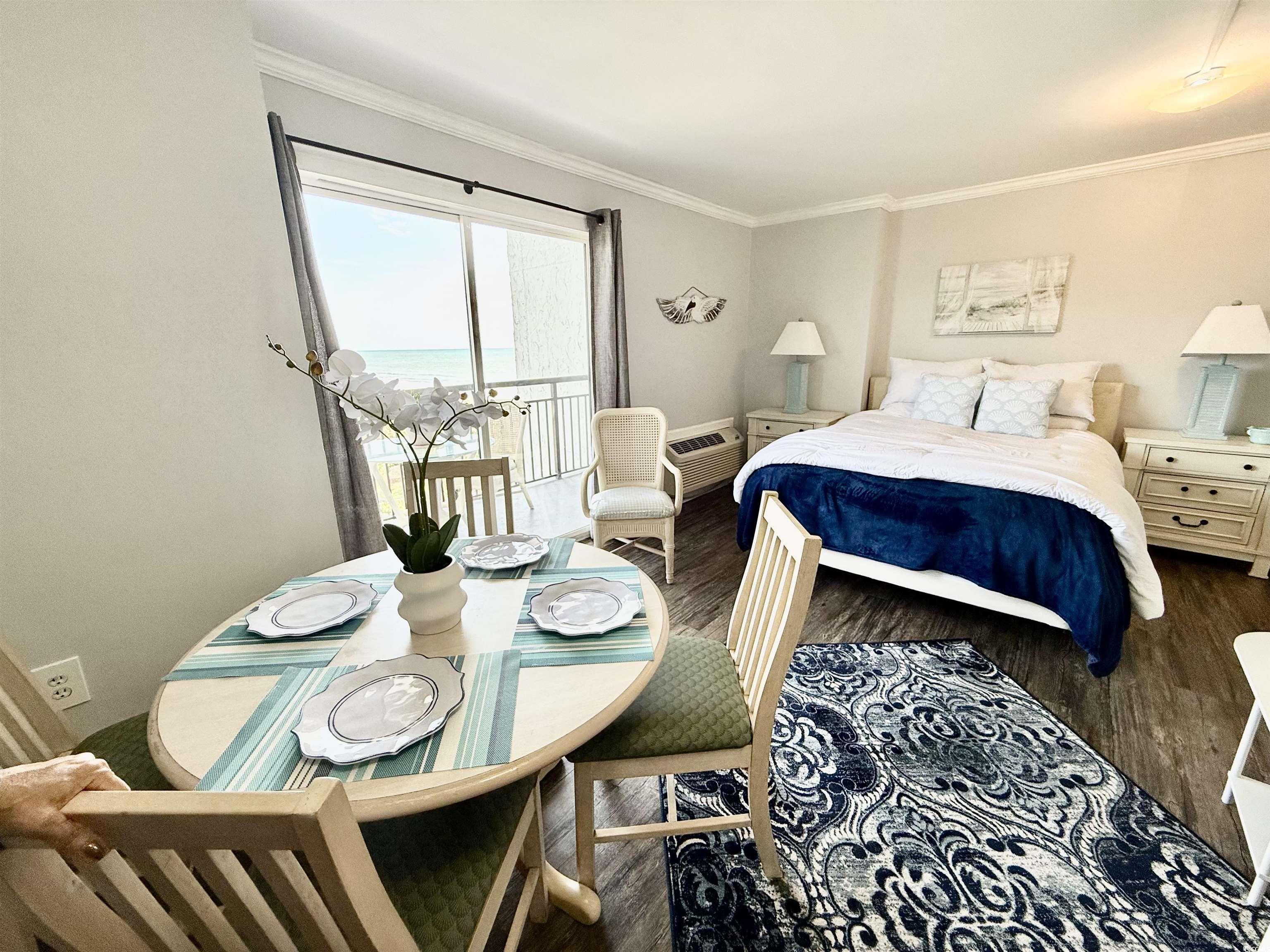 Do not miss out on the fabulous unit! As soon as you walk through the doors of this 5th floor condo you see the extraordinary, beautiful view of the beach! Showcasing luxury vinyl plank flooring, crown molding, and fresh paint, this unit is ready for you! The kitchen boasts a new refrigerator, and the AC was replaced in 2023. Enjoy your hot cup of coffee on your private balcony. You can hear the sound of the waves, hear the birds singing in the trees, and watch for dolphins in the evening. Not only do you get to take in the breathtaking views of the ocean, but you can also enjoy seeing the parades and festivities Myrtle Beach has to offer on Ocean Blvd. all from the comfort of your balcony! All utilities are included in the HOA, and the resort offers so many amenities. You have 24/7 on site security, 5 pools, 4 hot tubs, a lazy river, sauna, a full gym, and your choice of outdoor or secured garage parking. Grab a drink or a snack from the seasonal pool side Tiki Bar, or enjoy something savory from the indoor restaurant. This unit is a great place to live year round, or it could be a great rental property or vacation home.