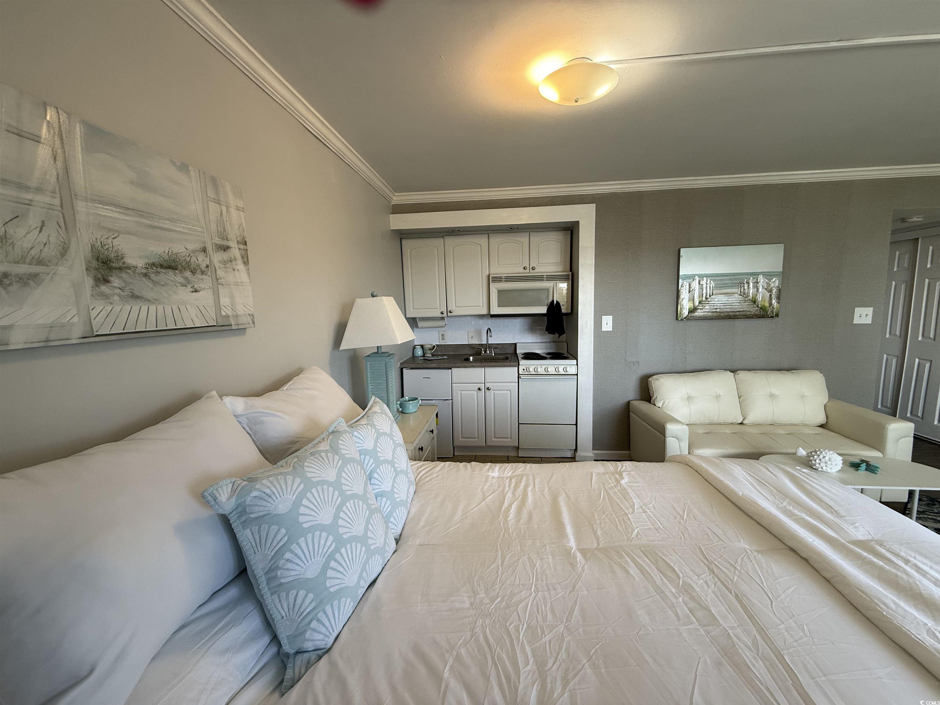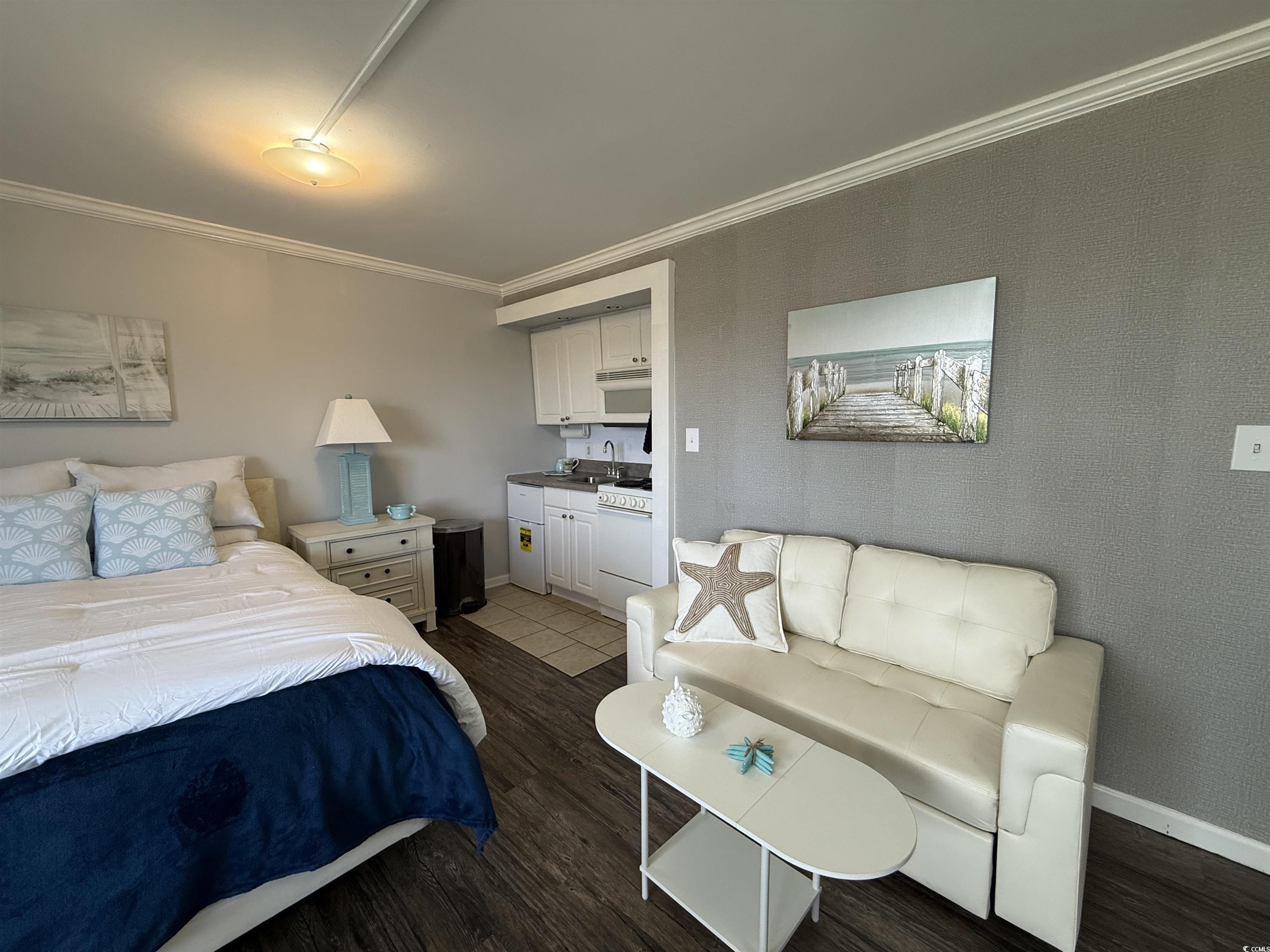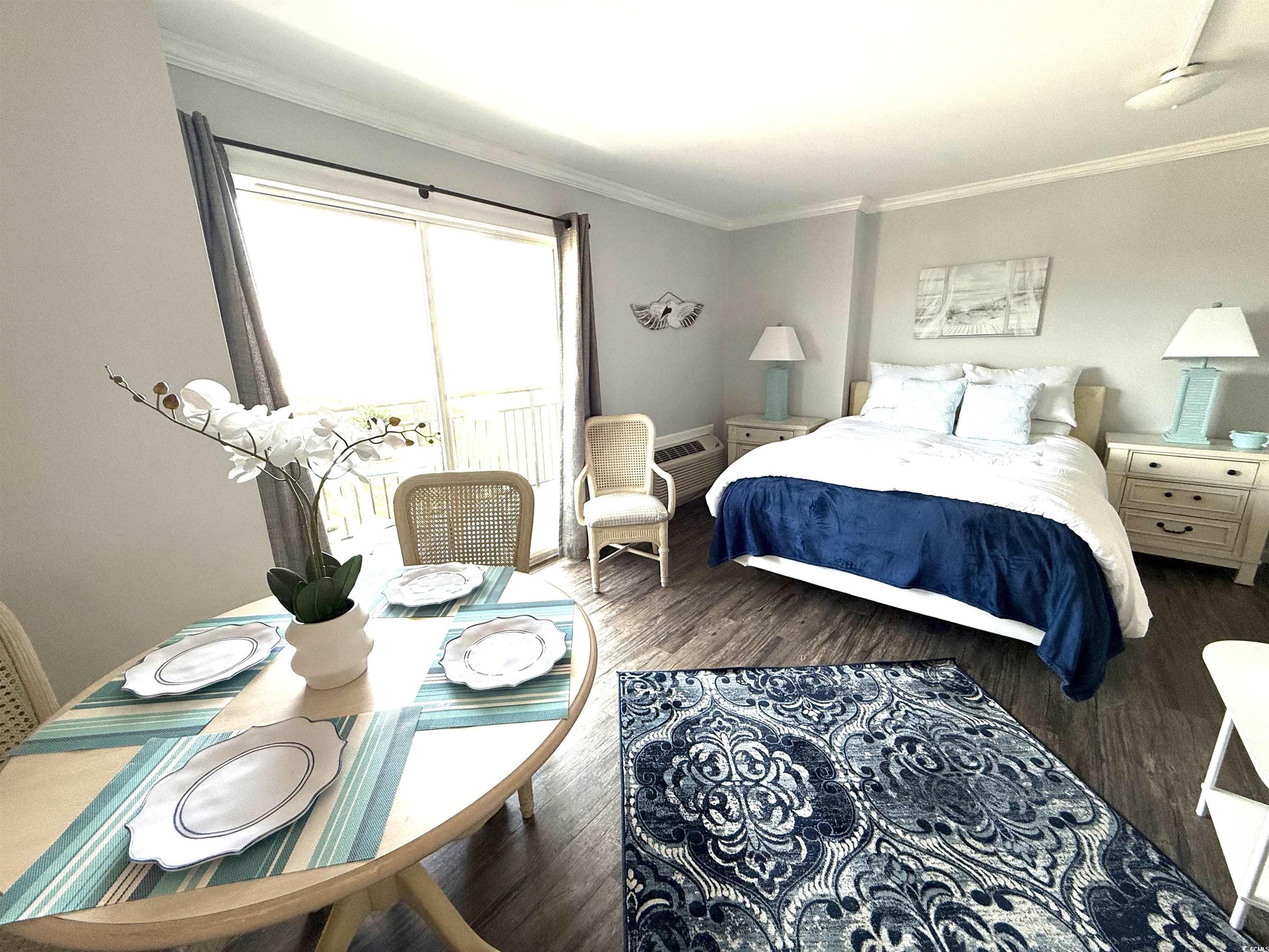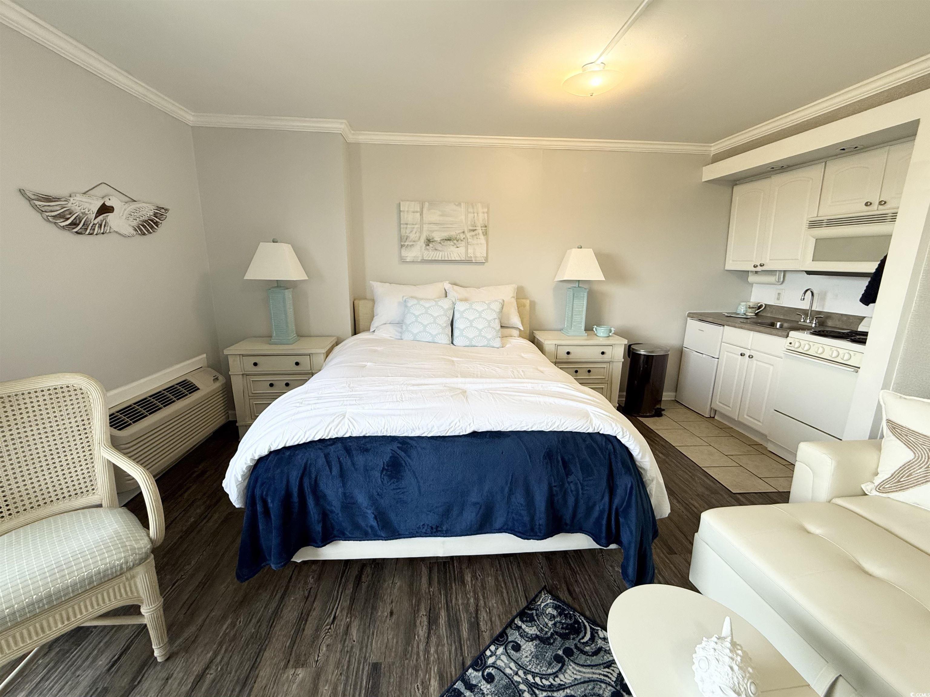 Do not miss out on the fabulous unit! As soon as you walk through the doors of this 5th floor condo you see the extraordinary, beautiful view of the beach! Showcasing luxury vinyl plank flooring, crown molding, and fresh paint, this unit is ready for you! The kitchen boasts a new refrigerator, and the AC was replaced in 2023. Enjoy your hot cup of coffee on your private balcony. You can hear the sound of the waves, hear the birds singing in the trees, and watch for dolphins in the evening. Not only do you get to take in the breathtaking views of the ocean, but you can also enjoy seeing the parades and festivities Myrtle Beach has to offer on Ocean Blvd. all from the comfort of your balcony! All utilities are included in the HOA, and the resort offers so many amenities. You have 24/7 on site security, 5 pools, 4 hot tubs, a lazy river, sauna, a full gym, and your choice of outdoor or secured garage parking. Grab a drink or a snack from the seasonal pool side Tiki Bar, or enjoy something savory from the indoor restaurant. This unit is a great place to live year round, or it could be a great rental property or vacation home.