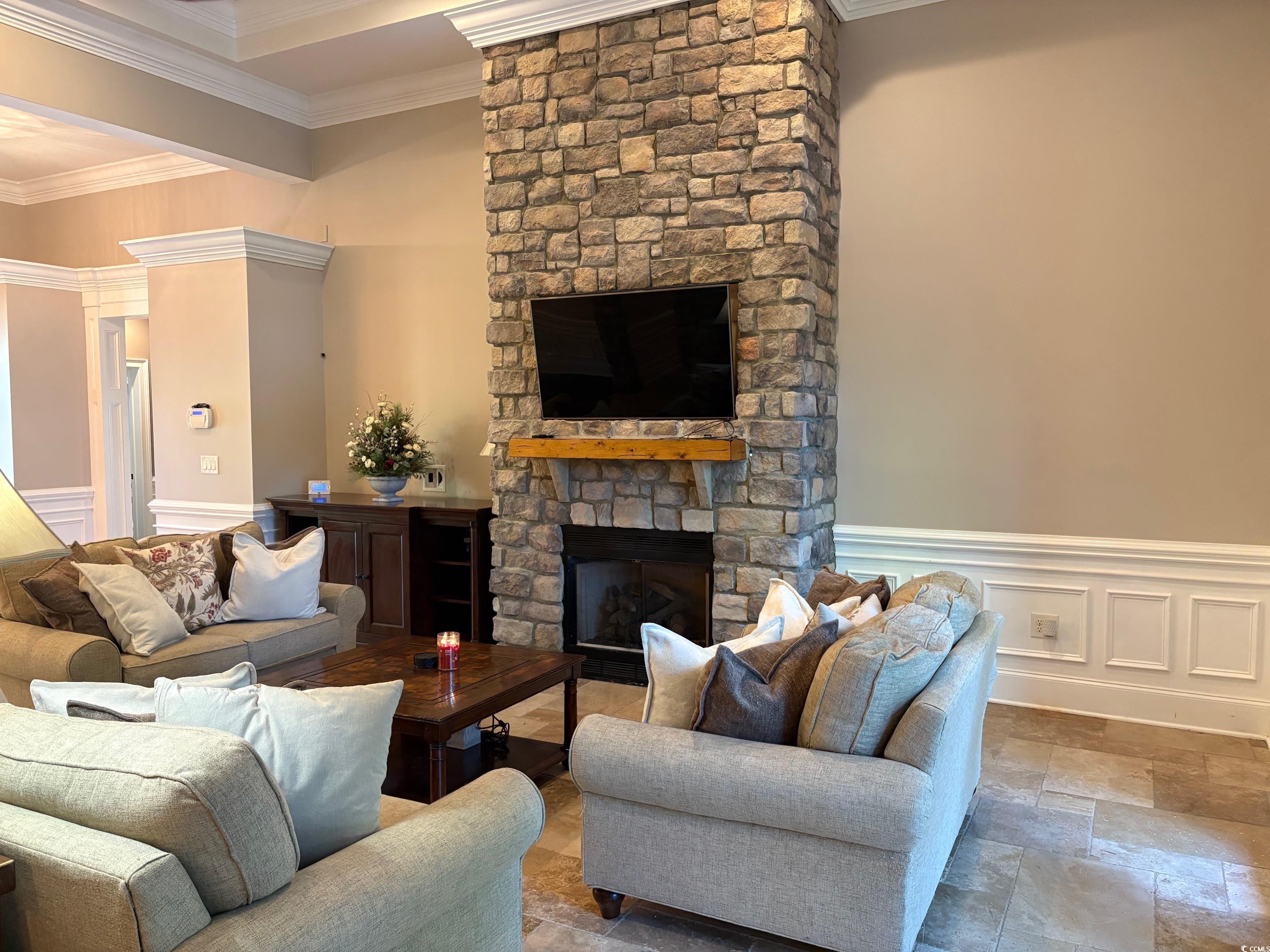 MOTIVATED SELLERS and significant price drop. Home recently painted, new built-ins added in pantry and updated outdoor fireplace. Home is being offered with one-year 2-10 Supreme Home Warranty. Select furnishings convey, please see below. Welcome to 8008 McSweeney Court in Cypress River Plantation. This stunning, custom-built, 4 bedroom, 4.5 bath, 3.5 car garage home is brimming with high-end features. As you drive down the quiet cul-de-sac street and approach this amazing property, you'll be captivated by the meticulously landscaped grounds, expansive driveway, and nearly 1.2 acres of wooded land adjacent to a community pond, creating a private backyard oasis where you can sit by the outdoor fireplace and enjoy the gentle breeze and observe wildlife. Upon entering the arched double front doors, you're greeted by soaring 13.5' coffered ceilings in both the Dining Room and Great Room, complemented by stone tile and plank flooring, and crown molding throughout. The Great Room's feature is a floor-to-ceiling stone fireplace. The kitchen, a true showpiece, features a full stone arch wall, high-end appliances including a Wolf gas stove, Viking vented hood, Sub-Zero refrigerator, two built-in wall convection ovens, a separate food warming drawer, and a microwave. Granite counters complement the numerous cabinets for ample storage and the enormous center island. The eat-in kitchen area, bathed in natural light from 9' ceilings, offers a fantastic view of the wooded property and ample space for a table seating six. The first floor includes 3 bedrooms, 3.5 baths, a dedicated office, and an oversized laundry room. The primary bedroom is a true retreat, with space for a sitting and TV area, two enormous custom closets, separate dual vanities, a custom stone tile frameless shower, and a jacuzzi soaking tub oasis surrounded by a stone wall. The additional first-floor bedrooms, located on the opposite side of the home for added privacy, each have their own ensuite bath, with the rear bedroom offering access to the rear paver stone covered patio. The office, with its double French doors, curved bump-out design, large windows, 11' vaulted ceiling, and plank flooring, provides significant space for a large desk and work-from-home options. This office can also double as a fifth bedroom or an in-law suite sitting room/bedroom combo area. Upstairs, you'll find an enormous bonus room with a full bathroom, currently used as a bedroom but easily convertible to a gaming room. It includes hardwood floors and direct access to a dedicated theater room for movie nights with friends and family, complete with reclining theater seating included in the home purchase. Clean-up is a breeze for this home with the luxury of a Central Vacuum system inside, gutter guards on gutters outside, and never run out of hot water with a tankless hot water system. Included in the home sale are all wall mounted televisions, all appliances, the washer & dryer, all window treatments (including 3M window tinting on the front windows), garage storage shelving, theater room seating, and all light fixtures. One year Home Warranty will be provided by Sellers at closing. Cypress River Plantation is a gated and 24-hour guard secured neighborhood with amazing amenities that include a private community boat launch to the Waccamaw River, boat storage options, clubhouse with fitness center, a giant pool and kiddie pool, outdoor kitchen stations, tennis, pickleball, basketball, and miles of dedicated sidewalks and roads for walks, biking, and golf carts rides. The community hosts numerous events with past events including a car show, food truck nights, live band parties, and golf cart parades. Welcome to the Cypress River Plantation lifestyle and Welcome Home to 8008 McSweeney Court!