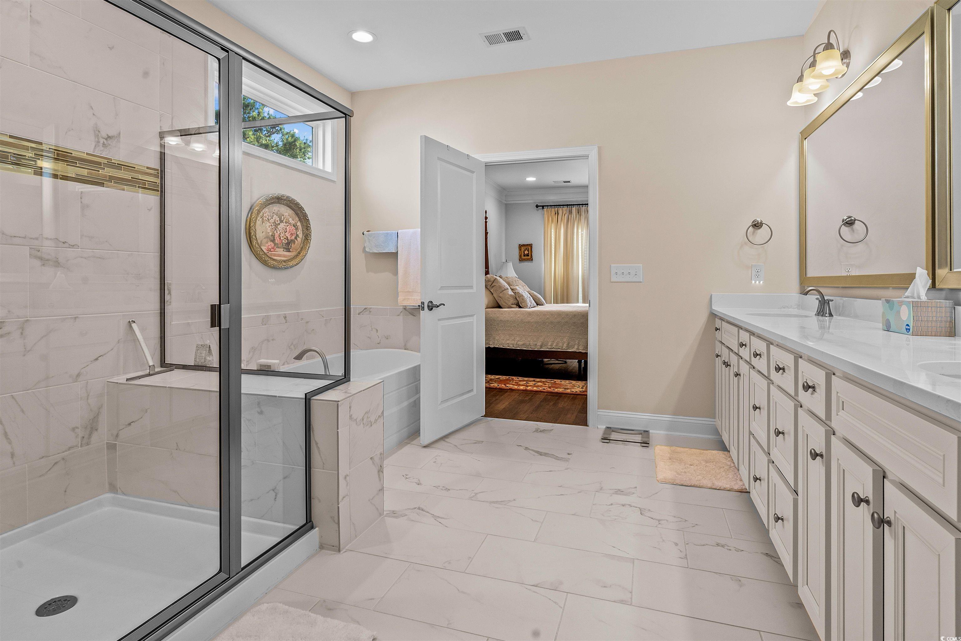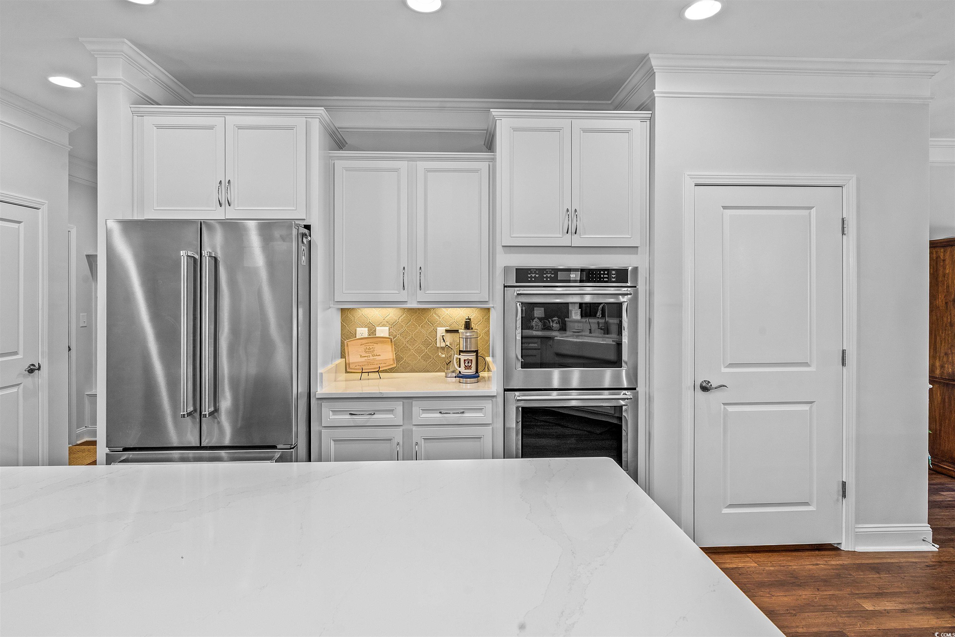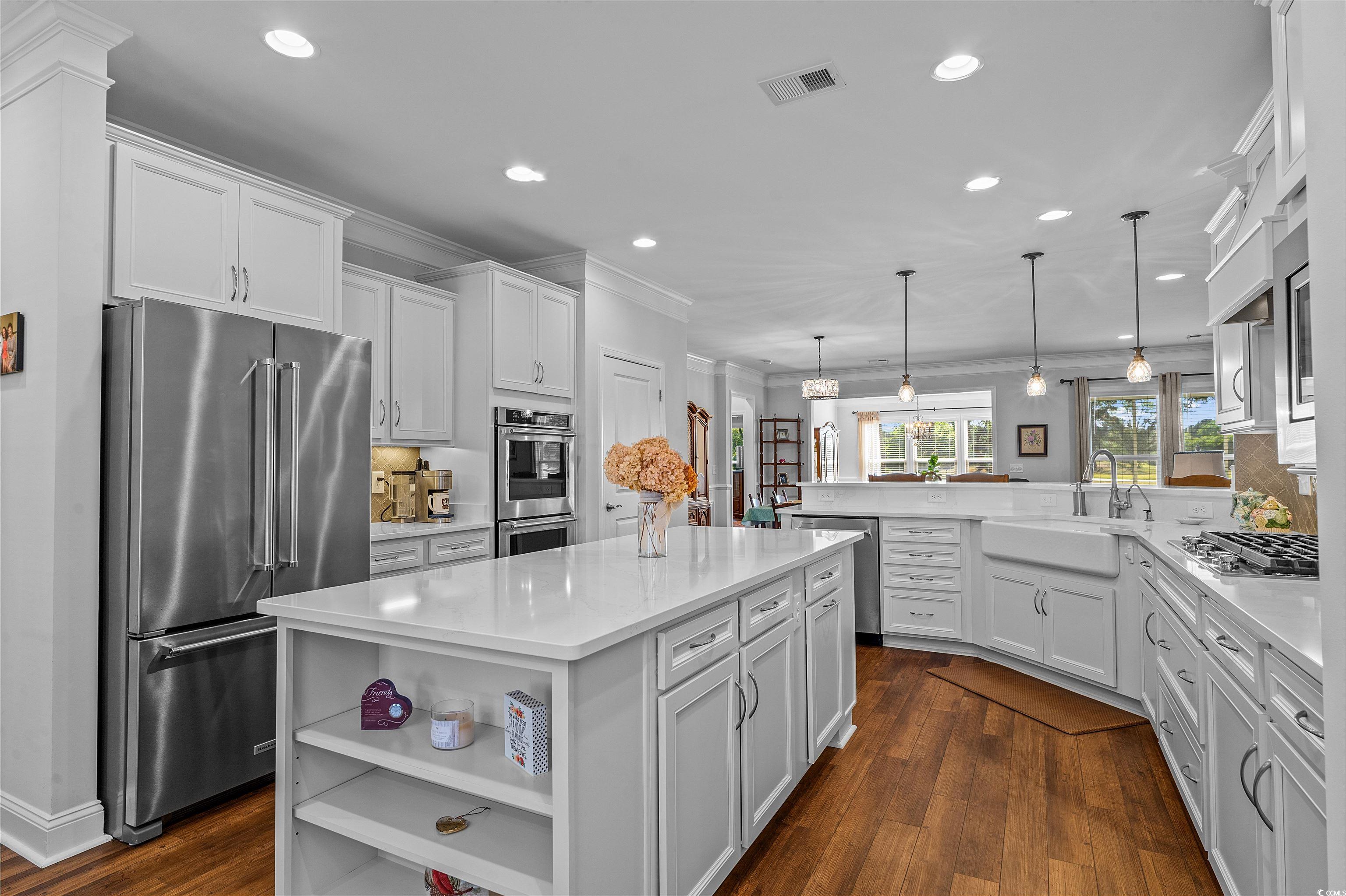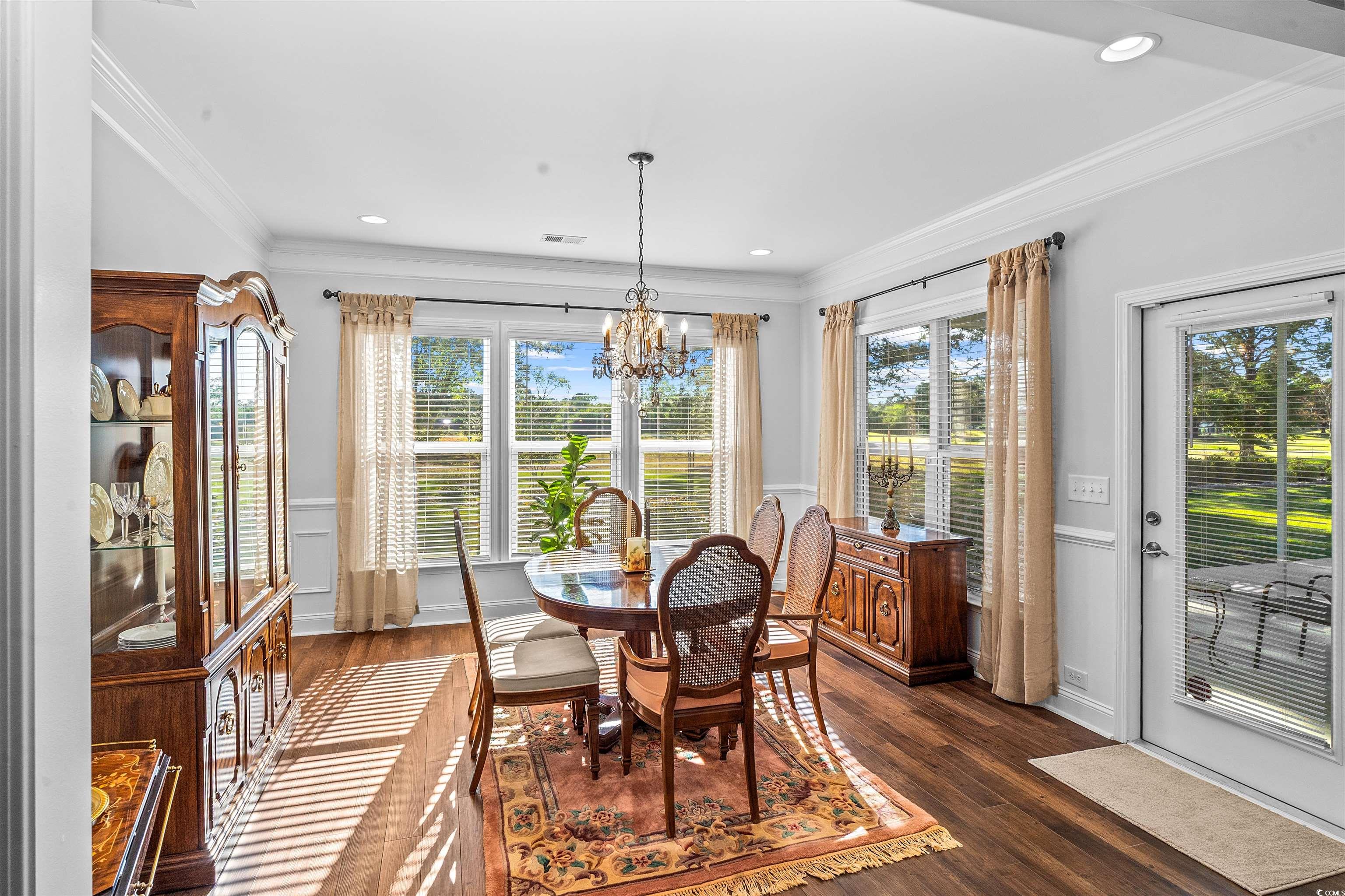 Welcome to this beautifully crafted home in the prestigious, gated Crow Creek Golf Course community. Featuring 3 spacious bedrooms, 3 full bathrooms, and a neutral color palette throughout, this home offers refined living with versatile spaces. A highlight is the private in-law suite, complete with a large walk-in closet and a walk-in showerideal for guests or multi-generational living. At the heart of the home is a chef's dream kitchen. This extra-large space boasts premium KitchenAid stainless steel appliances, a propane gas cooktop, double oven, quartz countertops, a ceramic farmhouse sink, a generous island perfect for entertaining, and a spacious walk-in pantry. Just off the kitchen, a convenient drop zone with built-in shelving helps keep daily essentials organized. Thoughtfully designed with convenience and efficiency in mind, this home includes approximately 50 pocket lights throughout the interior and porches, outlets in large closets, and a radiant barrier roof sheathing for enhanced energy savings. The oversized laundry room includes a sink and ample folding space to make everyday chores easier. The garage is a standout featureboasting an epoxy-coated floor, space for golf cart parking, 13 electrical outlets, and a walk-up dedicated storage area over the garage, offering ample room for tools, hobbies, and seasonal dcor. Enjoy year-round relaxation in the sunroom and screened porch, both offering serene views of the lush 9th fairway. Whether it's morning coffee or winding down in the evening, these spaces provide the perfect backdrop for golf course living. The luxurious primary suite offers a spacious retreat, featuring a spa-like en suite with a garden tub, walk-in shower, and an expansive walk-in closet. Minutes from downtown Calabash, Sunset Beach, Ocean Isle Beach, and a short drive to North Myrtle Beach, this home blends luxury, comfort, and coastal charm. Community amenities outdoor pool, clubhouse, pickleball and more.