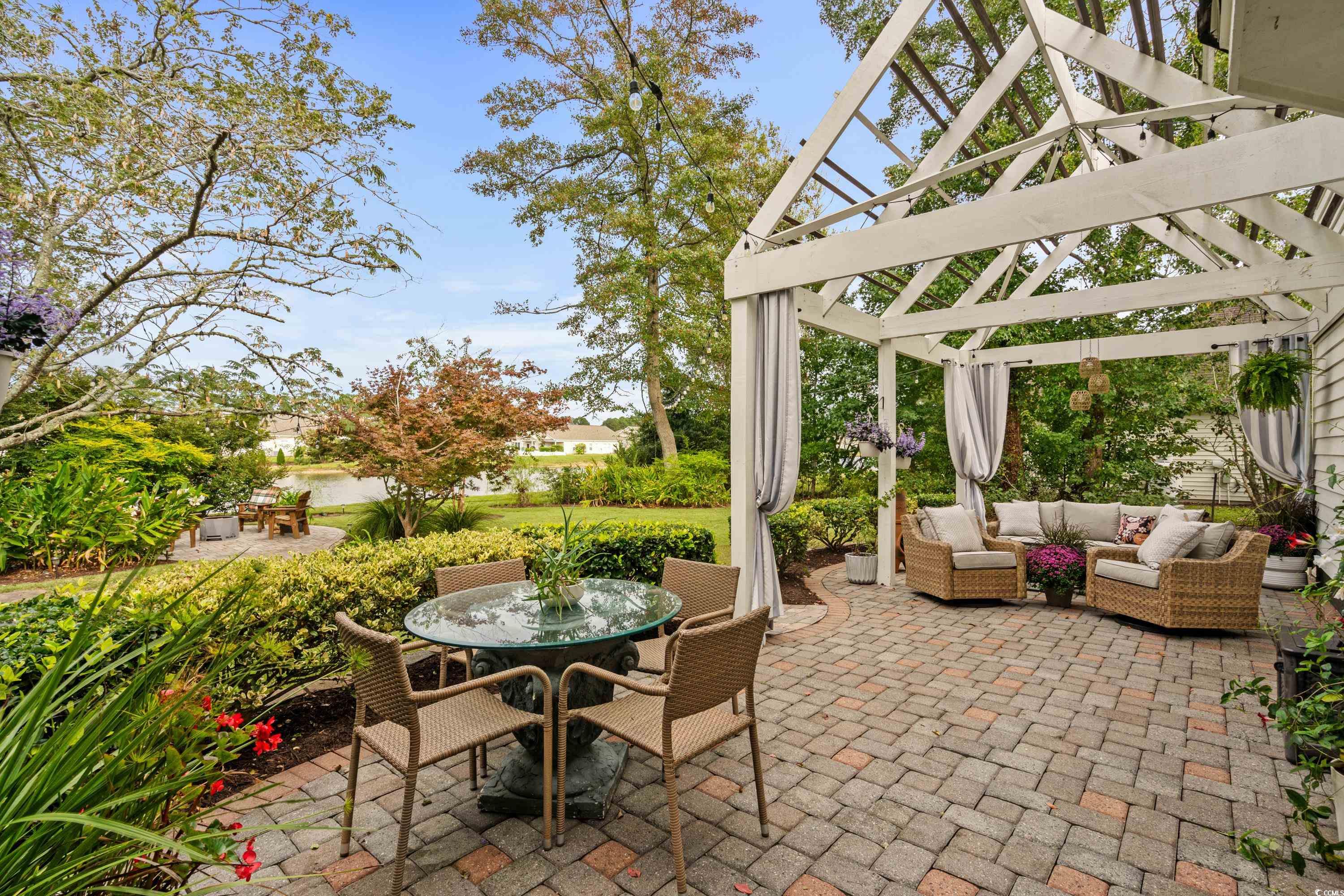 Showstopper: Beautifully Updated Two-Story Home with Water View and Pergola in Deerfield is nestled at the beginning of a serene cul-de-sac with end of road gate to prevent thru traffic Key Features: Well-Appointed Design: Thoughtfully curated by a professional interior designer, this home features high-end finishes and an elegant aesthetic throughout. Furnishings will be considered at an additional cost, allowing you to enjoy a move-in ready space with style. Spacious Living Areas: Enter into a bright, open-concept living and dining area featuring wall trim that adds interest and character. Large bay window frames stunning water views, while elegant hardwood floors on the first floor create a warm and inviting atmosphere, complemented by a cozy fireplace recently rebuilt and refinished for the perfect ambiance. Gourmet Kitchen: The fully updated kitchen boasts exotic granite and quartzite countertops, expertly mixed, alongside stainless steel appliances and ample cabinetry. The large breakfast bar is perfect for casual dining, while a charming table in the bay window offers an inviting spot for morning coffee or family meals. Luxurious Master Suite: The very large master bedroom features a cozy window seat, providing a perfect nook for relaxation. Enjoy a stunningly updated master bathroom, complete with freshly added beadboard trim, elegant wallpaper, frameless glass doors, and new antiqued gold plumbing fixtures. The spacious walk-in closet and an additional accessories closet offer ample storage. Second Ensuite: The large second ensuite bedroom is perfect for guests or family members, featuring its own private bathroom for added convenience and comfort. Stunning Views: One of the bedrooms boasts amazing views of the backyard, allowing you to wake up to serene sights and natural beauty every day. Large Bedrooms: All bedrooms in the home are generously sized and feature large closets, providing plenty of space for comfort and storage. Separate Den: A spacious separate den offers versatility for a family room, office, or playroom, perfect for all your needs. Built-In Office Area: A thoughtfully designed built-in office area under the stairs provides a perfect workspace for managing daily tasks, remote work or homework! Screened Porch: French doors separate the living room from a charming screened porch, ideal for enjoying your morning coffee or unwinding with a good book while overlooking the backyard. Outdoor Oasis: Step outside to a large yard adorned with ornamental trees and mulched beds perfect for entertaining or enjoying quiet evenings. The backyard also features a charming pergola, a paver patio for outdoor gatherings, and a cozy firepit area. Sturdy and Stylish Exterior: The home features beautiful cedar siding, complemented by Hardie shake accents in the dormers, ensuring both durability and timeless charm. The raised slab foundation adds to the home's resilience and elegance. Convenient 2-Car Garage: The attached two-car garage boasts painted walls and floors, large storage closets, and built-in shelving, ensuring plenty of room for all your tools and belongings. Prime Location: Enjoy the convenience of golf cart rides to the beach and proximity to shopping, including a future Trader Joe's. Square footage is approximate and not guaranteed. Buyer is responsible for verification of all information. Listing Agent is Owner.