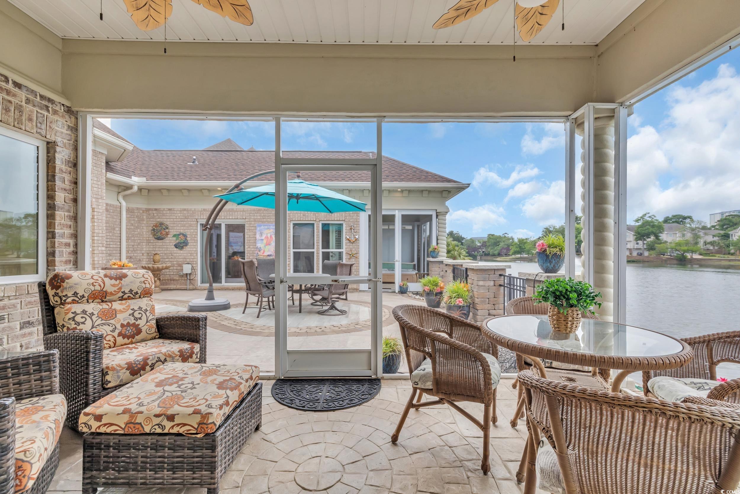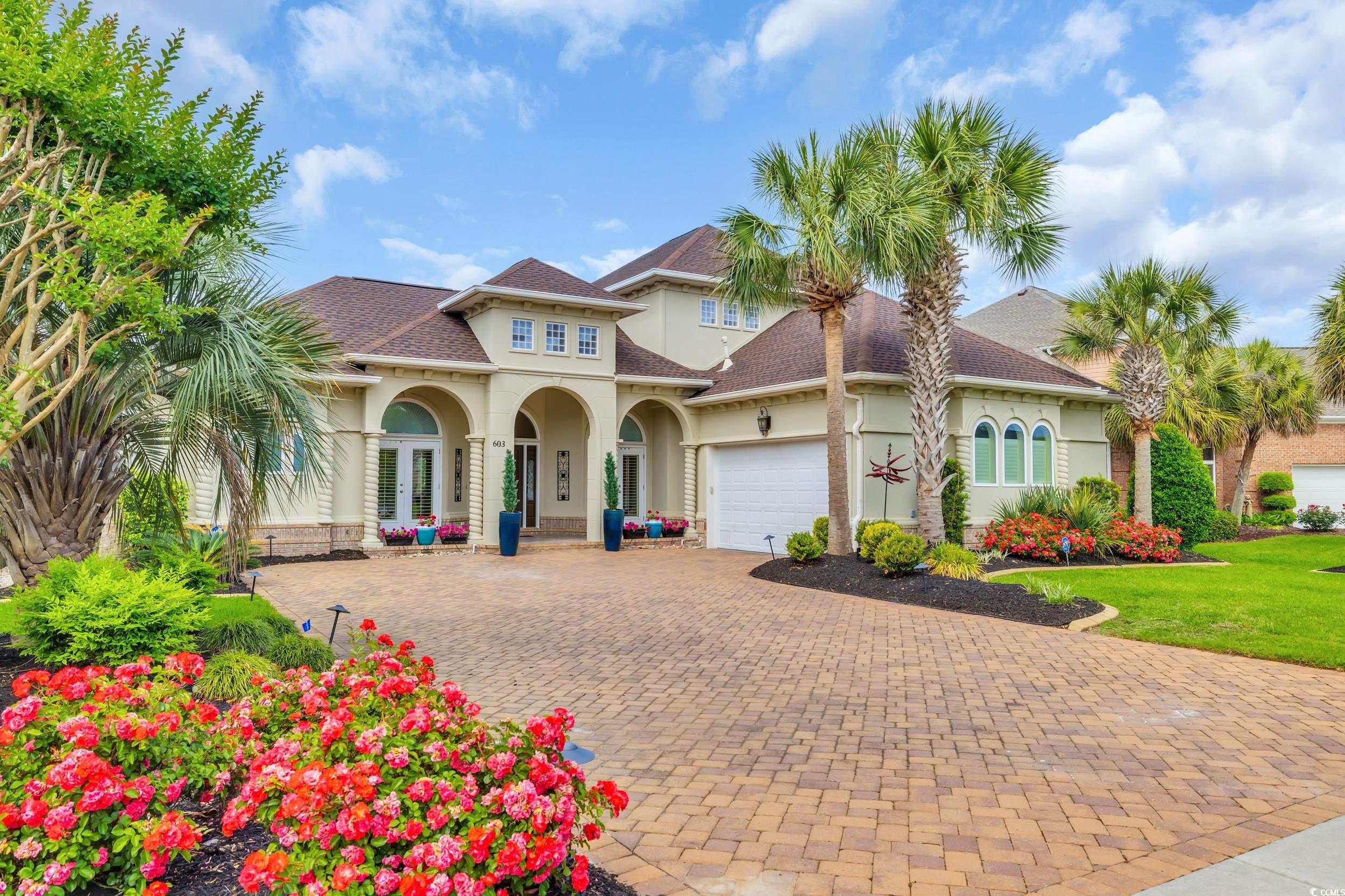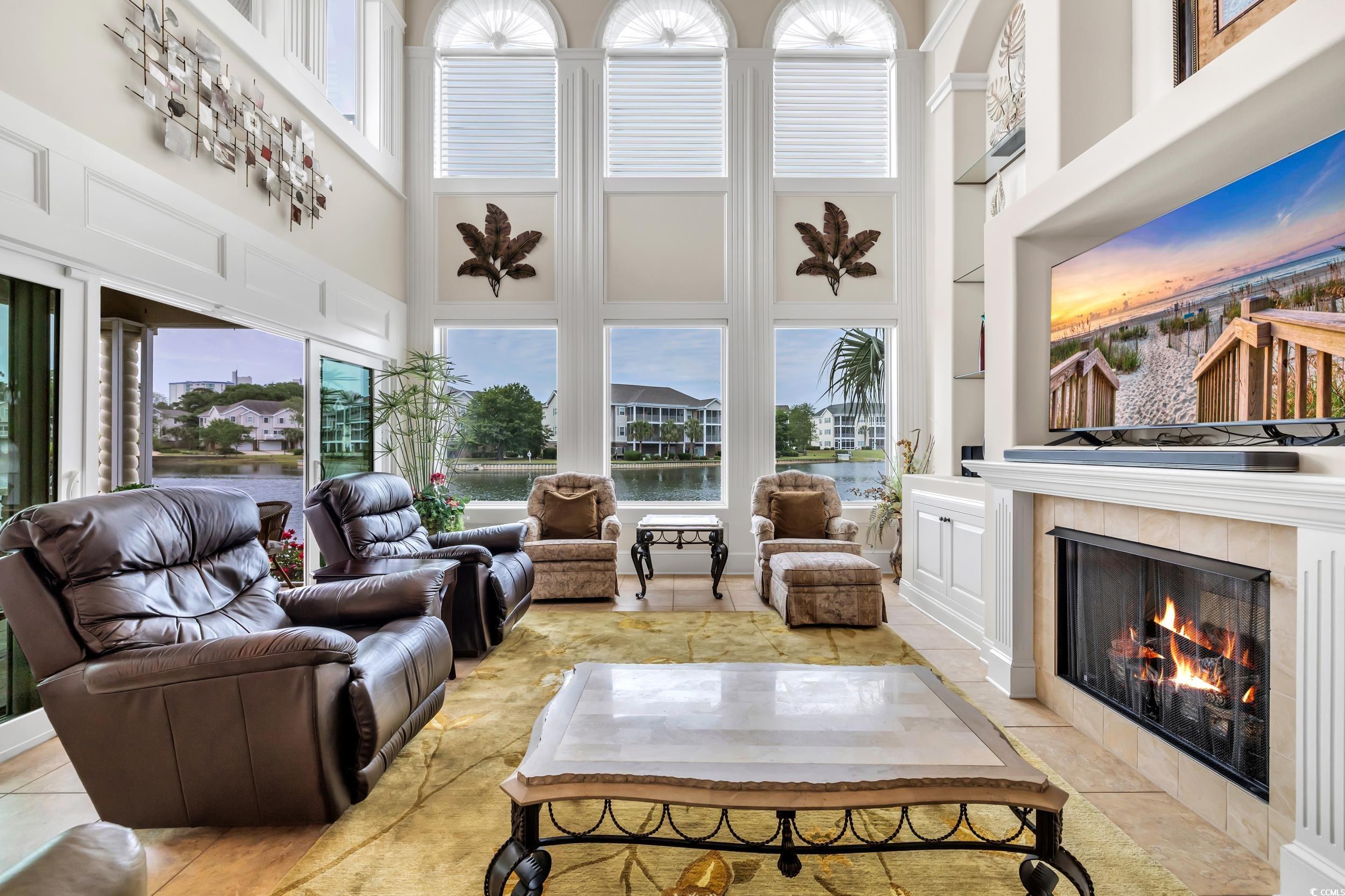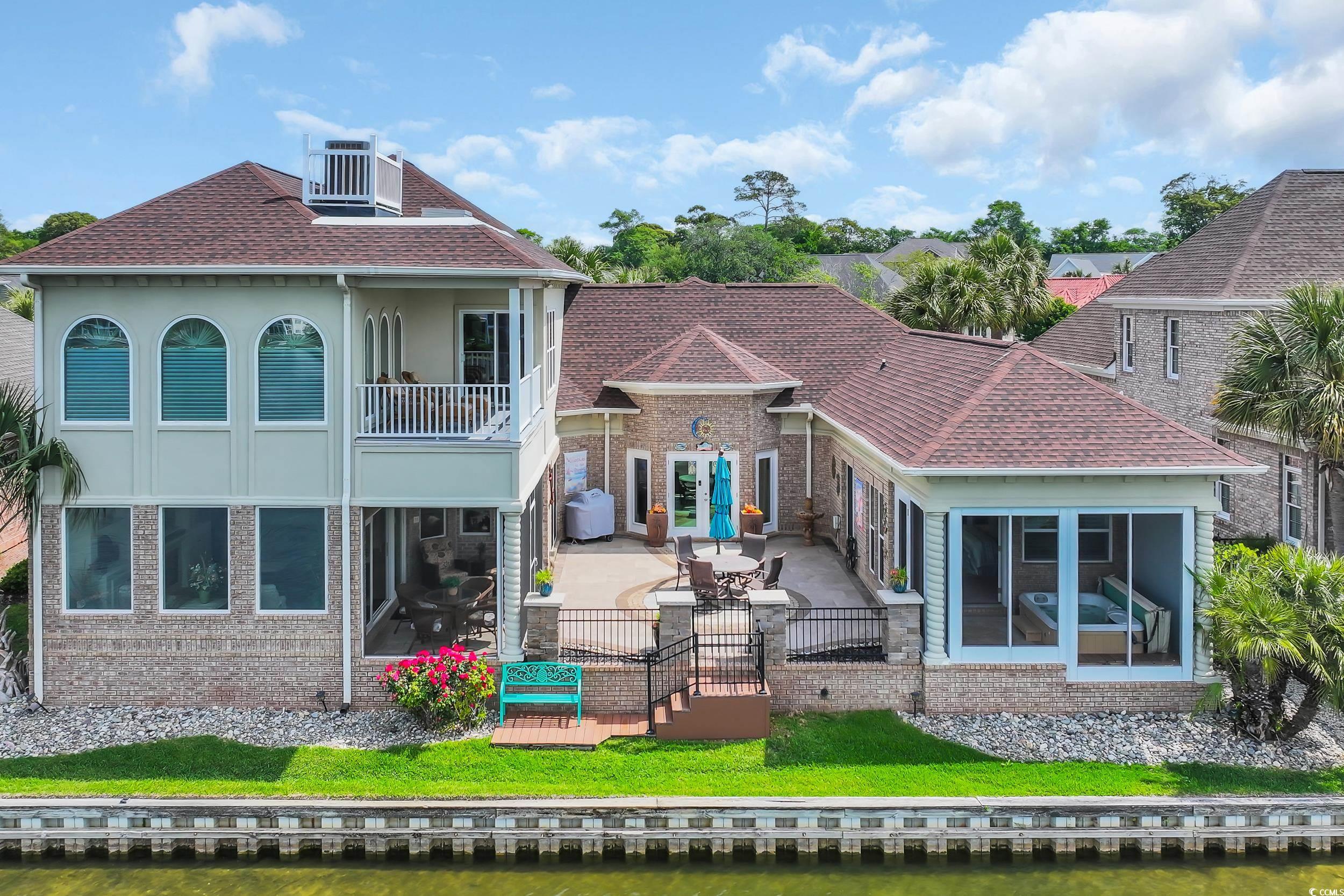 Discover the perfect blend of elegance and comfort in this stunning Mediterranean-style home, nestled on a lake in the premiere gated community of Seaside Plantation in North Myrtle Beach. Featuring meticulously landscaped gardens, palm trees and brick pavers, this stately waterfront residence creates a serene and inviting atmosphere. As you step into the grand foyer, you are greeted with architecture and elegance. The primary suite with its own private wing, includes a luxurious bathroom, custom walk in closet and enclosed spa retreat overlooking the water. The main level is spacious and includes an additional bedroom with en-suite and a dedicated office. The gourmet kitchen is a chef's delight, featuring updated quartzite counter tops and modern appliances, ideal for cooking and entertaining. A seamless flow carries you through the dining area and living room with soaring cathedral ceilings, gas fireplace and floor-to-ceiling windows that flood the home with natural light and spectacular water views. The second-floor features two bedrooms, a full bathroom and additional living space complete with a wet bar. The inviting second floor balcony provides an ideal retreat for guests seeking privacy and relaxation. For outdoor living, enjoy the screened porch retreat or step out to the private courtyard oasis that offers tranquility, making it ideal spot for entertaining or alfresco dining. This harmonious blend of indoor and outdoor living spaces ensures you can enjoy the serene surroundings year-round. Seaside Plantation is a premiere neighborhood that offers gated luxury living with amenities including a community center, swimming pool, heated spa and more. With just a short walk or golf cart ride to the beach, you're also minutes from local dining, shopping, golf and entertainment. Don't miss out on the opportunity to own this stunning coastal home. Call today to schedule your private showing!