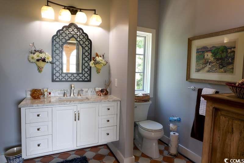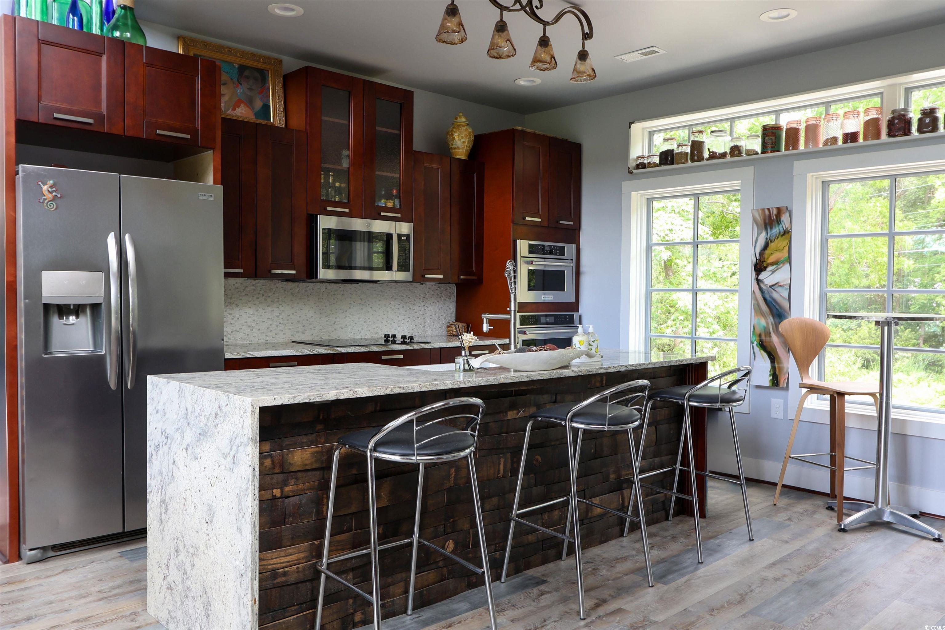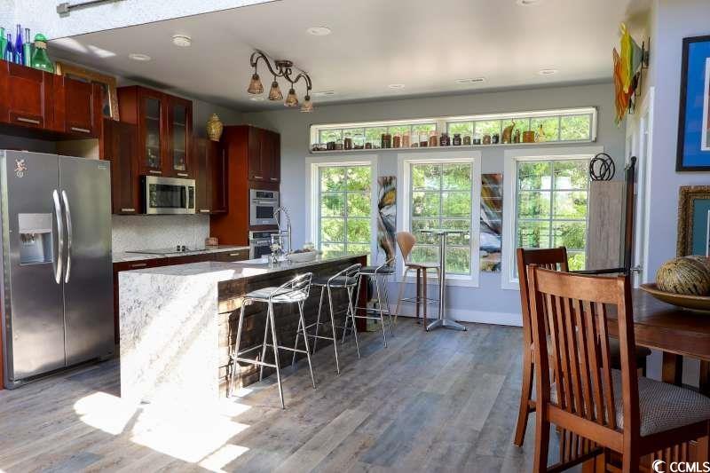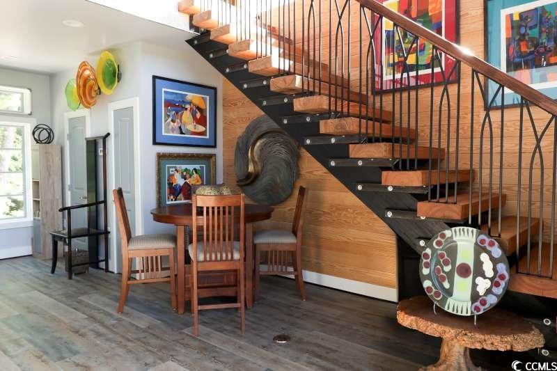 Endless water views await you where Coastal Elegance Meets Superior Craftsmanship - Stunning 3 Bed, 2.5 Bath Raised Beach Home with no HOA! This beautifully designed 3-bedroom, 2.5-bath raised coastal home offers a perfect blend of luxury finishes, storm-ready construction, and timeless characterall just moments from downtown Georgetown. Step inside to discover waterfall granite countertops, Mohawk waterproof luxury vinyl flooring, and all-wood cabinetry with soft-close drawer bases, with top-of-the-line KitchenAid appliances (stove, microwave, dishwasher, oven) and a striking oak bourbon barrel-accented island. Flooded with natural light, the home features four 8-foot arched windows in the living room and two 5-foot arched in the master bedroom, complemented by French double doors leading to the porchideal for seamless indoor-outdoor living. The living room and bathroom showcase 6 pine tongue-and-groove detailing for added warmth and charm. The custom-engineered floating staircase, crafted with 4-inch thick cypress treads, antique newel posts, and iron balusters, is a centerpiece of the homes design. The luxurious master bath is a sanctuary, boasting an oversized glass block shower with a soaker tub, protected by a premium Schluter system. Washer/dryer hookups are conveniently located on both levels. This home was built for resilience with Kolbe Missile 4 Rated hurricane windows and doors, a steel roof, concrete composite siding, and concrete block garage flooring. Relax on the composite decking porch with aluminum pipe railings, rinse off in the outdoor shower, and enjoy the professionally landscaped Bermuda sod backyard with paver walkways. Additional highlights include: 12-foot transom with custom artist-painted pediment Dual HVAC units Gas tankless water heater Cheyenne Shaker plank interior doors Fiberglass pallets under the deck for durability This home delivers both beauty and brawn, designed to impress and built to last. Dont miss your chance to own a one-of-a-kind raised beach home where quality and coastal lifestyle meet. Close distance to Georgetown's famous dining, shopping, live theatre entertainment, a few full serviced marinas, and the scenic Harborwalk. Short drive to Mount Pleasant and Charleston. Additional lot next door is for sale as well. Call your realtor for a private showing today.