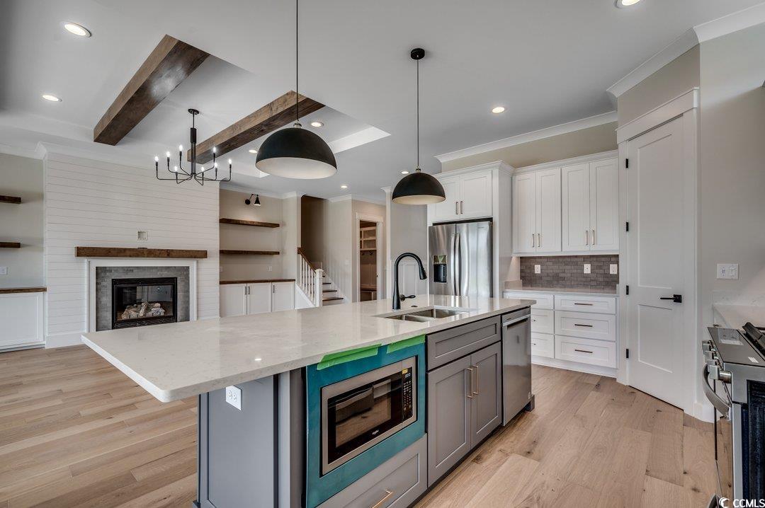 New Construction Home with Luxury Finishes will be located in the prestigious gated community of Waterbridge. The lot is conveniently close to the amenities center and backs up to a wooded area. The listing pictures are from a similar home built by same custom builder. This upcoming 5-bedroom, 4.1-bath custom home will combine quality craftsmanship with upscale features throughout. Built by a reputable local builder with over three decades of experience, this home offers a bright open layout filled with natural light and stylish details. The great room is anchored by a fireplace and accented with a custom beamed ceiling. The kitchen will feature a walk-in pantry, island, stainless steel appliances, and quartz countertops. The main-level owner's suite includes a luxurious bath and spacious closet, while an additional downstairs bedroom offers flexibility for an office or gym. Upstairs includes a large bonus room, three more bedrooms, two full baths, and walk-in storage. Residents of Waterbridge enjoy access to a resort-style pool, clubhouse, fitness center, tennis, and boat storageall just minutes from the beach and local attractions. The seller is related to the listing broker and is a SC/NCLicensed real estate agent. All information is deemed accurate and correct but buyer is to verify.