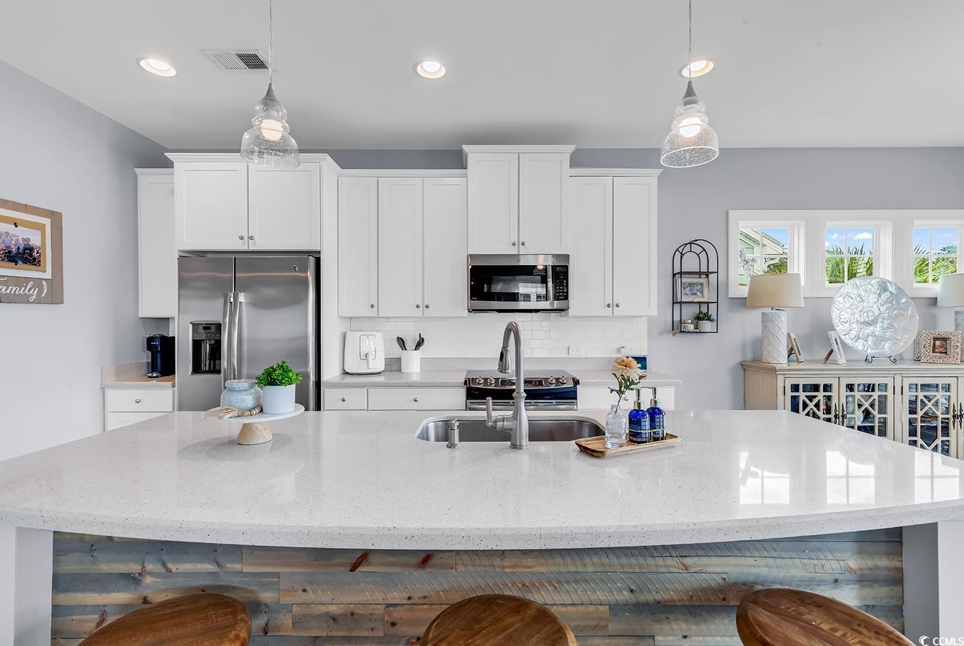 Welcome to Your Beach-Style Dream in Wilderness Pointe This beautiful split-level home in Wilderness Pointe at Prince Creek community combines coastal charm with modern living. The distinctive metal roof, Bahama shutters, and two-car garage create that sought-after raised beach house aesthetic we all love. Enter to discover a thoughtfully designed floor plan. Upstairs features an open concept living space with a spacious living room complete with a stylish tray ceiling and cozy gas fireplace, dining area, and kitchen. The kitchen showcases tall white shaker cabinetry, a large island with sleek countertops and stainless steel appliances. The upstairs primary bedroom offers a private oasis with its own bathroom featuring a tiled walk-in shower, a double vanity with custom ship lap accent wall, and a spacious walk-in closet. Downstairs, you'll find two additional bedrooms, a full bathroom, and a second living area perfect for movie nights or as a quiet retreat for guests. Both levels offer outdoor areas for enjoying those perfect South Carolina evenings, with access from each floor. The community amenities include two pools, pickleball, tennis, and trails. Located near shopping, dining, and just a quick ride to the beach, this immaculate home offers the ideal balance of comfort and coastal living in the prestigious St. James school district.