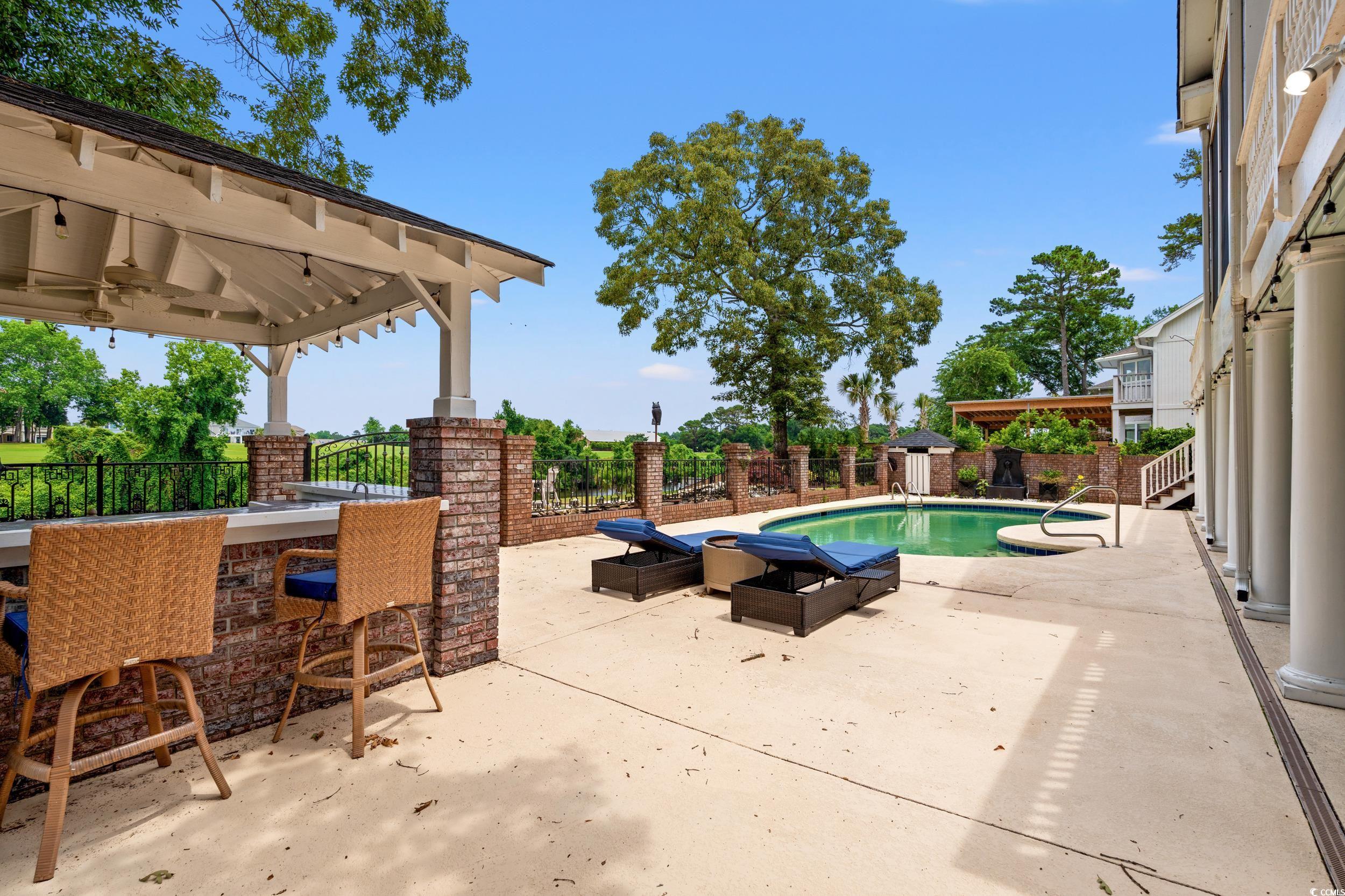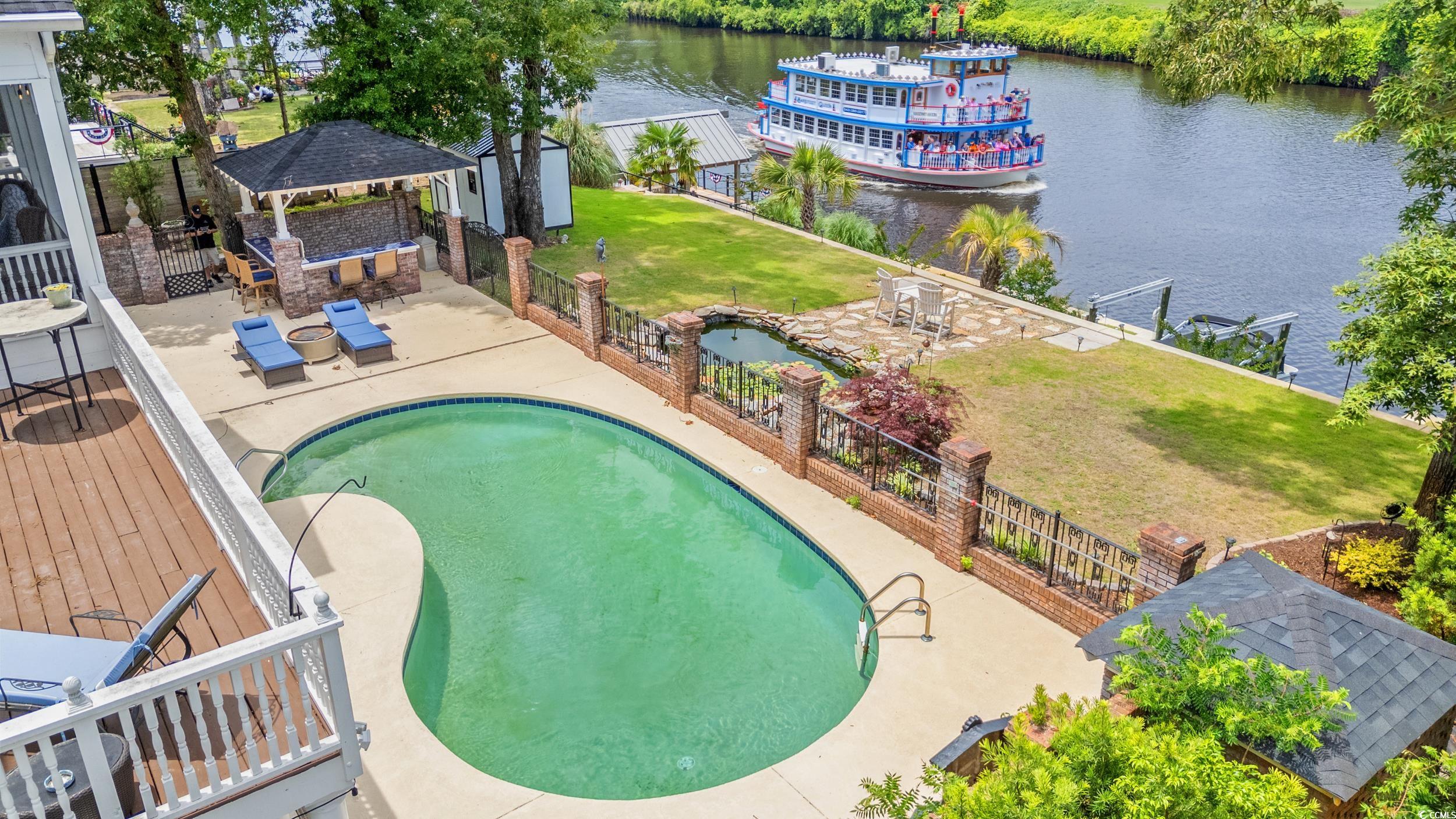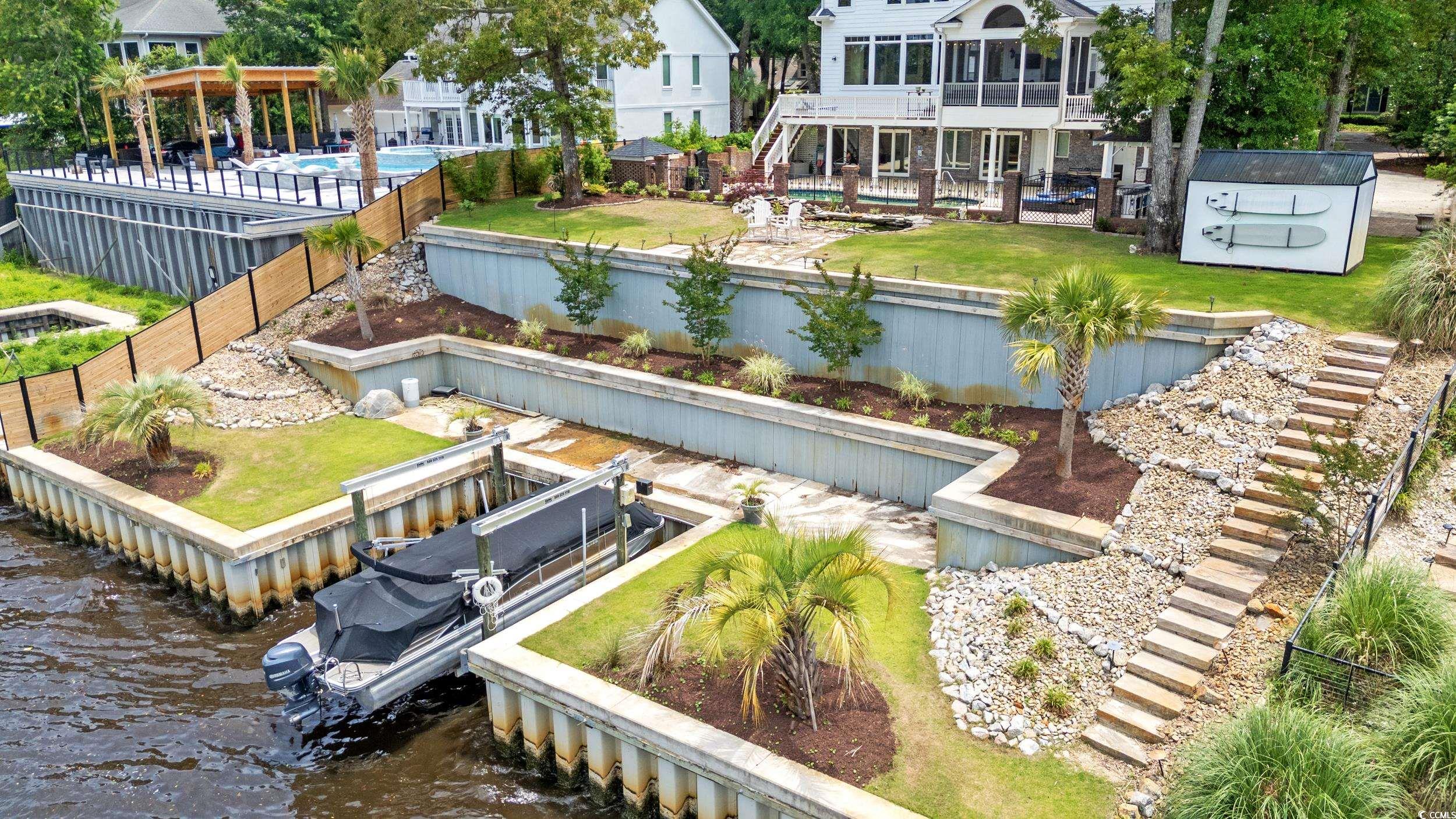 Nestled within the exclusive Forest community in Briarcliff, this Charleston southern-style home stands tall across three stories, boasting5 bedrooms, 4 full baths, and one half bath. Positioned conveniently on the Intracoastal Waterway between Myrtle Beach and North Myrtle Beach, this residence offers unparalleled privacy. As you approach, the distinctiveness of this property becomes evident. The circular entrance drive, adorned with brick and custom wrought iron railings, leads to the grand front entrance featuring large colonial Tuscan pillars. The first floor comprises 3 bedrooms, 2 full baths, a 3-car garage, and a wine cellar, creating a welcoming and functional space. The second level impresses with high ceilings and a parlor complete with a fireplace. The upgraded kitchen is a chef's dream, featuring a stainless Sub-Zero refrigerator, Viking professional cooktop, 2 Bosch dishwashers, and granite countertops. The open family room and dining room offer captivating window wall views of the Intracoastal Waterway. A screened-in porch and deck off the kitchen make it the perfect spot for entertaining family and friends. Ascending to the third floor, a balcony overlooks the foyer, adorned with iron railings. Two bedrooms on this level include a guest bedroom with a full bath and stunning waterway views. The primary suite is a luxurious retreat, featuring French doors, a ceiling fan, breathtaking waterway views, an extra-large bathroom with granite floors, and his and her closets with built-in vanities boasting brass sinks. Don't miss the amazing backyard complete with a newly resurfaced sparkling pool including new pool heater, gazebo with built-in kitchen and Koi Pond, surely an entertainer's dream! Notably, the property has been shored up by a brand new bulkhead and the owners have added a dock with an electric boat lift making this the perfect property for those seeking a waterfront lifestyle. The upgrades do not stop here. The owner has installed a whole house Generac generator, new hardwood floors upstairs, new windows in the den, a well irrigation system, landscape lighting system, two new garage door systems, and a garage HVAC unit. This turnkey home is ready for immediate occupancy. If you desire a property on the waterway that exudes charm and luxury, your search ends here!