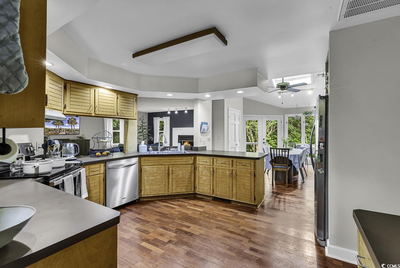 Charming All-Brick Home Just Blocks from Historic Downtown Conway! Welcome to this spacious and inviting 4-bedroom, 3-bathroom all-brick home located just minutes from the heart of historic downtown Conway and Coastal Carolina University with no HOA! Spanning approximately 2,695 square feet, this home offers a flexible layout with an office area and a second den, perfect for work, hobbies, or additional living space. Step inside to find a welcoming foyer with tile flooring, while the kitchen impresses with hardwood floors, recessed lighting, stainless steel appliances, and a skylight that fills the adjacent dining area with natural light. The French doors lead you into a cozy living room complete with a fireplace and a wet bar ideal for entertaining. The master suite features a spacious walk-in closet with a built-in organizer, and a private bath with dual vanities, a soaking tub, and a separate shower. One of the secondary bedrooms has its own full bathroom, offering added privacy for guests or family. Enjoy relaxing on the front porch or hosting gatherings on the back deck, with gutters installed around the deck area and a fenced-in backyard perfect for pets or outdoor enjoyment. Other notable features include a metal roof and a new HVAC system installed in 2021 for year-round comfort. Located just blocks from Conways lively downtown shops, restaurants, and Riverwalk, this home blends charm, space, and convenience all with no HOA restrictions. Dont miss the opportunity to make this one yours!