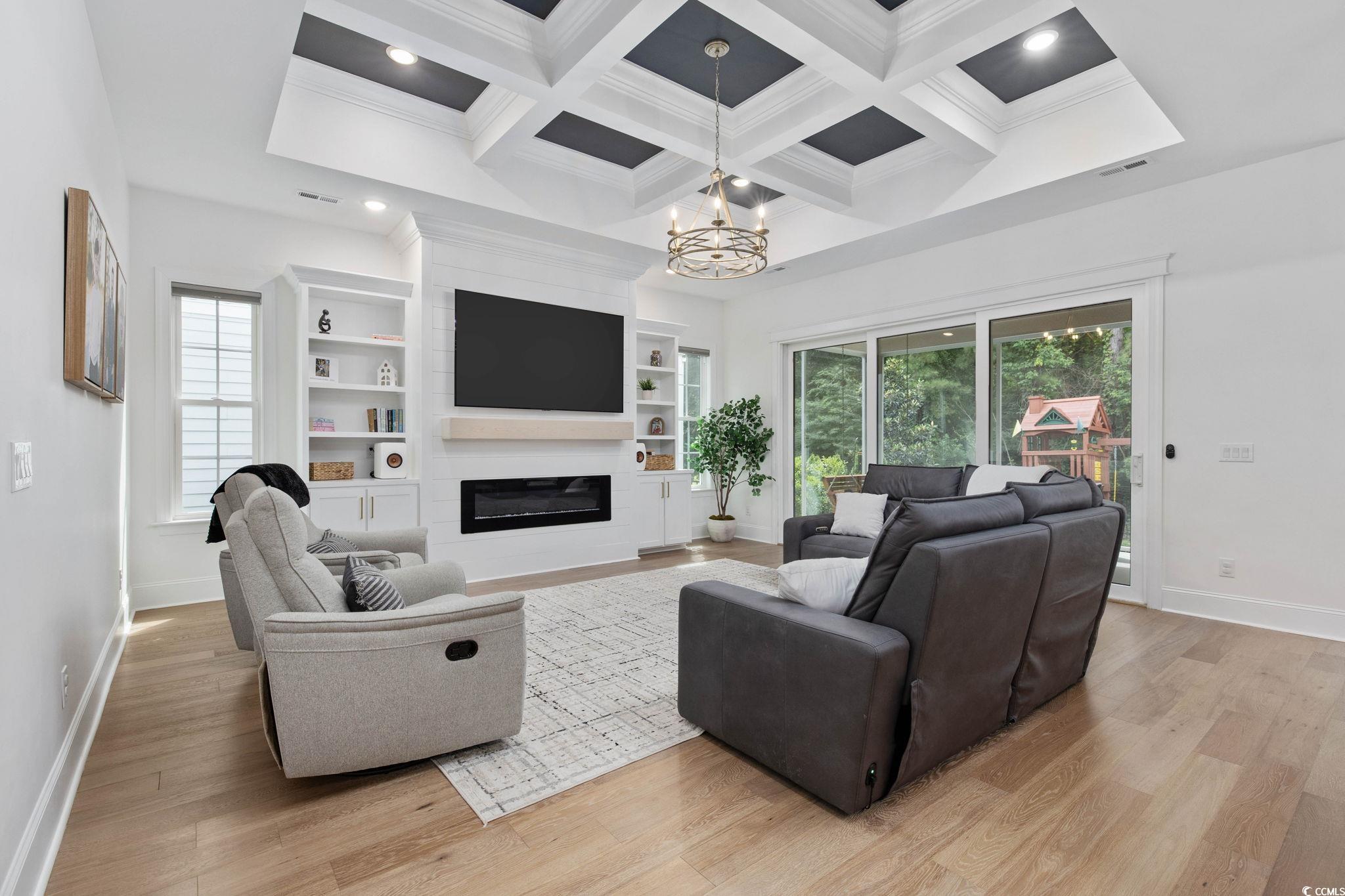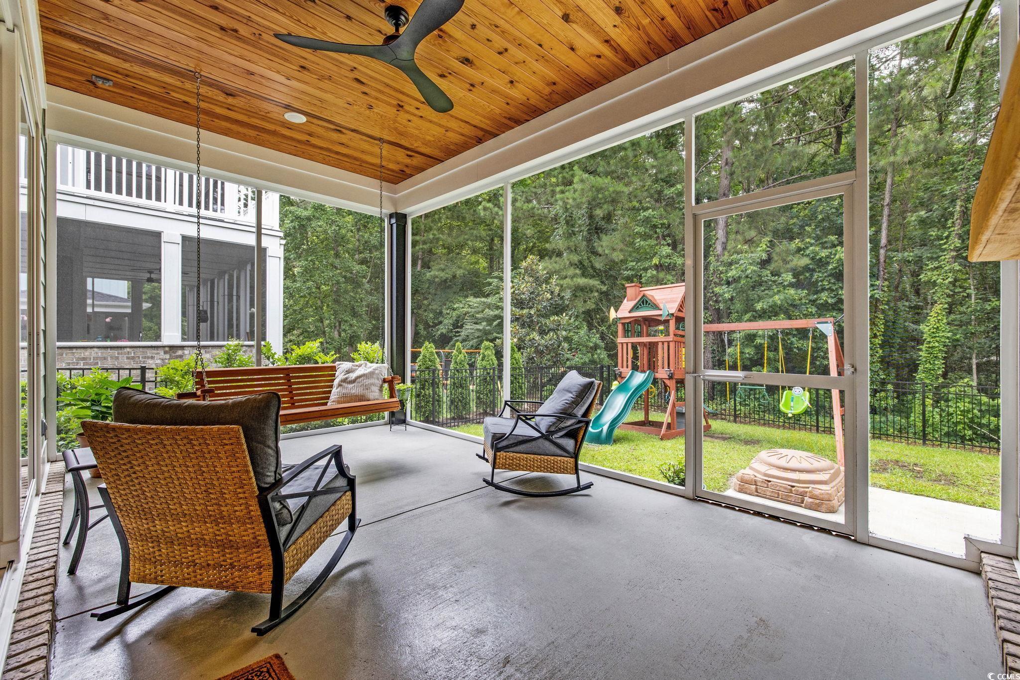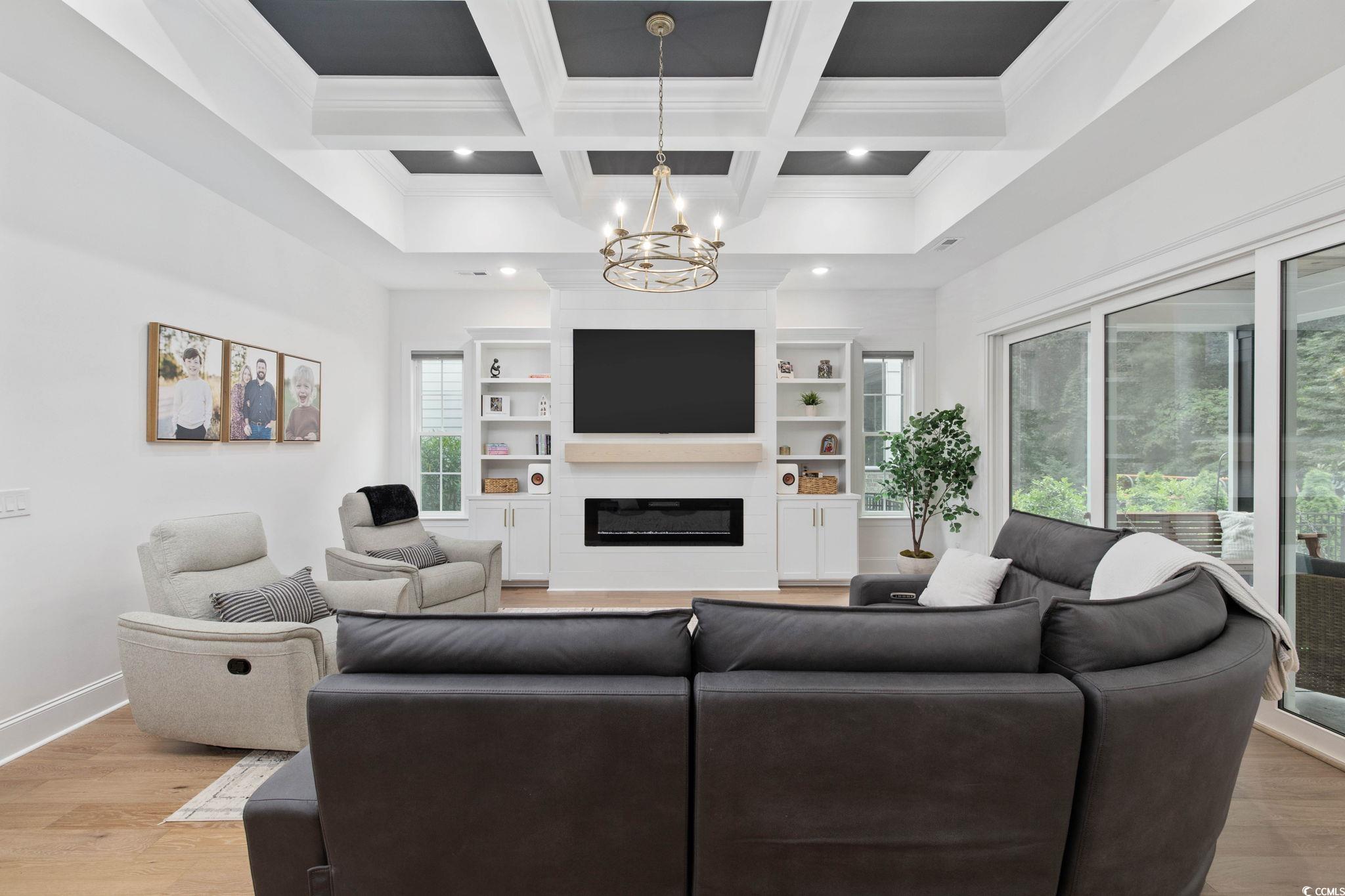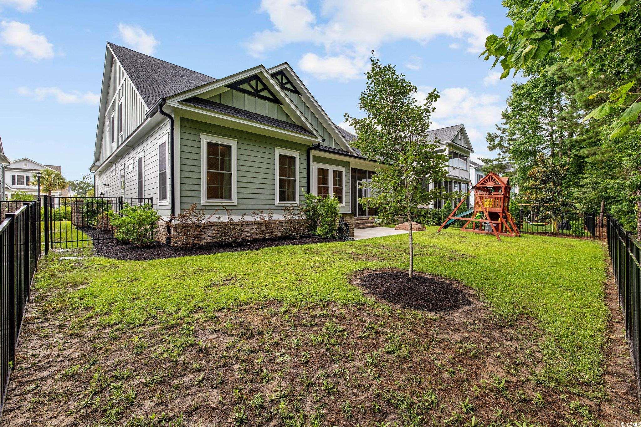 Introducing one of Myrtle Beachs most exquisite custom homes, perfectly positioned in the exclusive gated community of Waterway Palms Plantation. From the moment you step inside you'll see that this residence is a true Coastal masterpiece, offering nearly 3,700 heated square feet of meticulously designed living space, including 6 bedrooms, 4 bathrooms, and many quality upgrades. The beautifully landscaped exterior and classic Southern front porch, adorned with tapered columns and a wooden accent ceiling, set an inviting tone. As you enter, you'll find the foyer illuminated by statement lighting with a contemporary flair. The open concept living room impresses with a coffered ceiling, built-in bookshelves, a fireplace, and three sliding glass doors that open to the screened back porch. Stepping outside you'll be able to relax in a porch swing and have views of a fully fenced backyard. The chefs kitchen is a true culinary haven. It features ceiling-height custom cabinetry, a wood-accented tray ceiling, and a stylish tile backsplash. A quartz island, gas range, farmhouse sink, stainless steel appliances, and a spacious walk-in pantry with upper and lower storage complete the space. The formal dining room, with its large windows and tray ceiling, is perfect for elegant gatherings. The first-floor owners suite is a luxurious retreat, featuring a wooden accent wall, tray ceiling, a spa-like ensuite with a custom shower, soaking tub, dual vanities, and a massive walk-in closet complete with custom shelving and a center. Also on the main level: a second bedroom and full bath with tile floors and glass shower doors, a sitting room with wainscoting and chandelier, a laundry room with sink and cabinetry, and a custom mudroom with boot storage and coat hooks. Upstairs features three additional bedrooms, each with access to bathrooms featuring dual vanities, a large bonus room, and ample walk-in attic storage. Throughout the home, youll find durable and stylish luxury vinyl plank flooring. An attached two-car garage completes the home, while community amenities include a resort-style pool, clubhouse, pickleball court, tennis courts, playground, dry dock storage, and boat launch along the Intracoastal Waterway. This extraordinary home offers luxury, functionality, and communityeverything youve been searching for in the heart of Myrtle Beach.