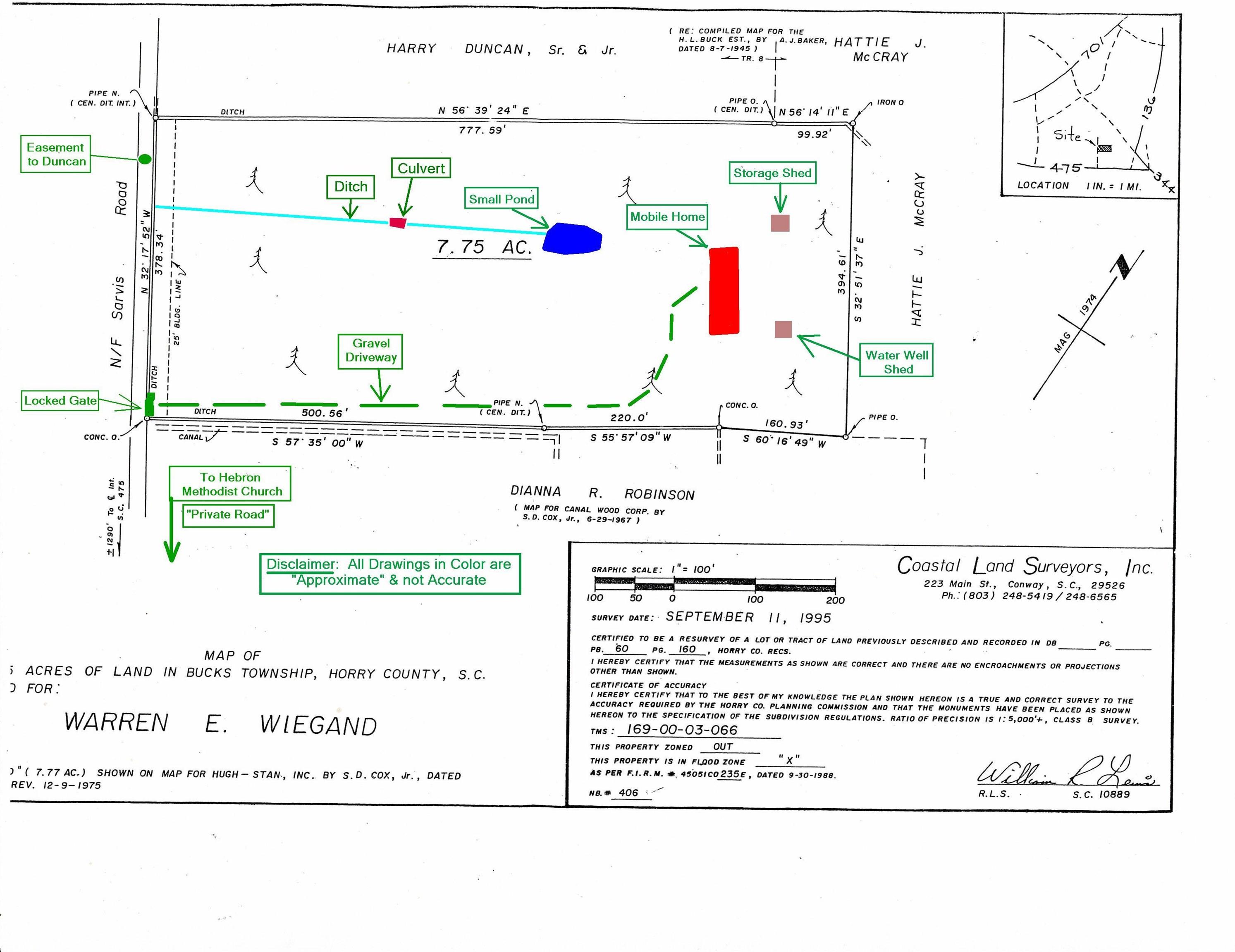 From the intersection of US Highway #701 South and Old Bucksville Road, turn onto Old Bucksville Road and drive South for 2.25 miles to Bucksville Drive. Travel Southwest for 4 tenths of a mile and turn right onto Hebron Drive . Travel 2 tenths of a mile Northwest to the locked gate.Courtesy of Wiegand Real Estate, Inc.