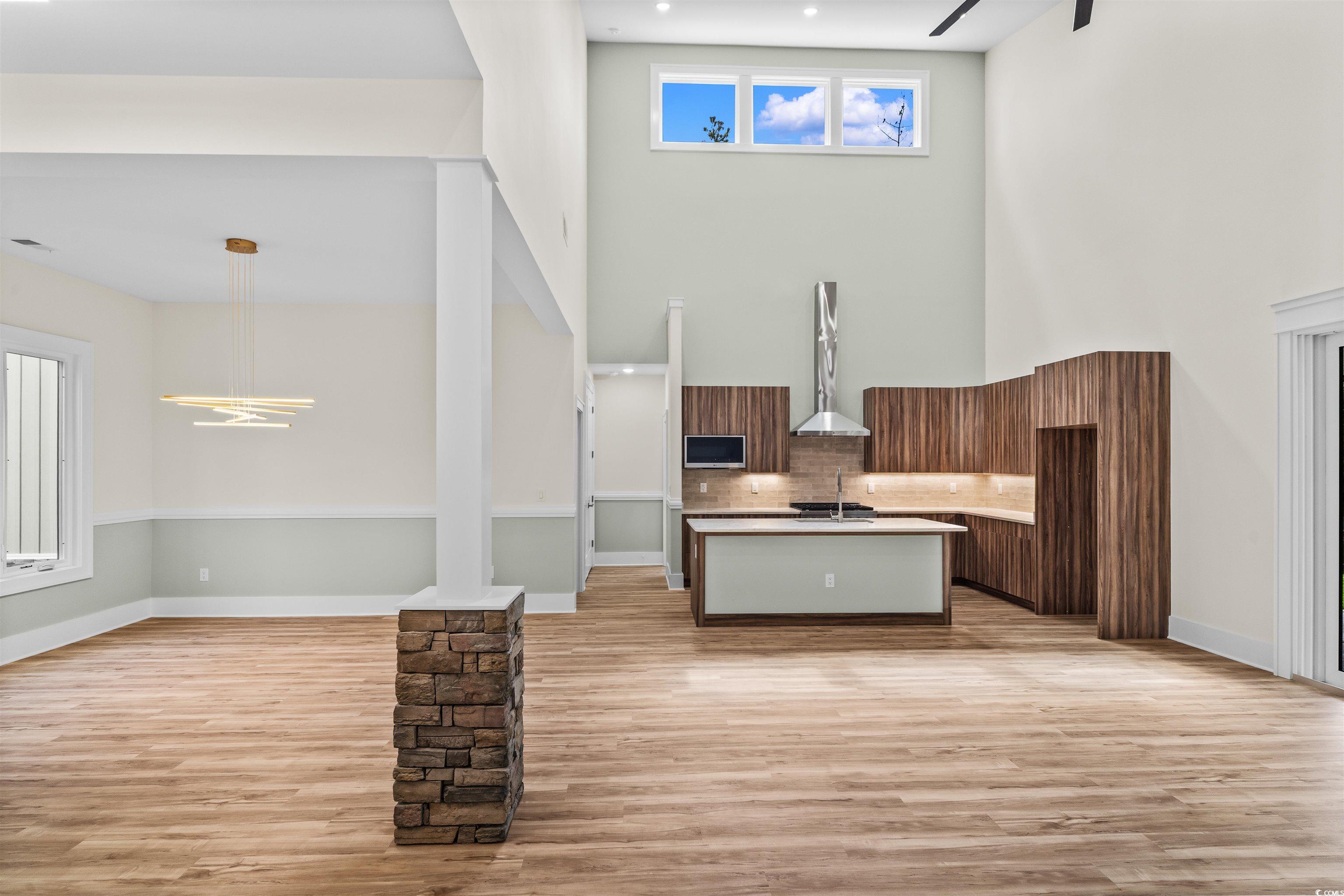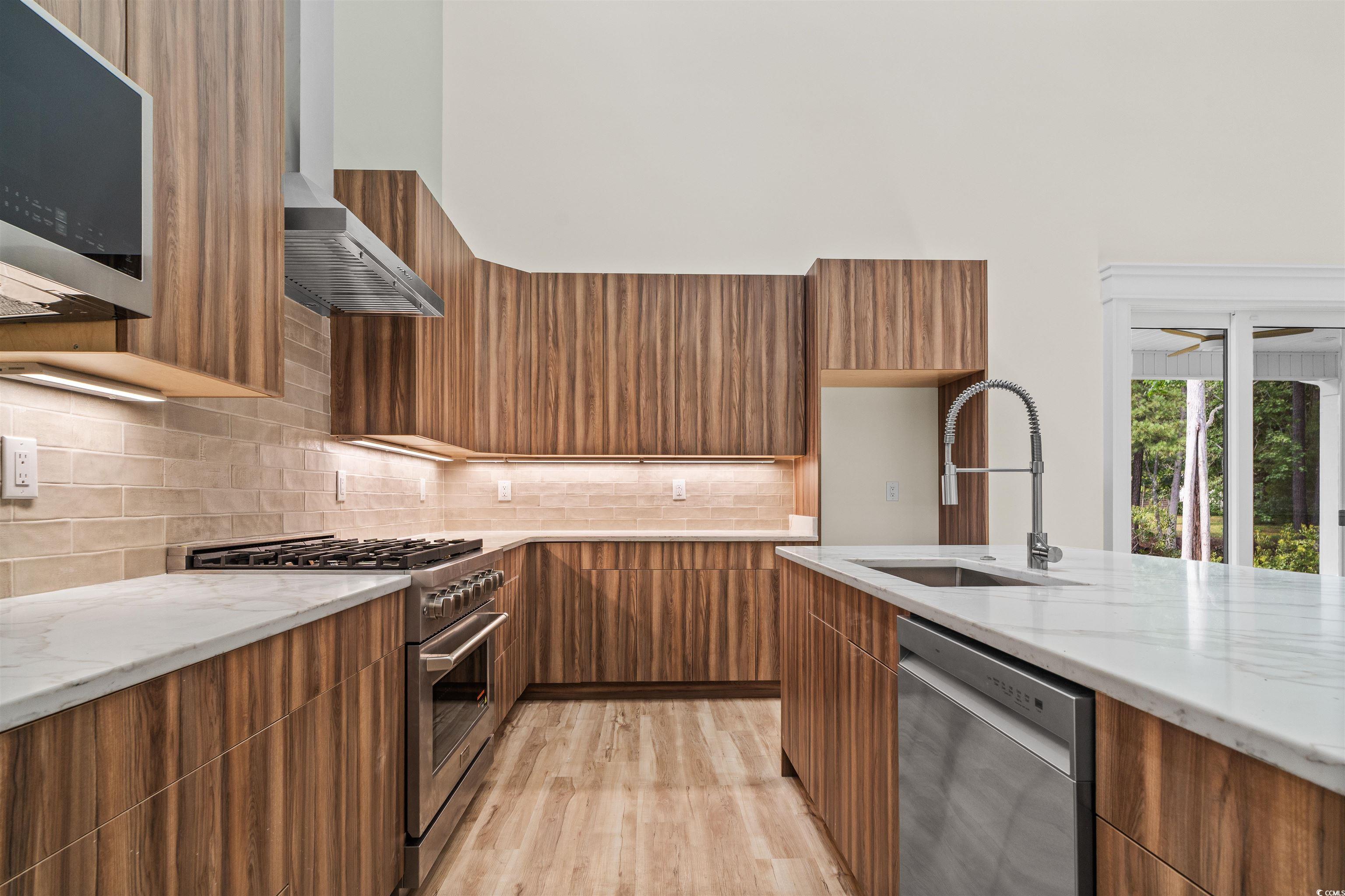 Welcome to this truly custom home, where Frank Lloyd Wright inspiration meets timeless Italian elegance. From the striking rooflines to the stone entryway framed by graceful Italian Cypress trees, every element has been thoughtfully designed. Four-panel sliding doors open to a 300 sq. ft. covered patio with grand columns, offering serene views of a wraparound lake. Inside, the artistry continues with a dramatic floor-to-ceiling fireplace and handcrafted chair rails, window trim, and door casings. The gourmet kitchen is a chefs dream, boasting a ZLINE six-burner gas range with designer hood and vent, imported Italian quartz countertops, a textured stone-style backsplash, and sleek European cabinetry. Eight-foot closet and pantry doors complement the elevated ceilings, while carefully selected faucets and lighting fixtures add a touch of luxury throughout. The master suite is a peaceful retreat, filled with natural light from the modern roofline and expansive windows that showcase the lake and fountain. The spa-like master bath features an extensively tiled shower with a custom glass door, Italian quartz finishes, and dual walk-in closets. The secondary bathroom mirrors the elegance with upscale finishes and custom tilework. Step outside to an oversized garage, extended driveway, and a spacious wraparound lotideal for an RV, boat, additional garage, or garden. Located just three miles from Coastal Carolina University and only ten minutes from a public boat ramp accessing the Intracoastal Waterway and Waccamaw River. Just 200 yards away, enjoy over 2,000 acres of protected South Carolina U.S. Fish and Wildlife Preserve. All thats missing is you.