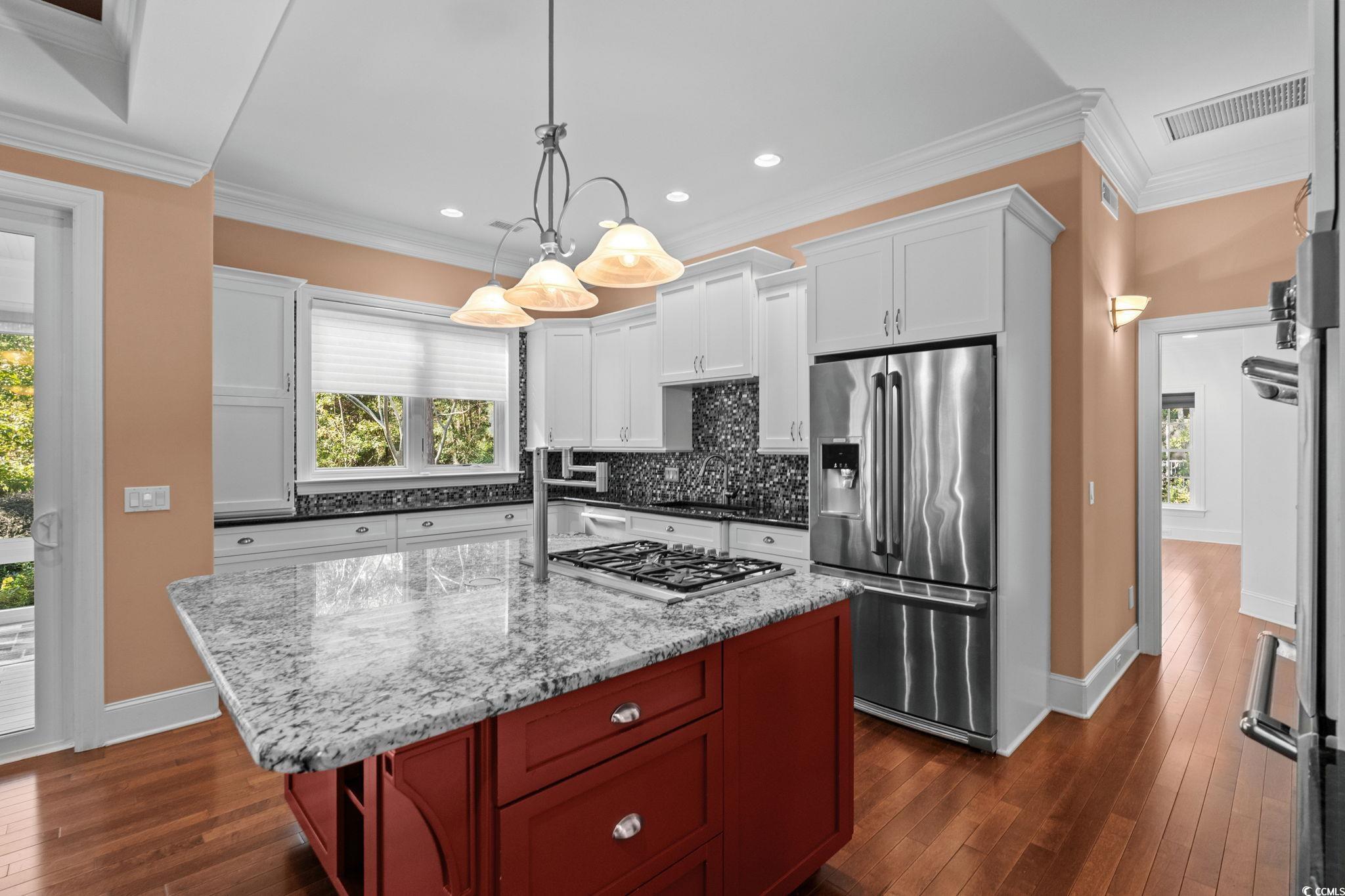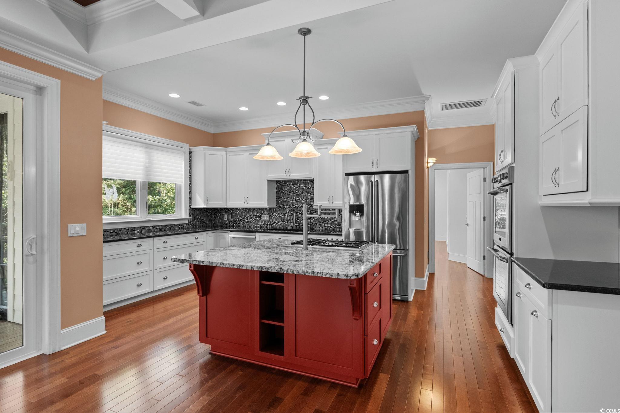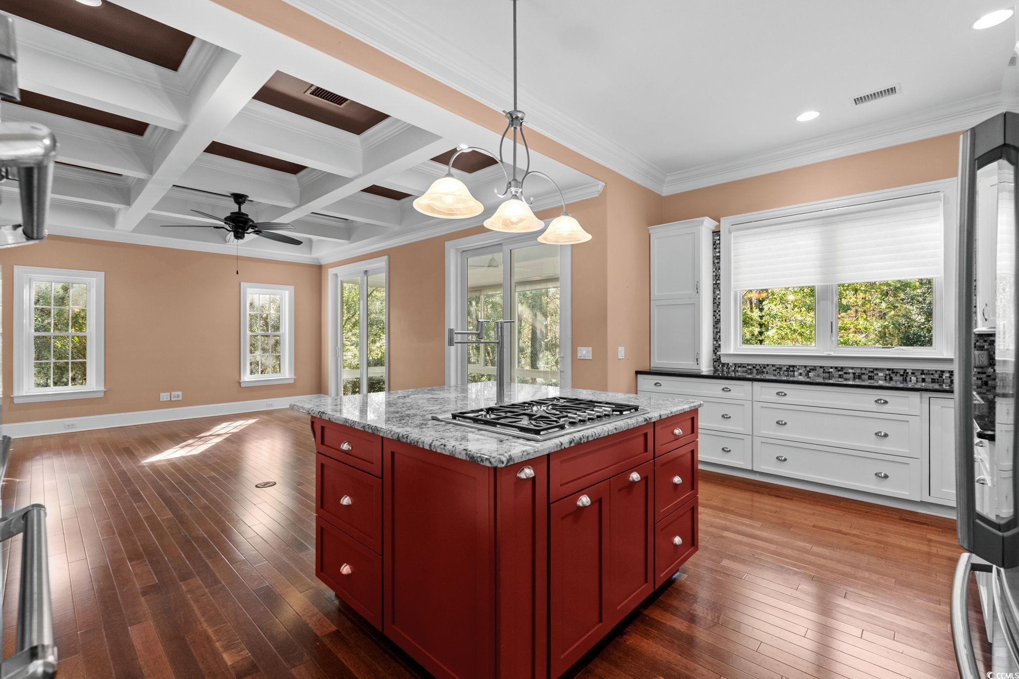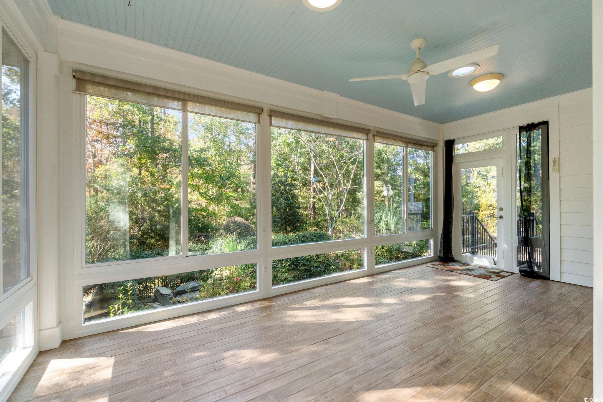 Set on a beautiful homesite in the sought-after Collins Creek Landing community, this 4-bedroom, 3.5-bath home blends thoughtful design with an elevated, modern-coastal feel. Wide hallways, spacious rooms, and intentional details make everyday living feel effortless. From impact-resistant windows to the hybrid HVAC with multiple zones, this home was built with longevity and comfort in mind. The kitchen is a standoutlayered in texture and contrast with custom cabinetry, granite counters, a walk-in pantry, and high-end Thermador appliances. It's the kind of space that looks as good as it performs. The open family room features a coffered ceiling and flows into a 3-season sunroom where mornings hit different. Enjoy quiet views of the protected natural backdrop and a fenced yard finished with a paver patio and manicured Zoysia lawn. The primary suite offers privacy and calm, complete with custom closet systems and its own climate control. All baths feature upscale finishes with generous counter space and tilework. A mud room with built-in shelving keeps daily life organized, and the oversized garage includes a 50 amp/220V outlet ready for EV charging. Collins Creek Landing offers resort-style amenities including pool, clubhouse, nature trails, basketball courts, a community boat launch, and day dock access to the Waccamaw River. The home itself offers balancestyle and substance, comfort and quality, all within one of Murrells Inlets most desirable gated enclaves. Arrange a tour today - don't delay!