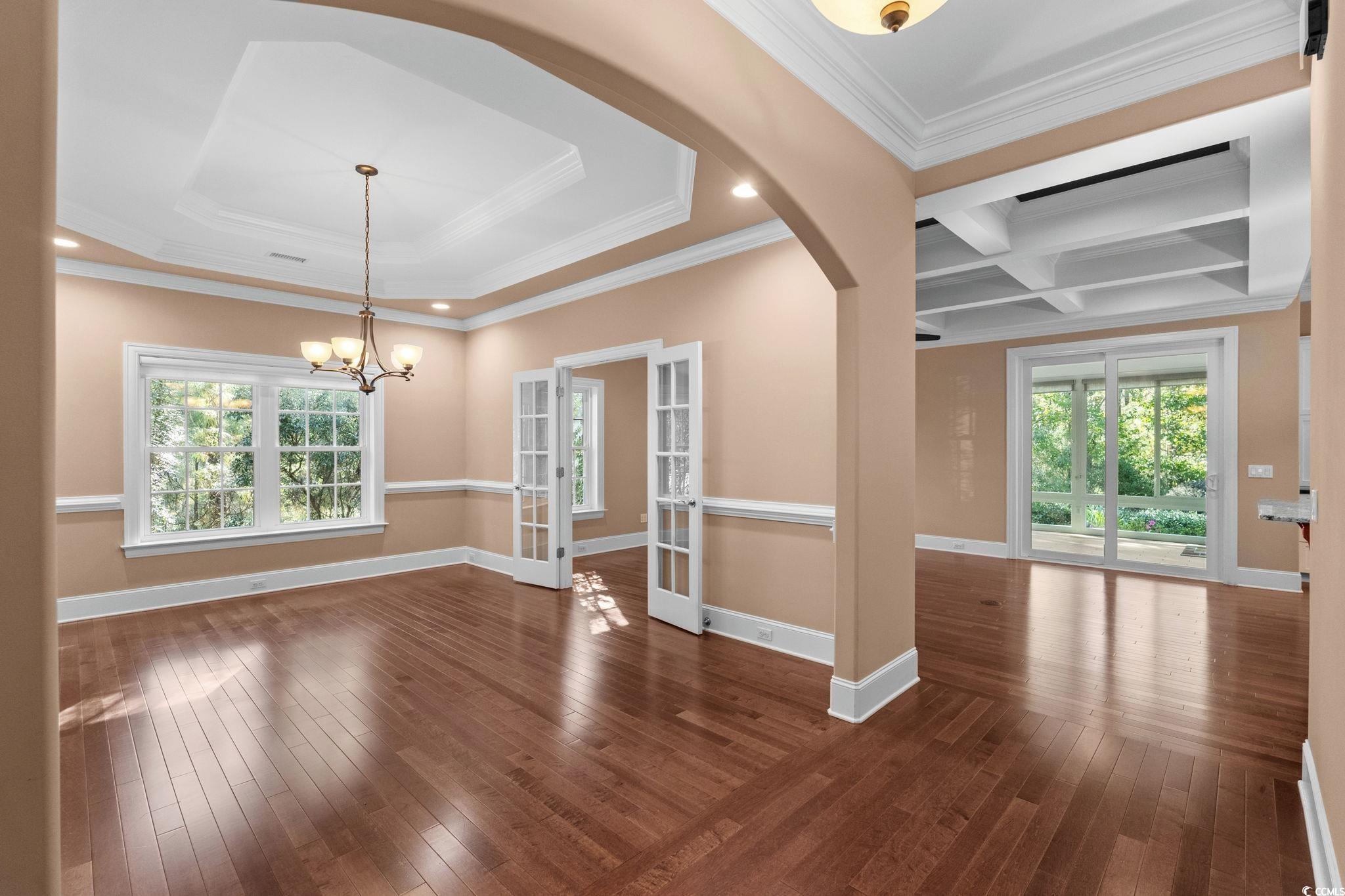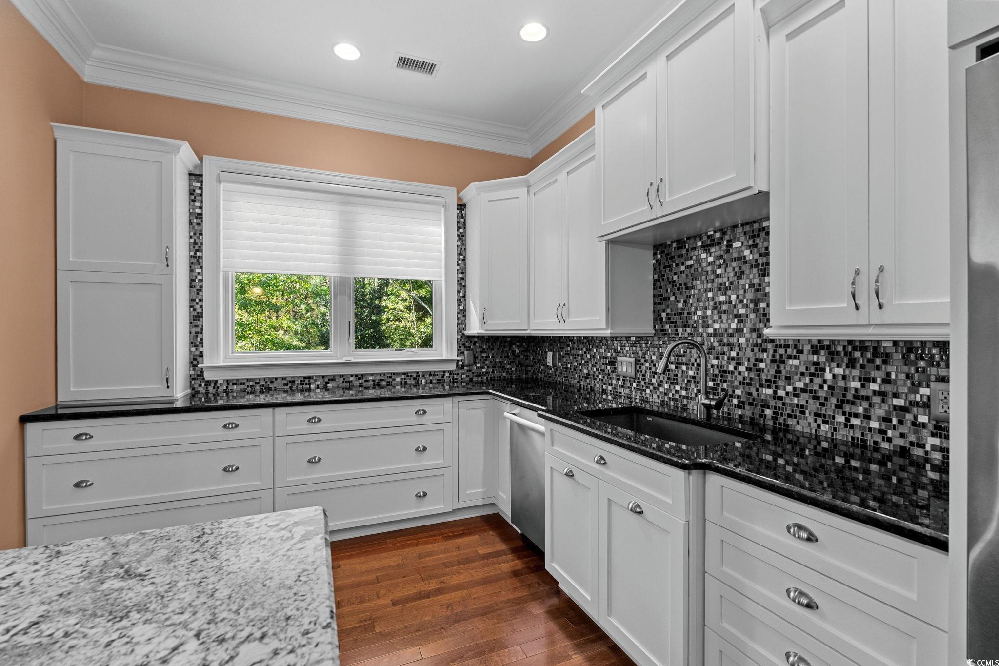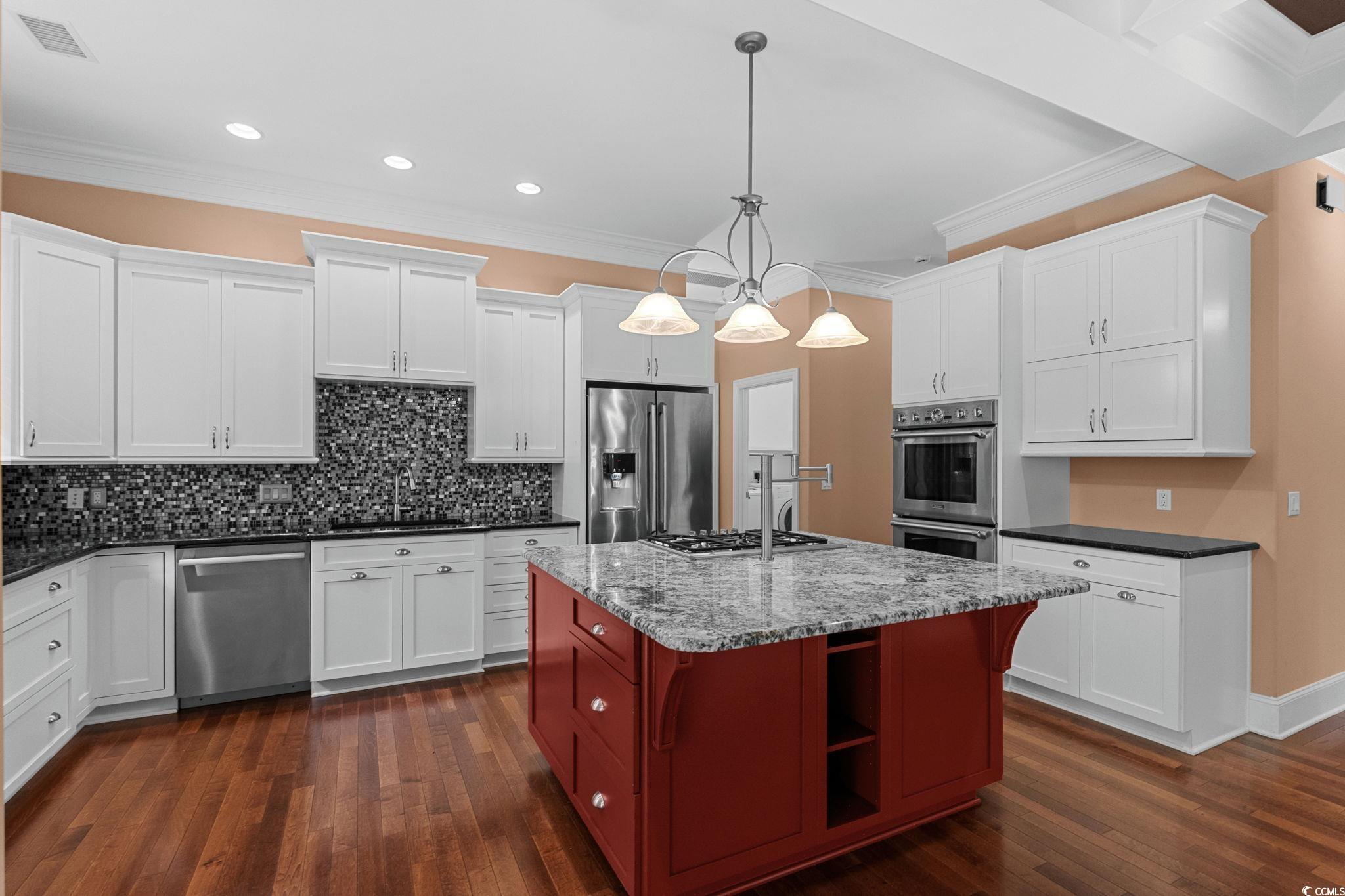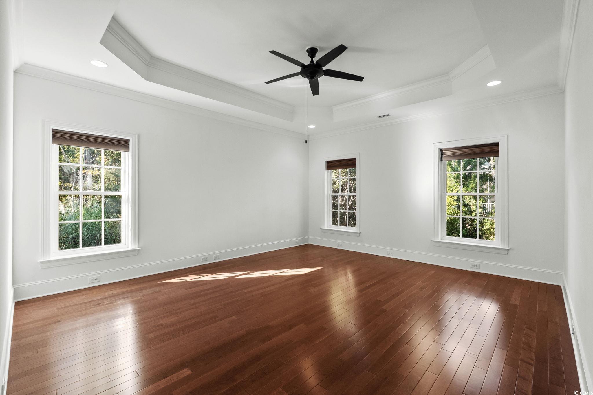 Set on a beautiful homesite in the sought-after Collins Creek Landing community, this 4-bedroom, 3.5-bath home blends thoughtful design with an elevated, modern-coastal feel. Wide hallways, spacious rooms, and intentional details make everyday living feel effortless. From impact-resistant windows to the hybrid HVAC with multiple zones, this home was built with longevity and comfort in mind. The kitchen is a standoutlayered in texture and contrast with custom cabinetry, granite counters, a walk-in pantry, and high-end Thermador appliances. It's the kind of space that looks as good as it performs. The open family room features a coffered ceiling and flows into a 3-season sunroom where mornings hit different. Enjoy quiet views of the protected natural backdrop and a fenced yard finished with a paver patio and manicured Zoysia lawn. The primary suite offers privacy and calm, complete with custom closet systems and its own climate control. All baths feature upscale finishes with generous counter space and tilework. A mud room with built-in shelving keeps daily life organized, and the oversized garage includes a 50 amp/220V outlet ready for EV charging. Collins Creek Landing offers resort-style amenities including pool, clubhouse, nature trails, basketball courts, a community boat launch, and day dock access to the Waccamaw River. The home itself offers balancestyle and substance, comfort and quality, all within one of Murrells Inlets most desirable gated enclaves. Arrange a tour today - don't delay!
