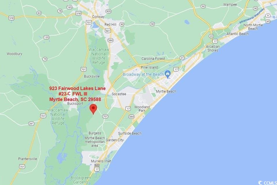From Highway 707 turn west onto Bay Road at the traffic light. Turn left onto Freewoods Road. Turn right onto Sunnehanna Drive to enter Island Green. Continue on Sunnehanna to the end of the road (GPS address 601 Sunnehanna Drive). Turn left following the signs to ""Fairwood Lakes III"". Loop around the lake to Building 923 which is on the left side. Unit C is on the top floor end unit on the left side of the building. 923 Fairwood Lakes Lane #23-C MBSC 29588. GPS Coordinates: 33.643190, -79.059684Courtesy of Re/max Southern Shores Gc - Cell: 843-450-8760